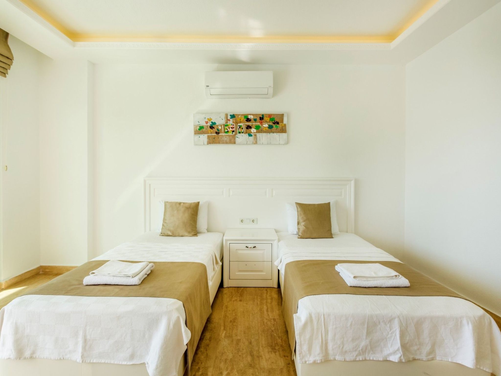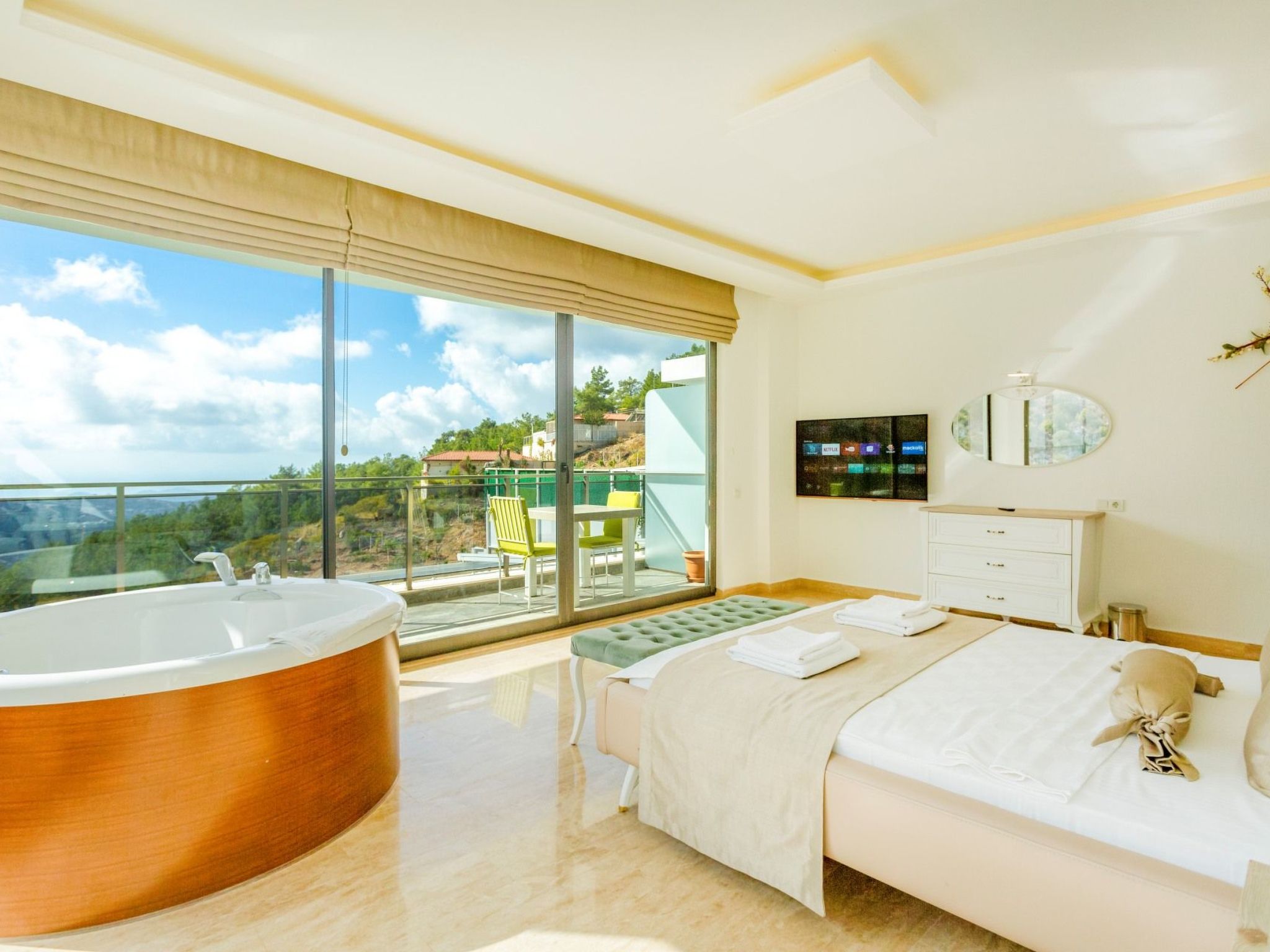 Schlafzimmer1. Schlafzimmer: Doppelbett für einen Familienanzug, Klimaanlage, Kleiderschrank, Balkon, LED-TV, Whirlpool2. Schlafzimmer: Jugendzimmer, zwei Einzelbetten, Klimaanlage, Bad, Kleiderschrank, Balkon, LED-Fernseher, Whirlpool sind vorhanden. Badetuch, Handtuch und Strandtuch sind in jeder Villa vorhanden. Handtücher werden im Voraus vorbereitet und sind in den Zimmern inbegriffen. Bügeleisen, Bügelbrett, Haartrockner, Teekanne, Grill/Holzkohlebrenner sind in jeder Villa vorhanden. Halle Halle mit Meer- und Naturlandschaft, Sitzgruppe, Esstisch für sechs Personen, Satellitenempfänger und Fernseher (LED) und Klimaanlage sind vorhanden. KücheDie amerikanische Küche ist groß, geräumig und modern gestaltet und verfügt über einen Kühlschrank, einen Geschirrspüler, eine Waschmaschine, einen Herd, einen Quartettofen (eingebaut), einen Mikrowellenherd, einen elektrischen Wasserkocher (Wasserkocher), eine Pfanne, einen Topf usw. sowie Küchengeräte und Geschirr für sechs Personen vorhanden.Pool und Garten Große Liegewiese mit privatem Pool und Garten stehen in jeder Villa zur Verfügung. Es stehen 6 Sonnenliegen und Sonnenschirme, ein Esstisch für sechs Personen, eine Sitzgruppe und ein Grill zur Verfügung. Die Pools sind zusammenklappbar und beheizt. Poolgröße: Breite: 3,5 m/Länge: 10 m/Tiefe: 1,40 m. Reinigung und Pflege. Die Villa wird Ihnen übergeben und zweimal pro Woche gereinigt, wenn Sie eine zusätzliche Reinigung (einschließlich neuer) wünschen Bettlaken, Kissenbezug) werden von unserem Personal gegen Gebühr durchgeführt.