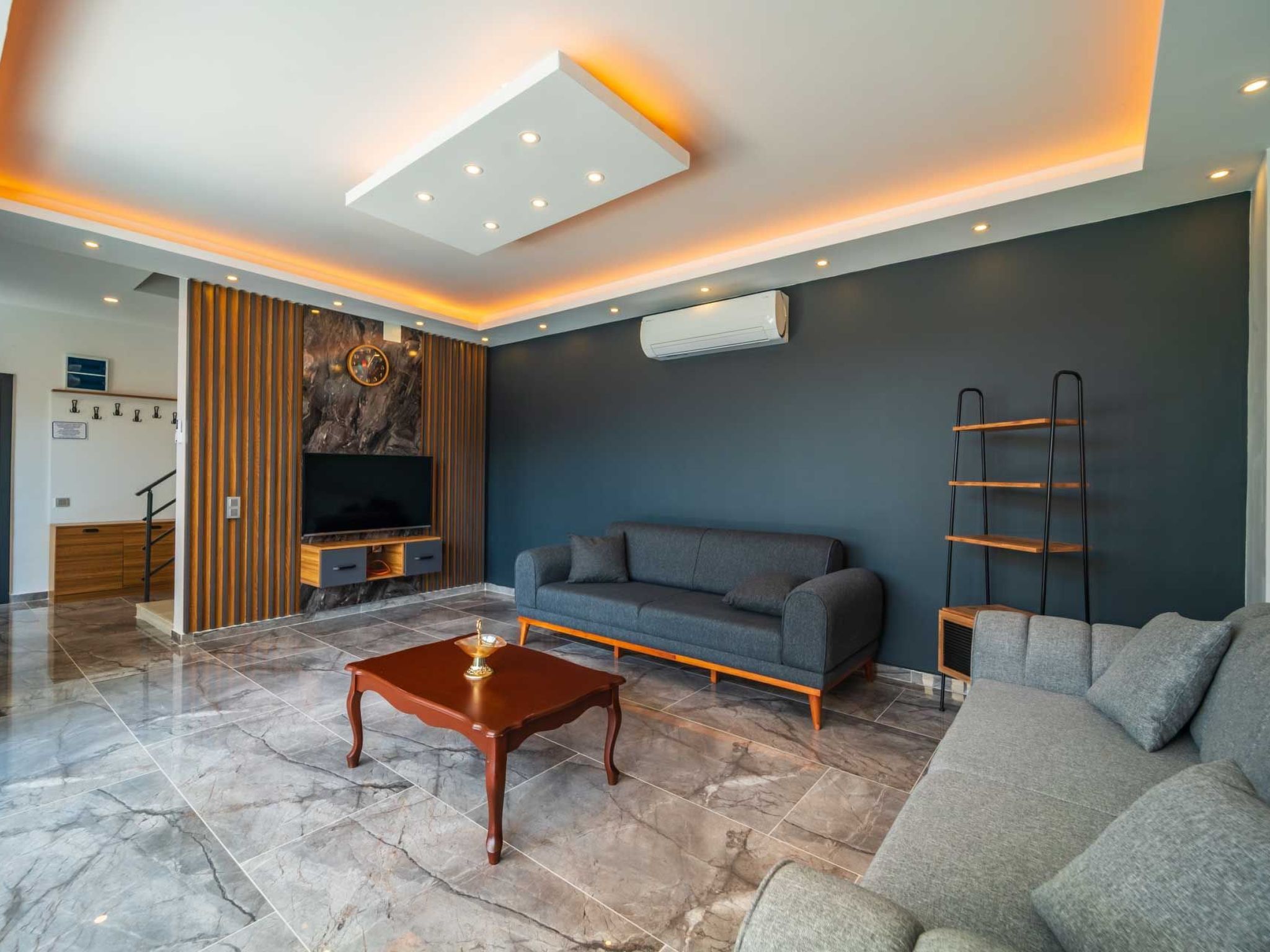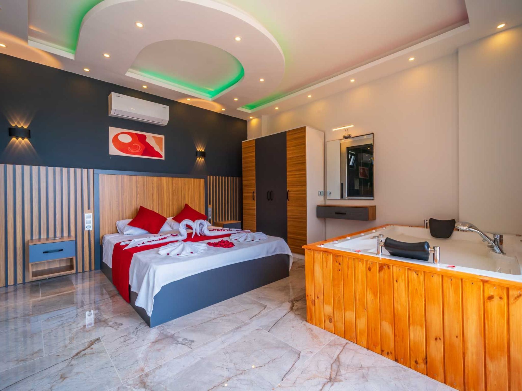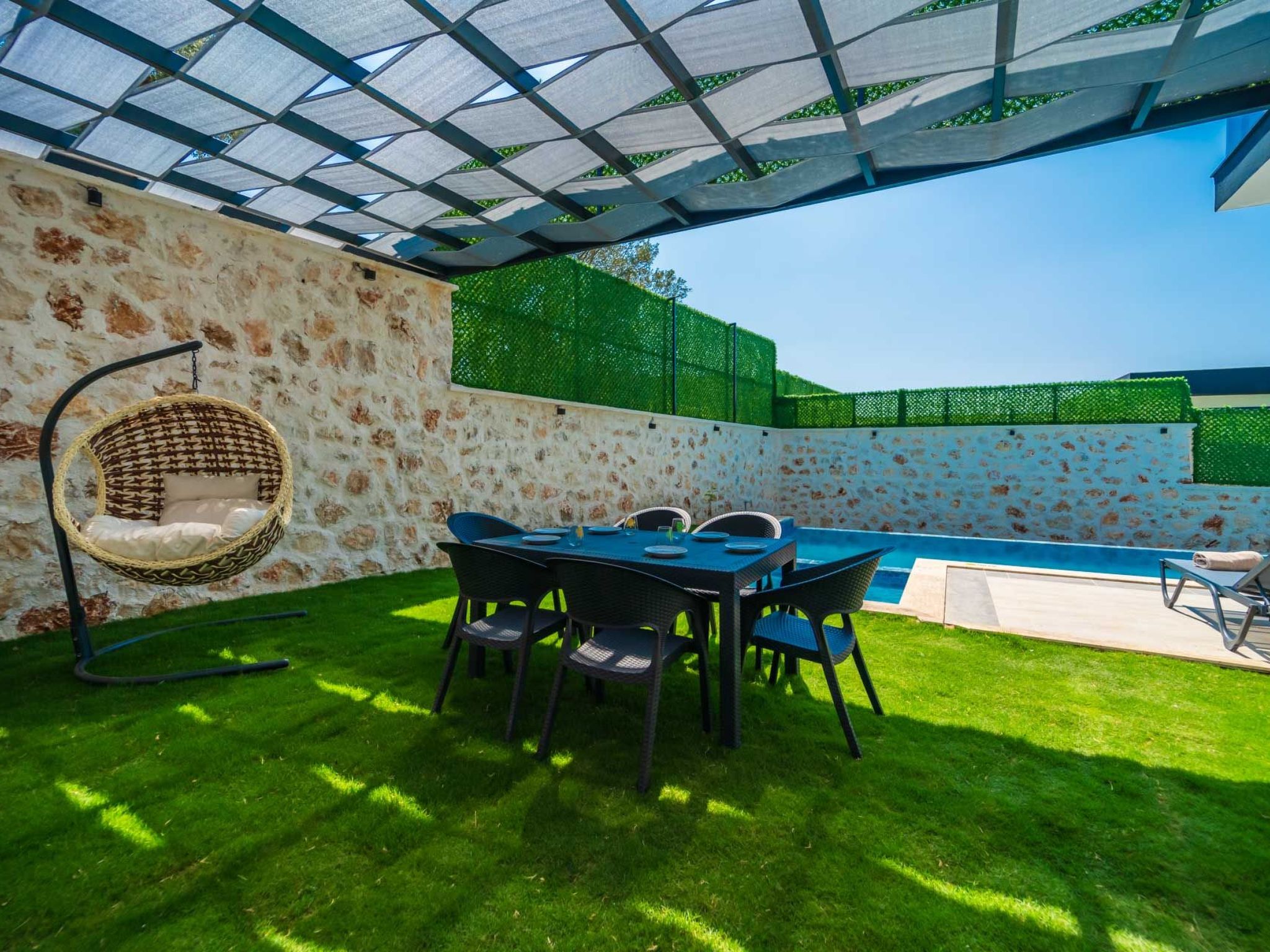 Die Villa befindet sich in Kalkan Islamlar, umgeben von üppigem Grün und einer malerischen Landschaft. Sie bietet ein geräumiges Schlafzimmer, das mit einem luxuriösen Jacuzzi ausgestattet ist, in dem Sie entspannende Stunden verbringen können. Die Villa ist abgeschirmt und bietet Ihnen vollständigen Sichtschutz, sodass Sie Ihre Zeit ungestört genießen können.