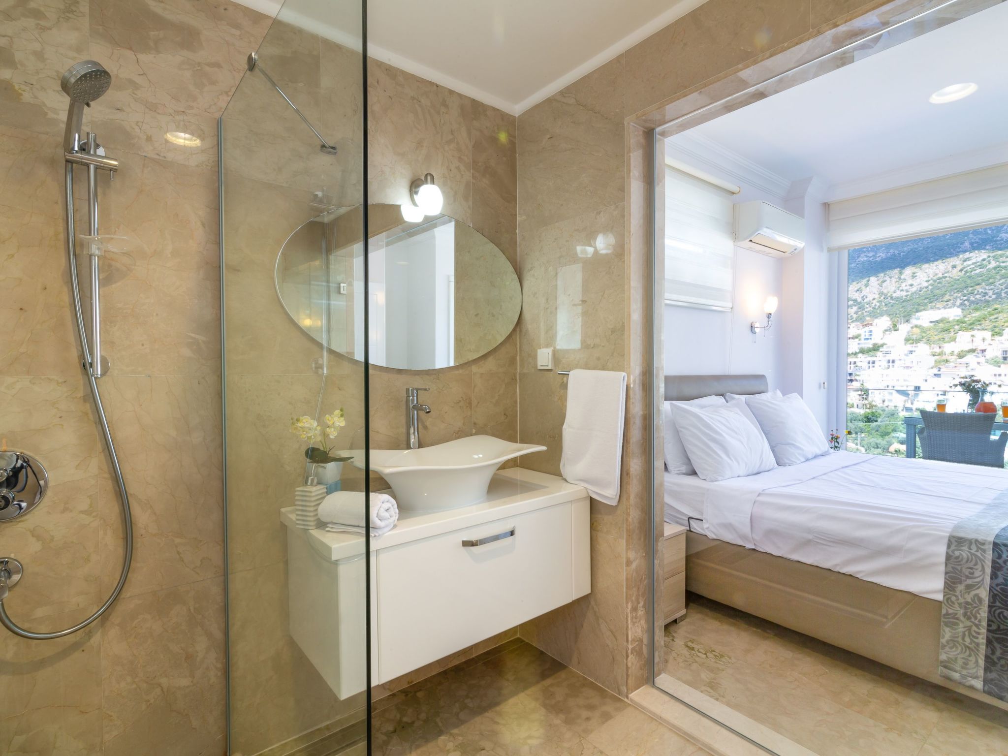 Im Außenbereich setzt sich die Exklusivität fort. Freuen Sie sich auf einen privaten Pool, der ausschließlich Ihnen zur Verfügung steht – perfekt für erfrischende Schwimmrunden oder entspannte Stunden am Wasser. Die Terrasse und der Balkon laden ein, die beruhigende Atmosphäre und die schöne Aussicht in vollen Zügen zu genießen. Ob beim Sonnenbaden oder bei einem Abendessen unter freiem Himmel, hier finden Sie den idealen Ort, um zu entspannen und den Tag ausklingen zu lassen.