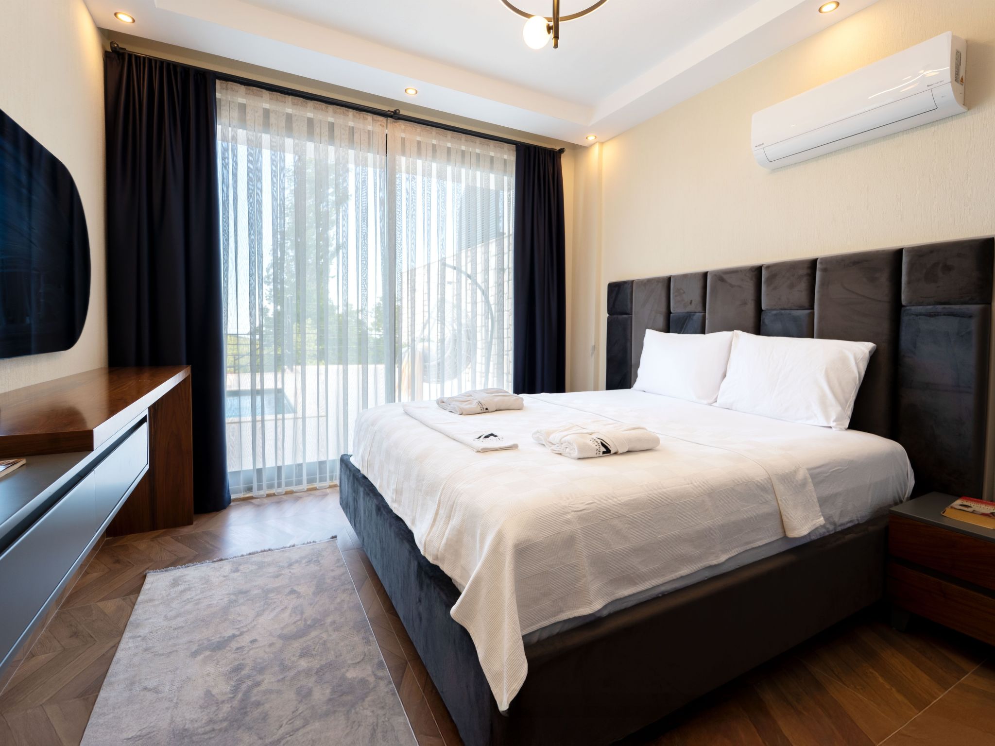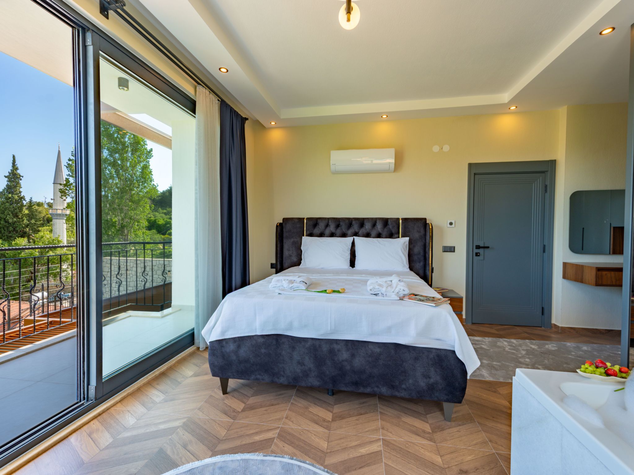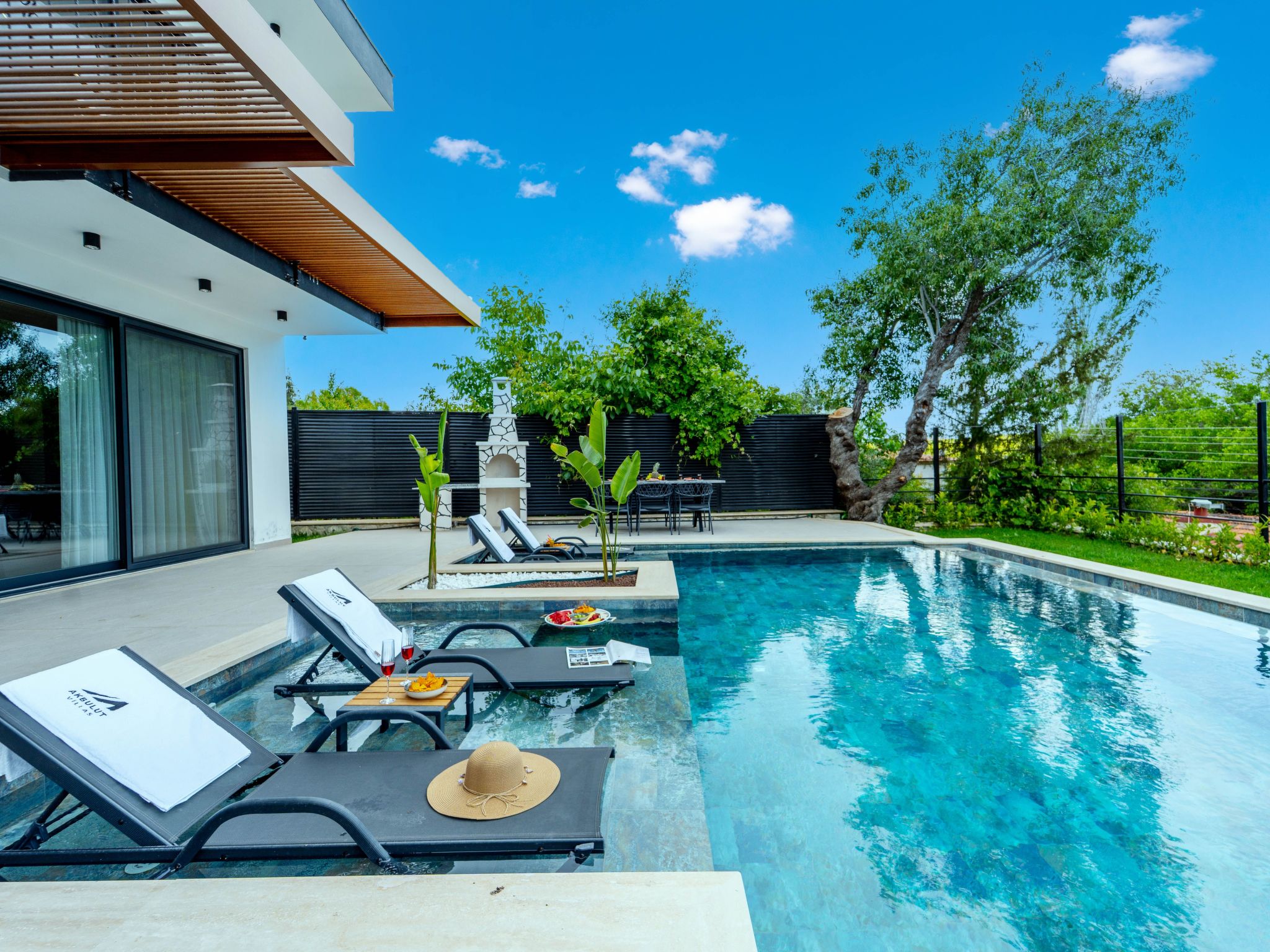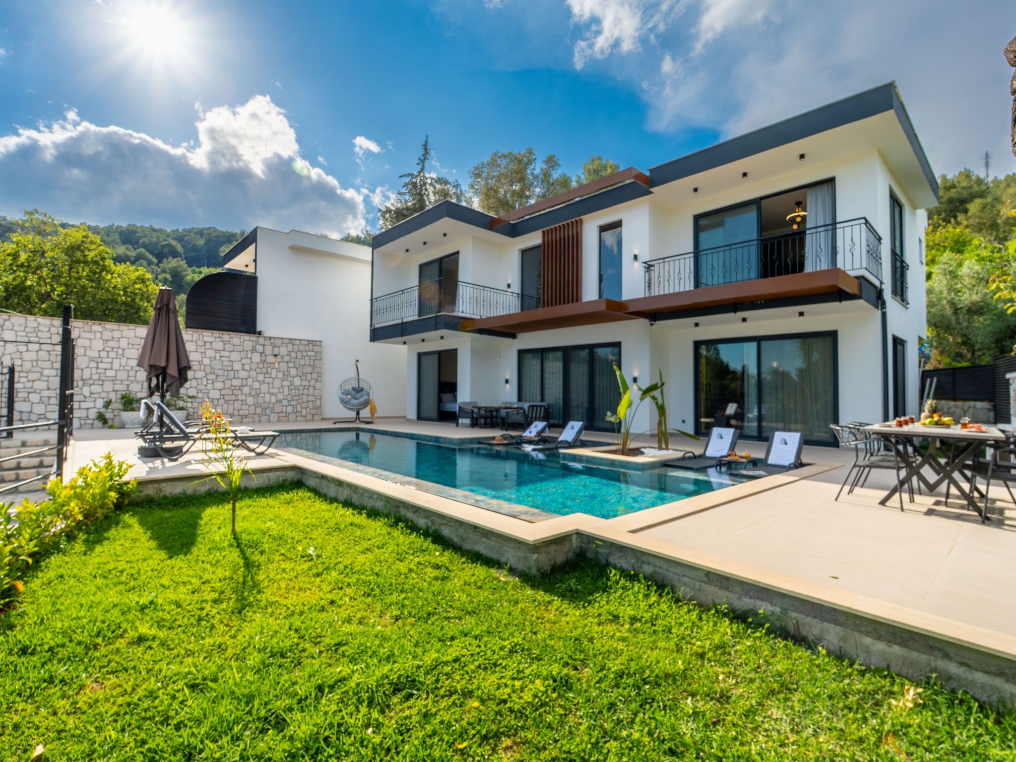 Neue und moderne Villa in Kas. Eine Familienvilla in Pinarbasi, Kas, mit einer Kapazität für 6 Personen. Unsere Villa mit Sichtschutz verfügt über ein türkisches Bad, eine Sauna und einen Jacuzzi. Da sie uneinsehbar ist, kann sie sowohl im Sommer als auch im Winter bequem genutzt werden. Mit dem Grillbereich am Pool können Sie ein romantisches Abendessen mit Blick auf das Mittelmeer genießen.