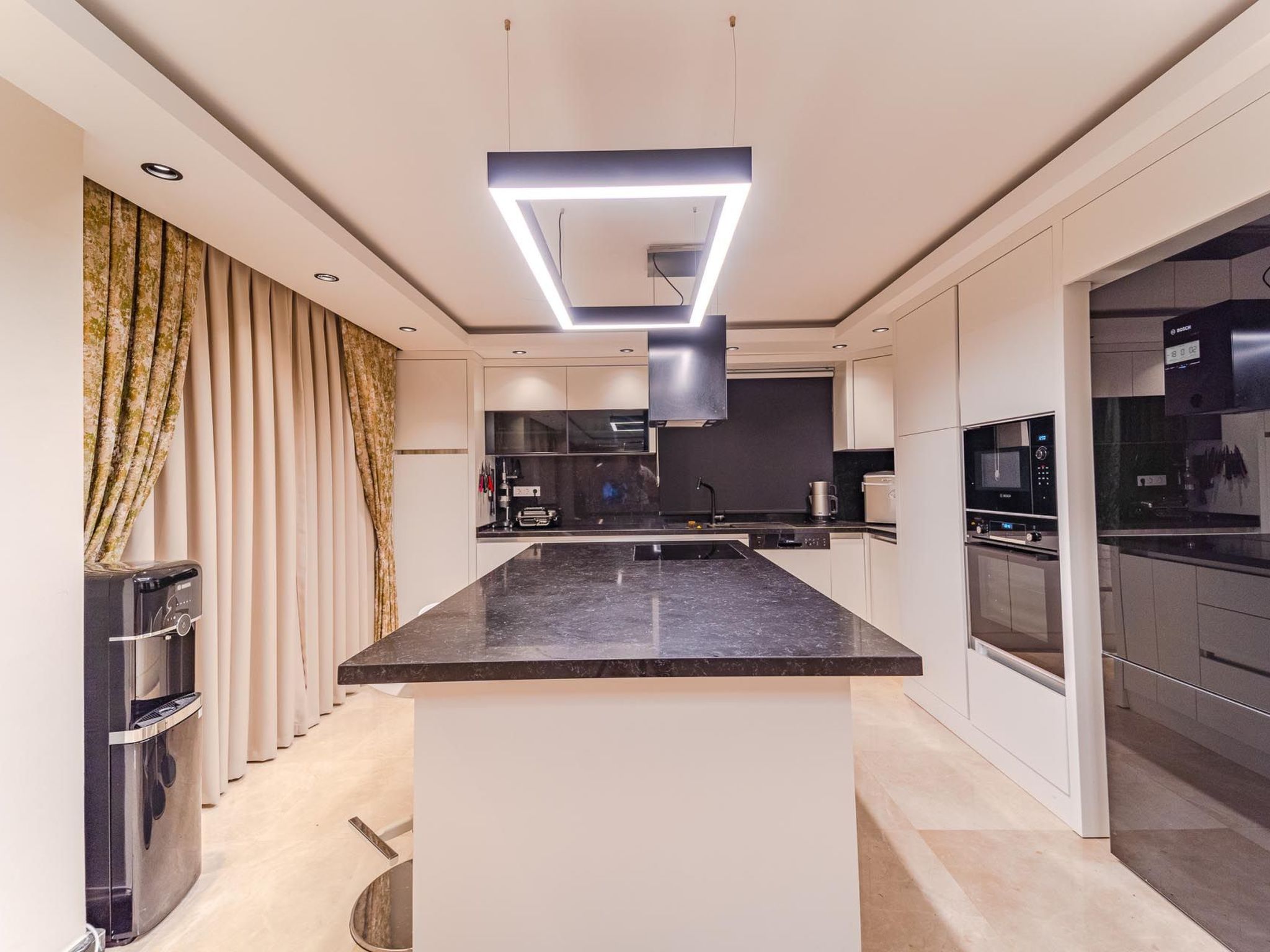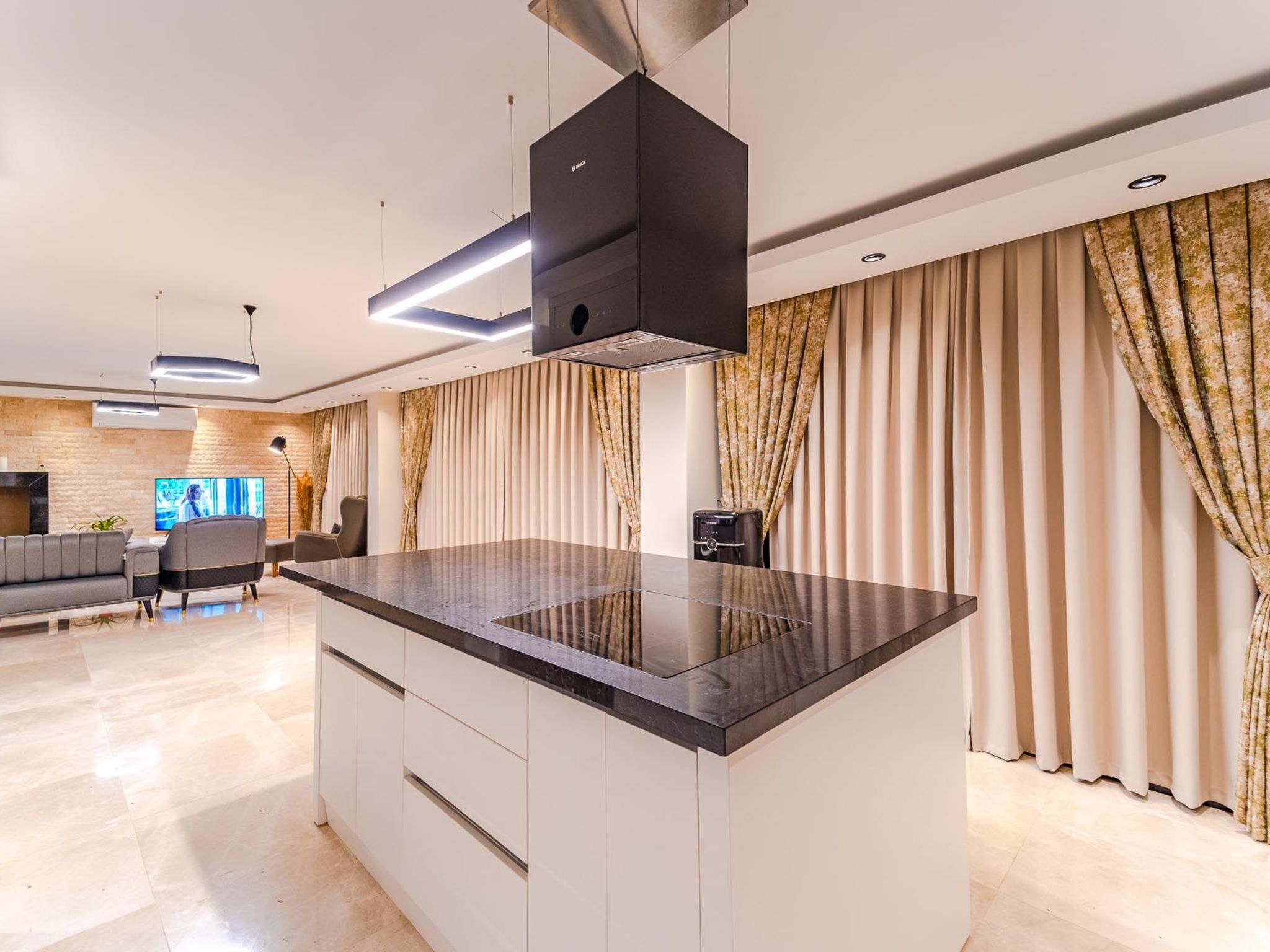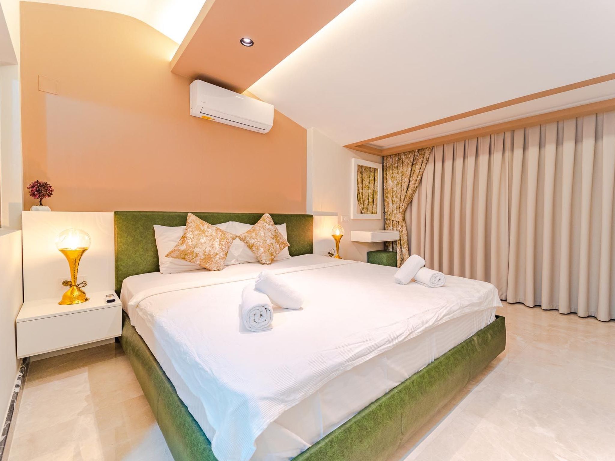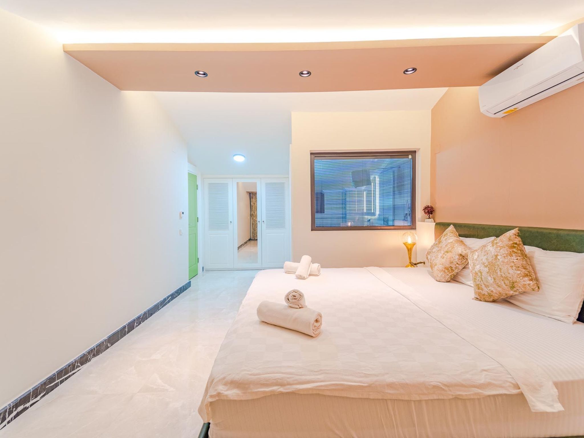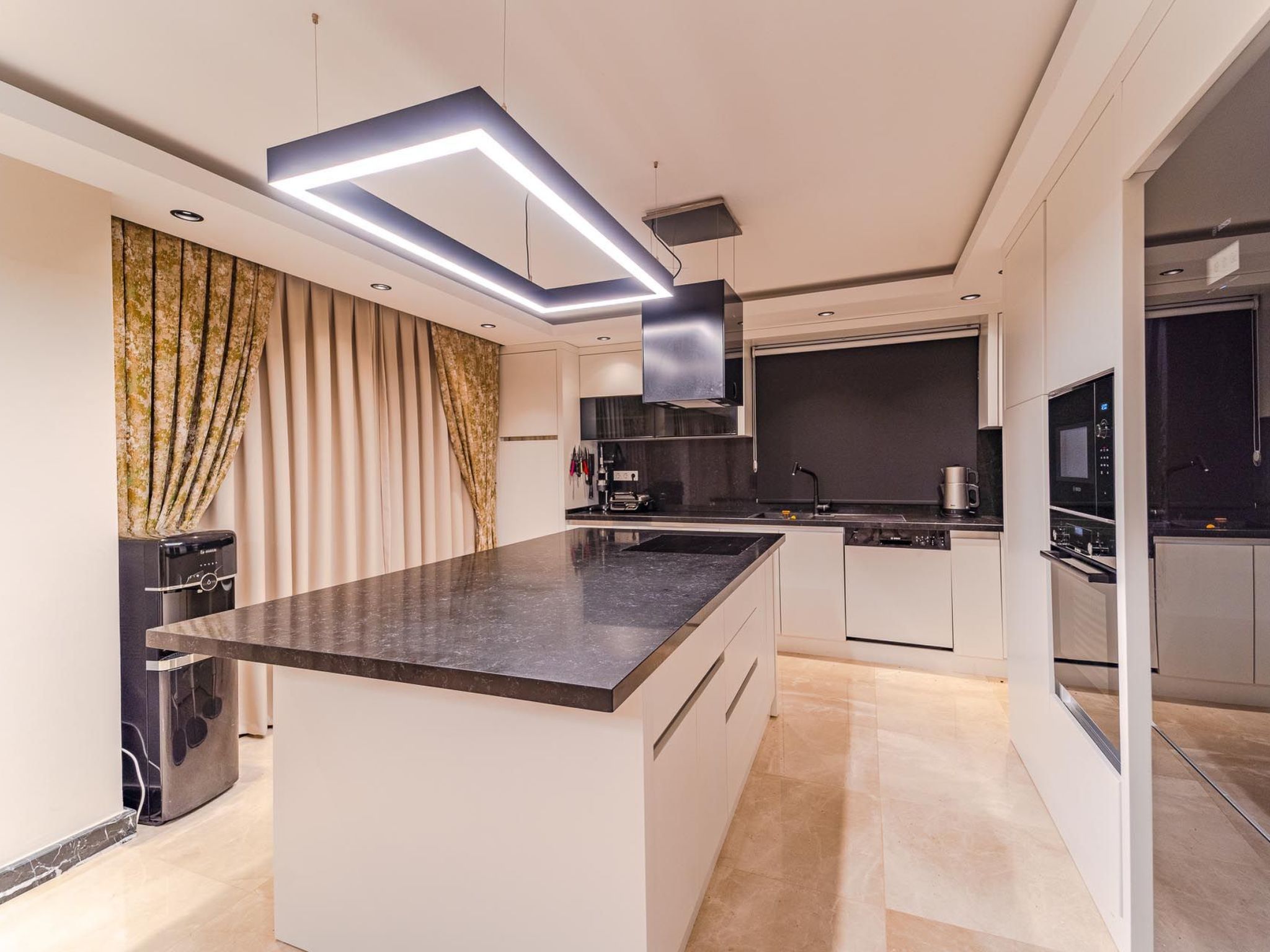 Im Inneren der Ferienwohnung erwartet Sie eine durchdachte Ausstattung, die keinen Wunsch offen lässt. Sie verfügen über vier Schlafzimmer, die sich ideal zur Erholung nach einem erlebnisreichen Tag anbieten und dank abdunkelbarer Vorrichtungen für einen erholsamen Schlaf sorgen. Zu jeder der vier Schlafzimmern gehört ein eigenes Badezimmer, ausgestattet mit einer Dusche, um Komfort und Privatsphäre für jeden Gast zu gewährleisten. Die Klimaanlage in der gesamten Wohnung sorgt auch an heißen Tagen für angenehme Temperaturen, während die Waschmaschine und Spülmaschine den Komfort Ihres Aufenthalts erhöhen.