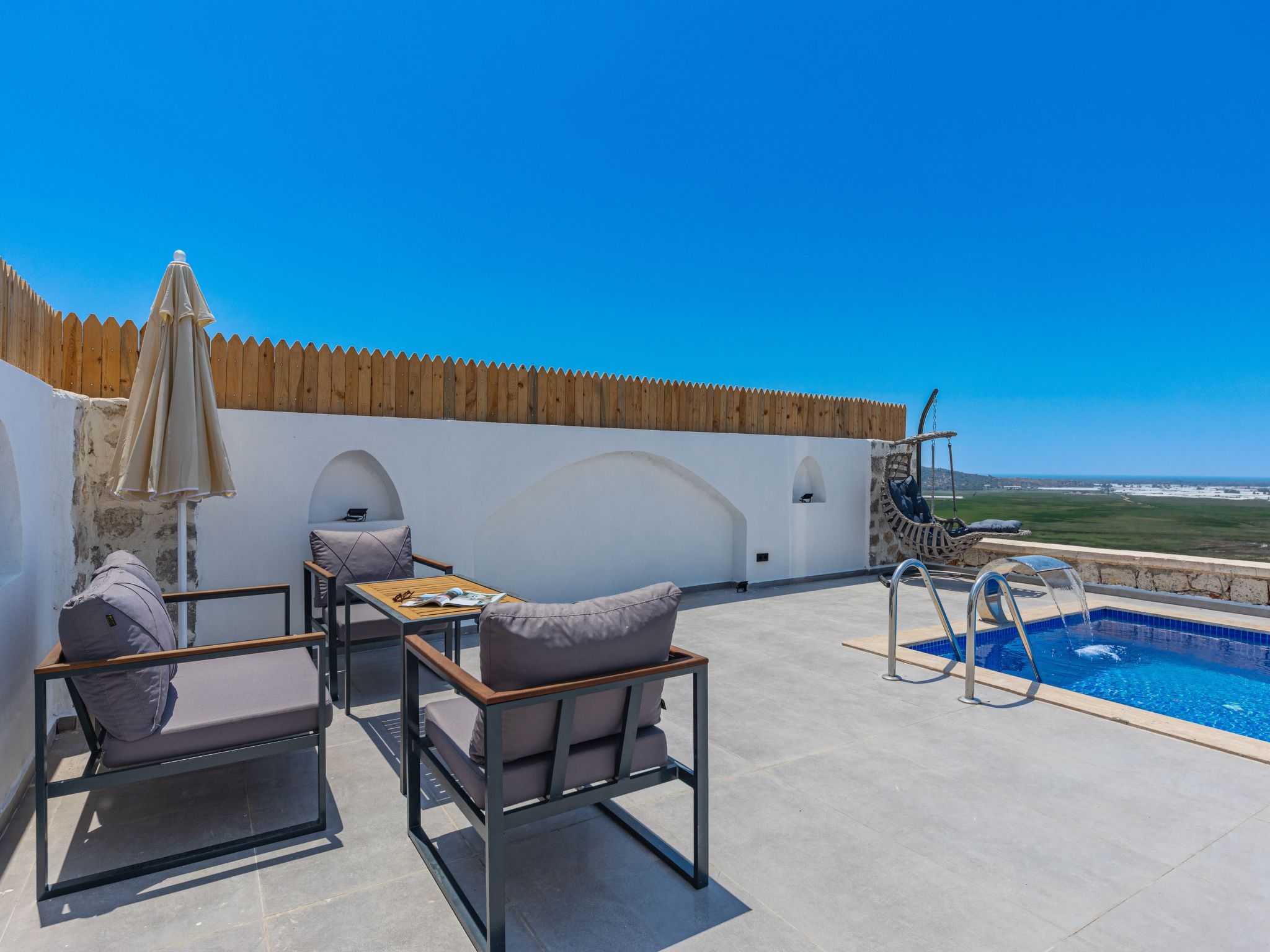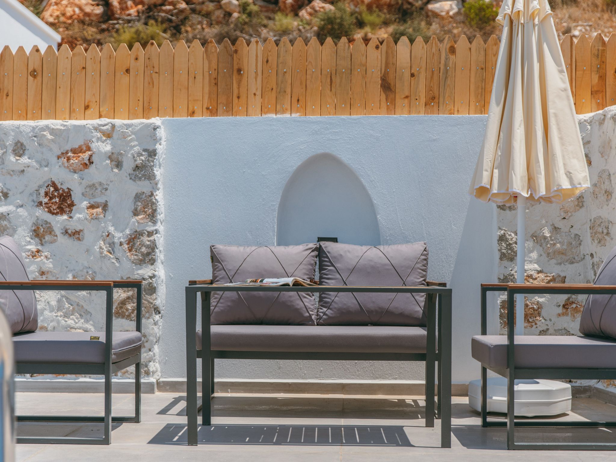 Eine Terrasse umgeben das Haus und bieten perfekte Ecken, um in Ruhe ein Buch zu lesen oder einfach die ruhige Atmosphäre zu genießen. Trotz der naturnahen Lage ist es mit Klimaanlage in allen Bereichen ausgestattet, sodass Sie auch an heißen Tagen ein angenehmes Raumklima vorfinden.