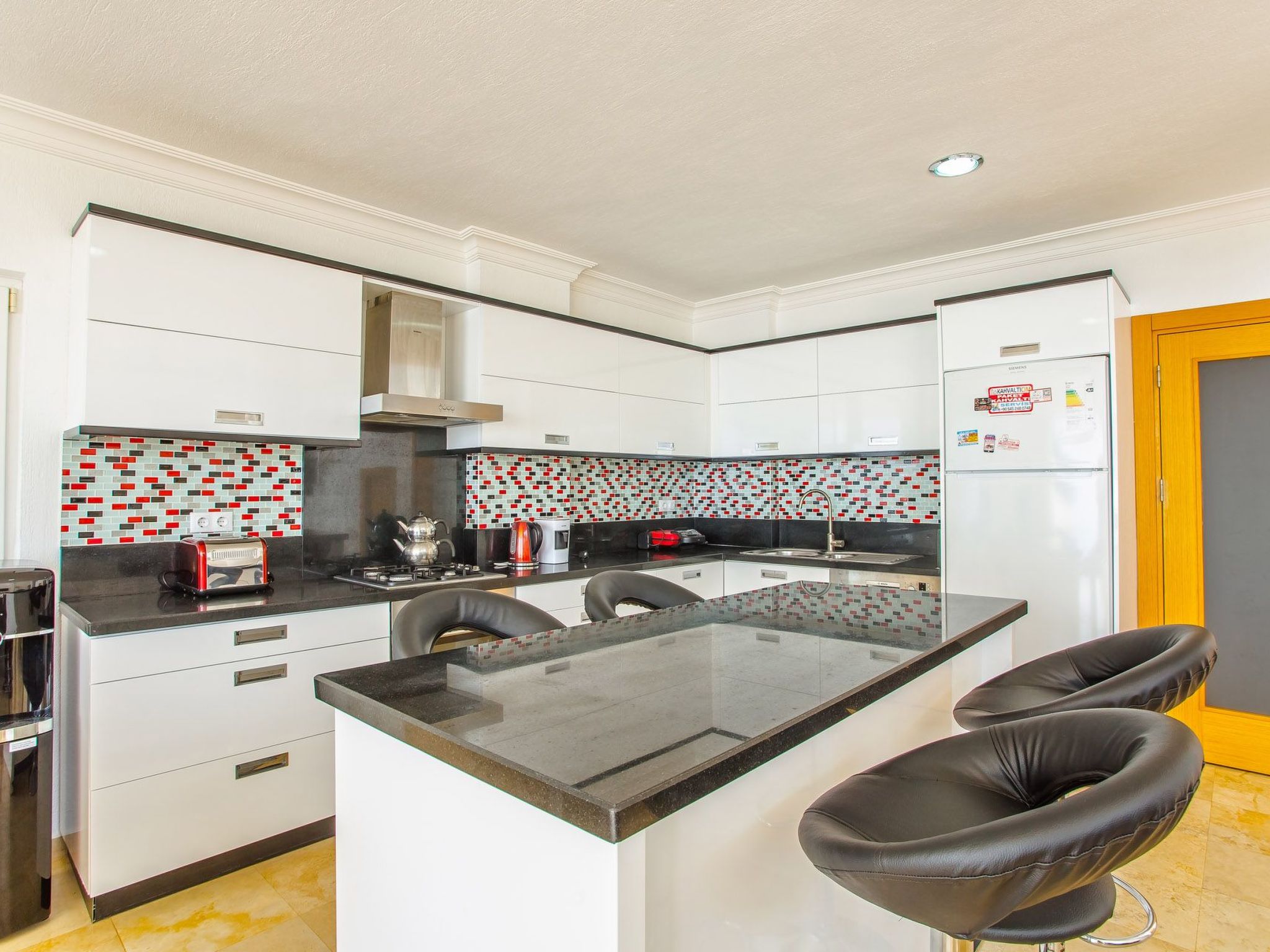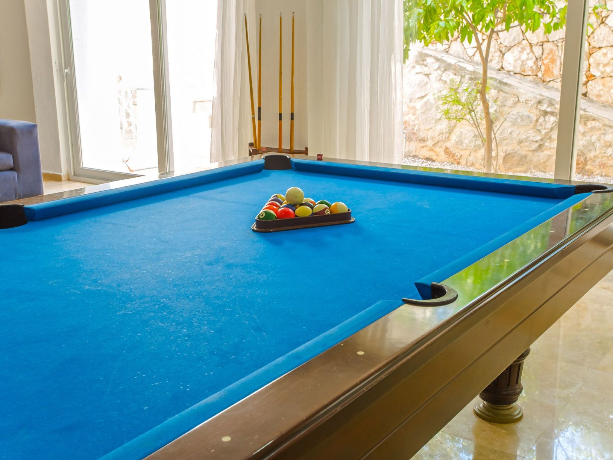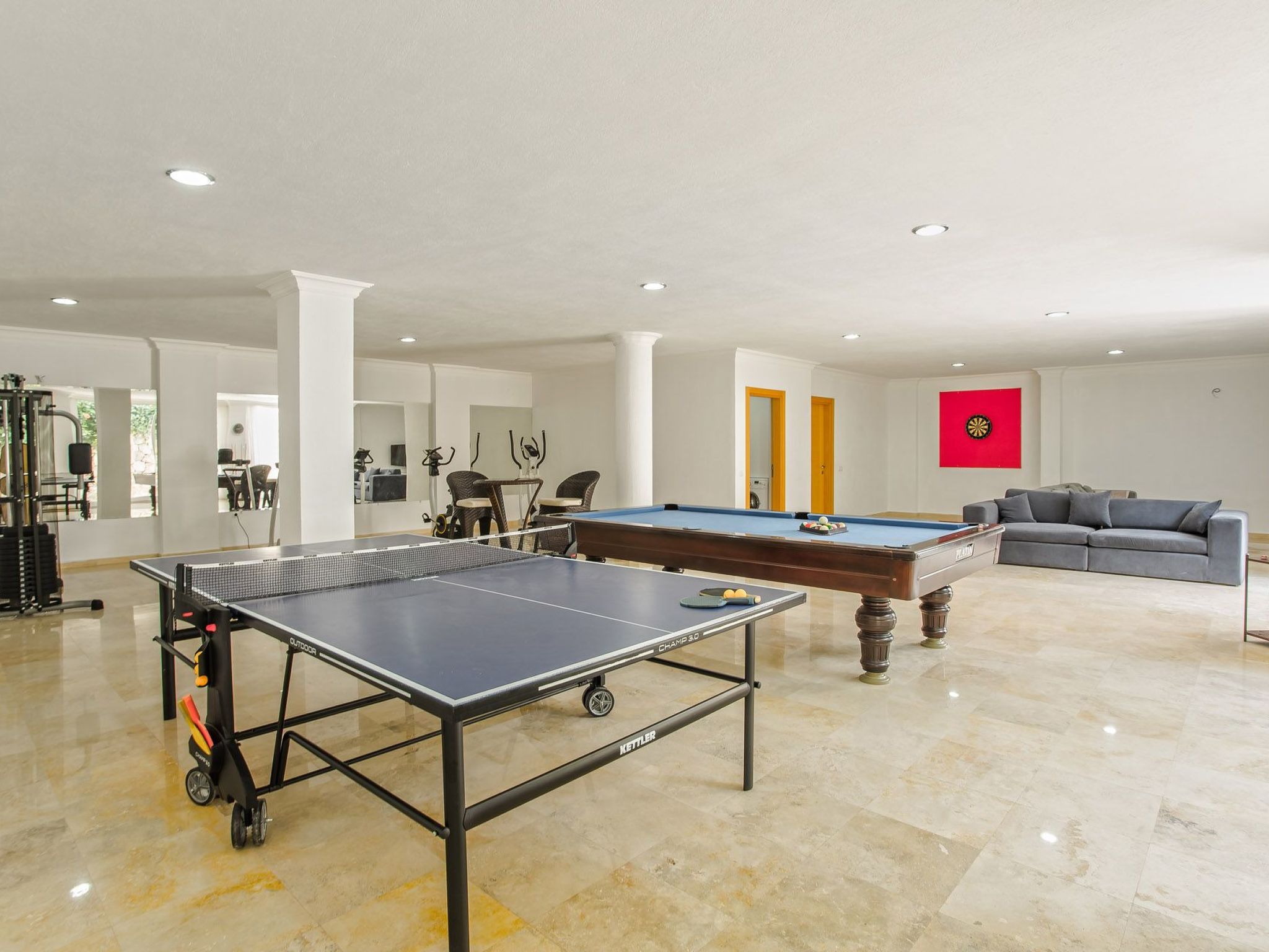 Im Inneren erwartet die Gäste eine voll ausgestattete Unterkunft, die keine Wünsche offen lässt. Die fünf gemütlichen Schlafzimmer mit jeweils angeschlossenen Badezimmern sorgen für privaten Komfort. Zur gemeinsamen Nutzung steht eine Waschmaschine bereit, und die Küche ist mit einem Gasherd, einer Spülmaschine sowie mit einem Wasserkocher und einer Kaffeemaschine bestens ausgestattet. Für Unterhaltung sorgt ein Billardtisch, während die durchgängige Klimatisierung auch an heißen Tagen für angenehme Kühle sorgt.