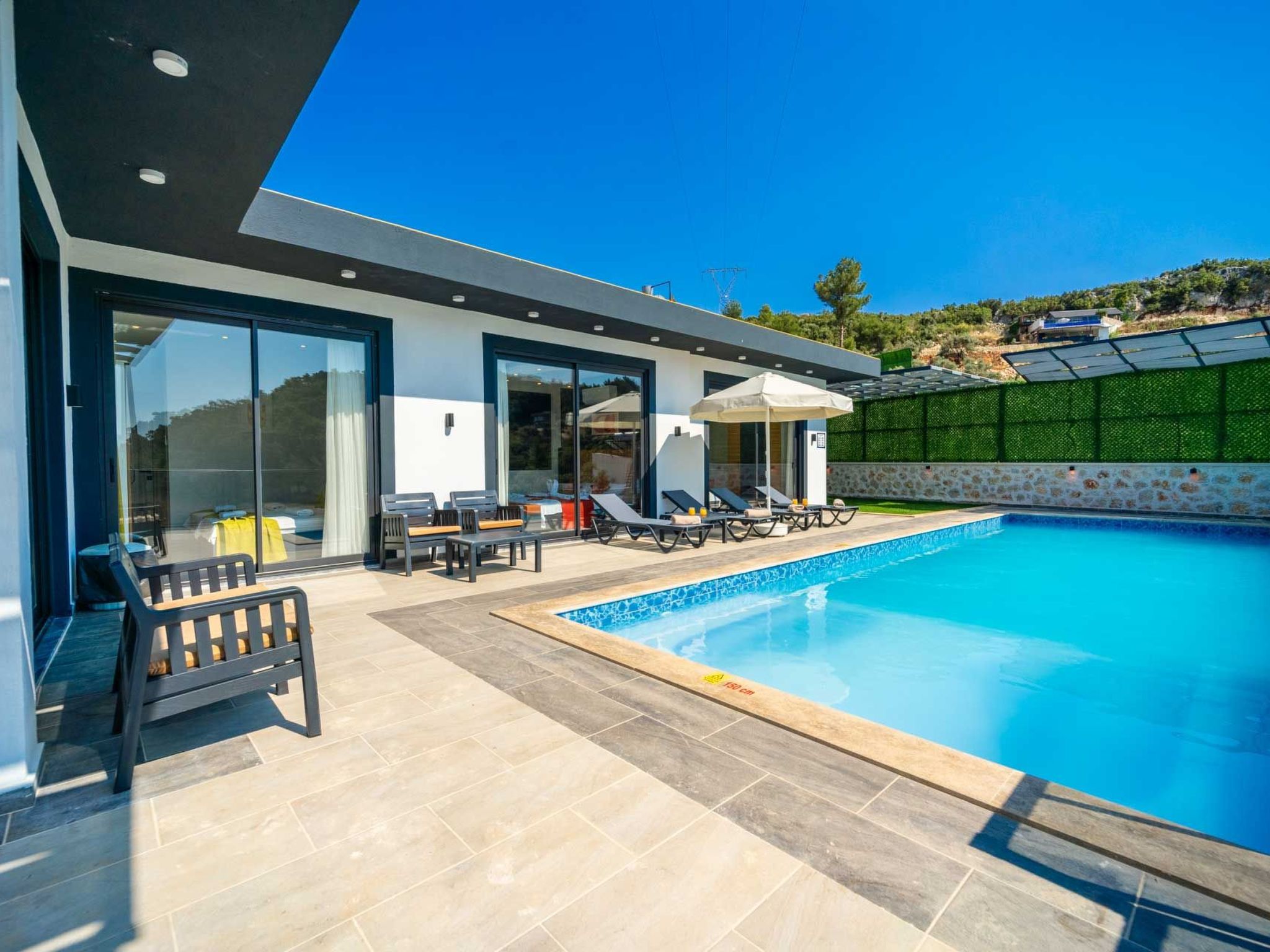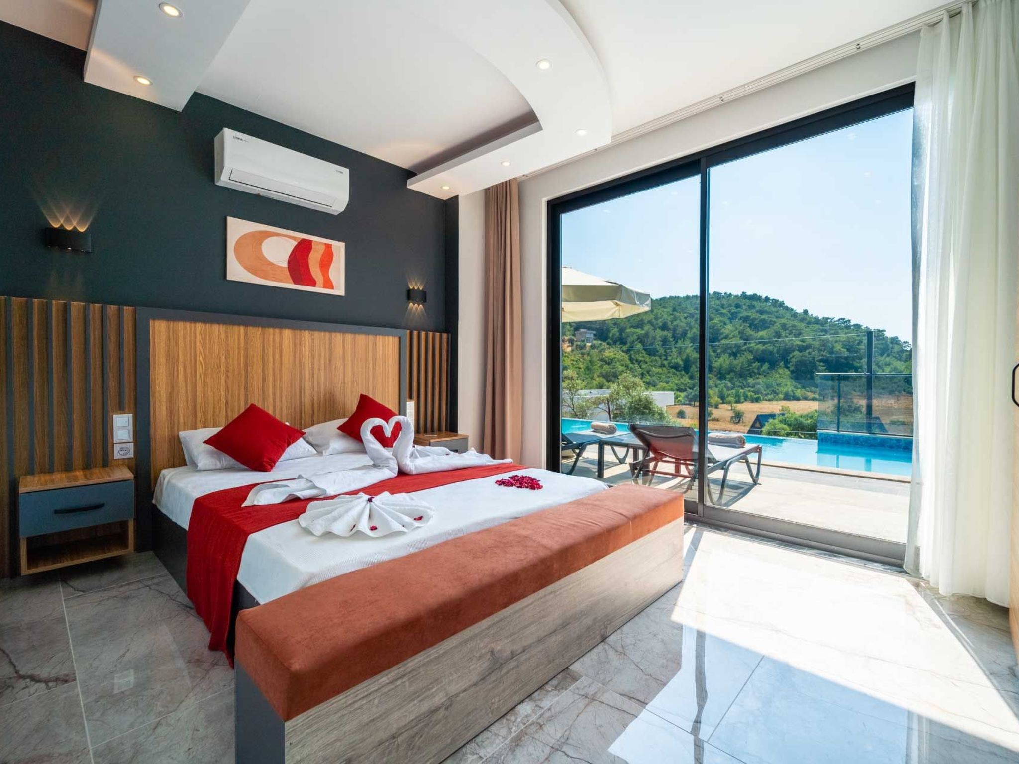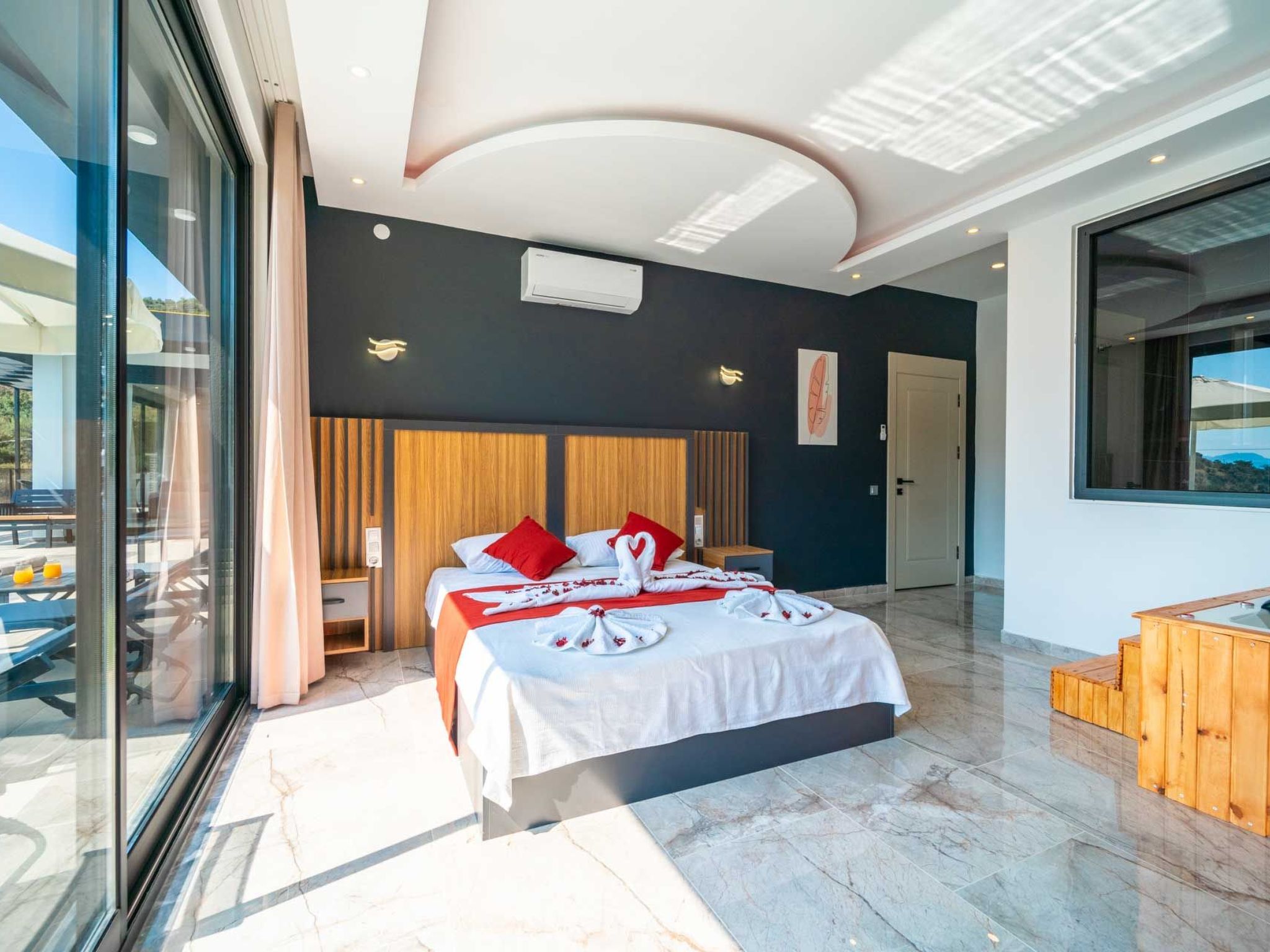 Die Villa ist liebevoll eingerichtet und strahlt eine warme und einladende Atmosphäre aus, die ideal für Flitterwochen ist. Sie können sich im Jacuzzi oder am Pool entspannen und die Ruhe und Schönheit der Natur auf sich wirken lassen. In der Umgebung gibt es zahlreiche Möglichkeiten für Aktivitäten wie Wandern, Besichtigungen und Ausflüge zu den nahegelegenen Stränden und Sehenswürdigkeiten. Erleben Sie unvergessliche Flitterwochen in unserer Villa in Kalkan Islamlar und genießen Sie einen luxuriösen und romantischen Aufenthalt in absoluter Privatsphäre.