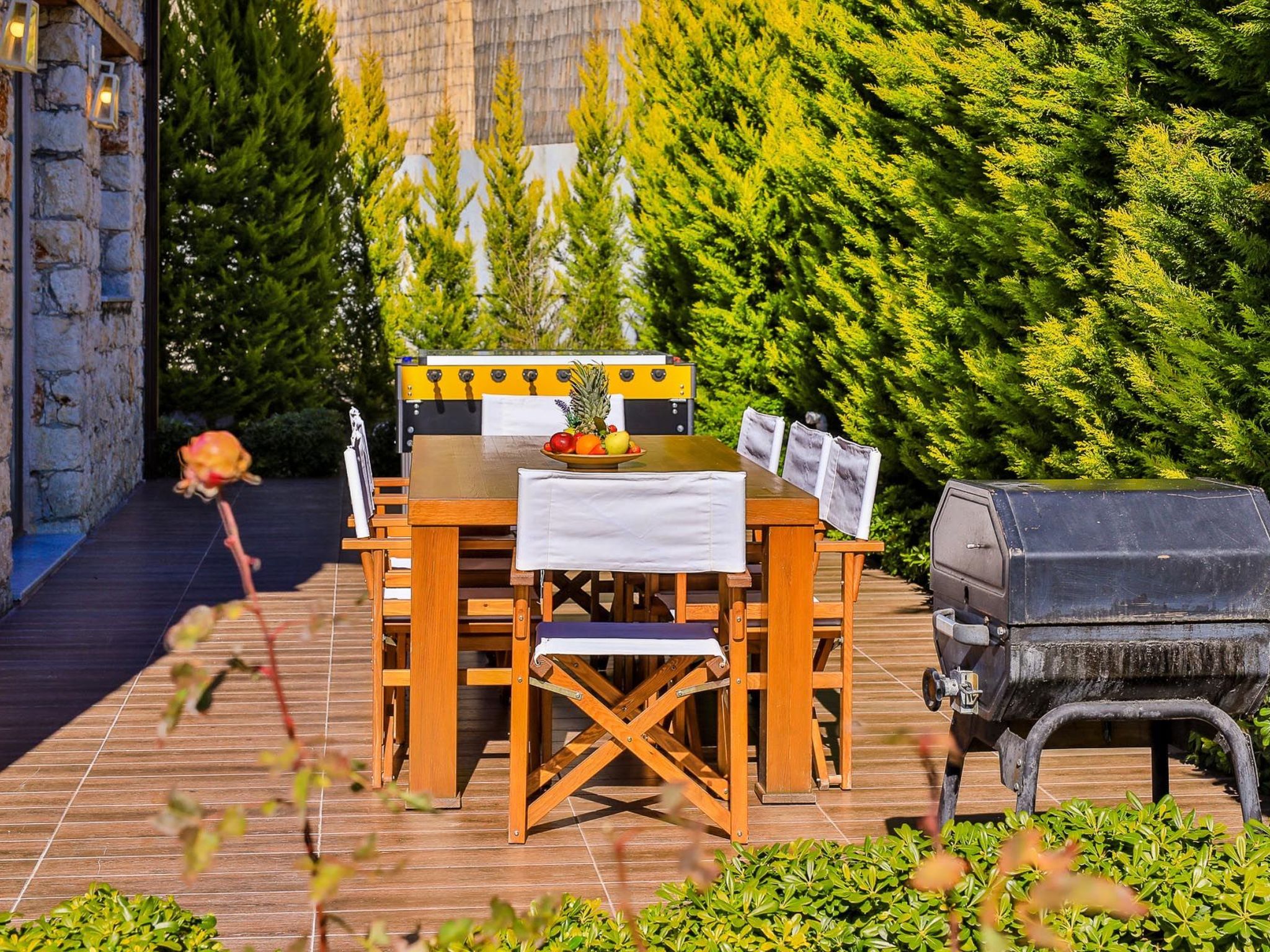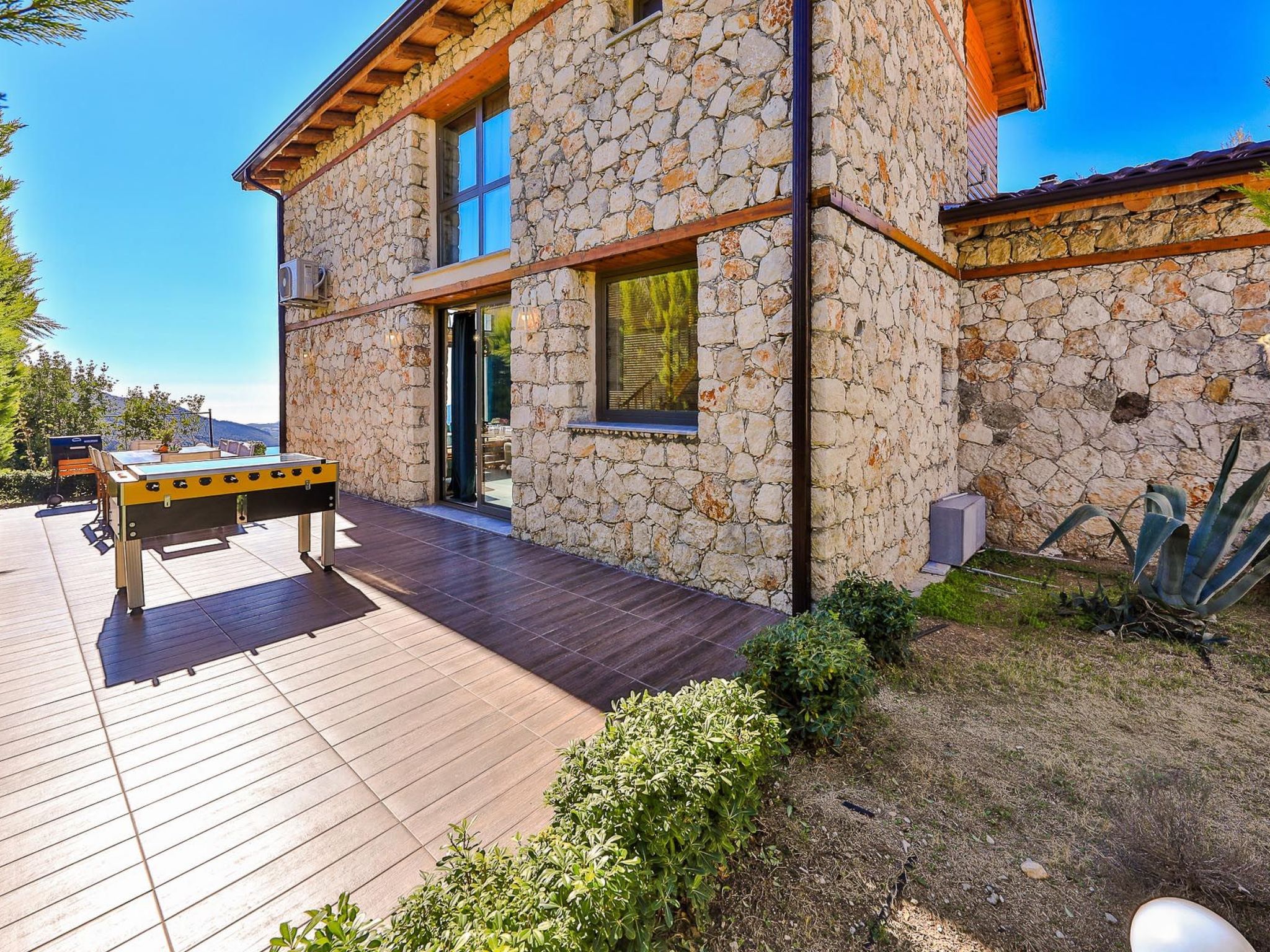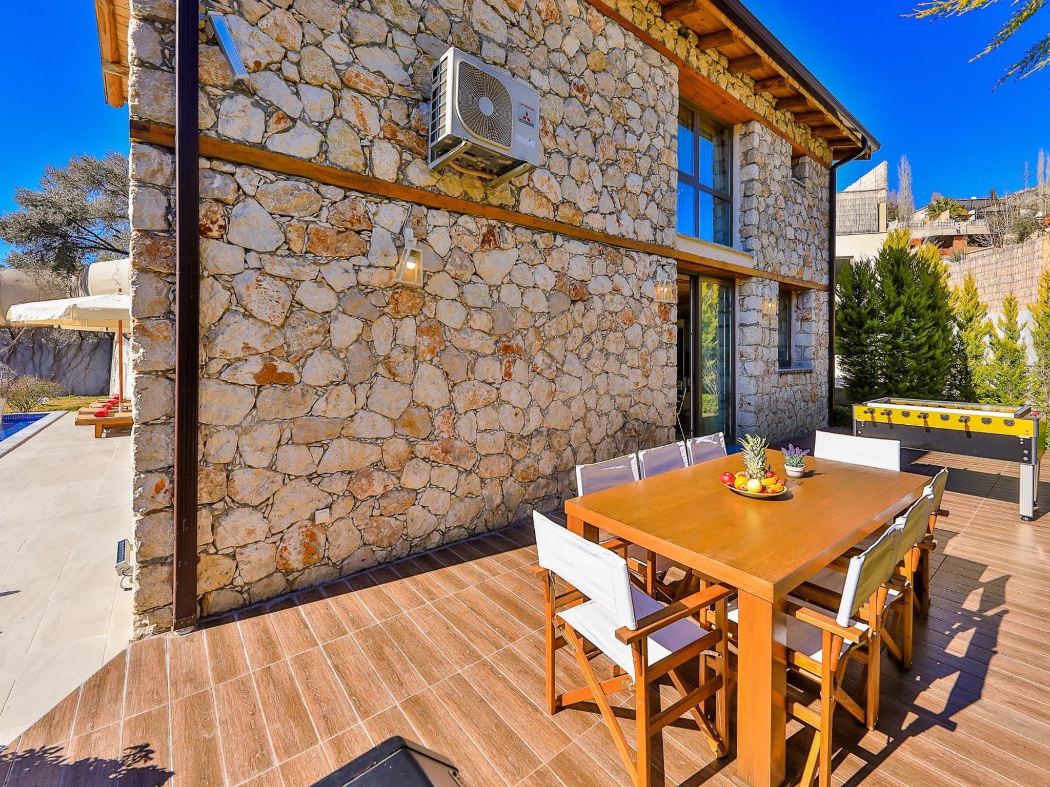 Die Villa verfügt über mehrere Außenbereiche, darunter eine geräumige Terrasse und einen Garten, die perfekt zum Entspannen und Genießen der Natur geeignet sind. Der private Pool bietet eine erfrischende Abkühlung an warmen Tagen und lädt zum Sonnenbaden und Entspannen ein.