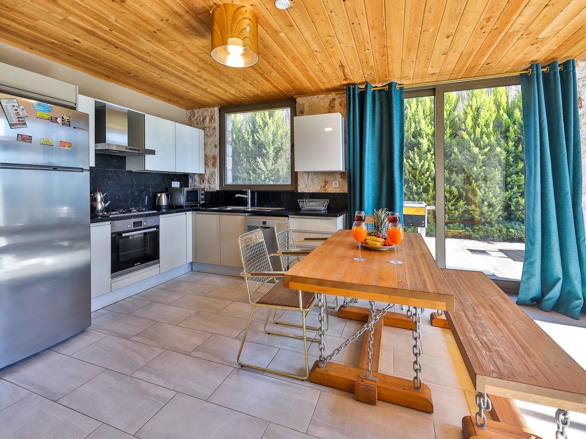 Die voll ausgestattete Küche lädt dazu ein, lokale Spezialitäten zuzubereiten und gemeinsame Mahlzeiten mit Familie und Freunden zu genießen. Alternativ können Sie auch im Freien auf der Terrasse dinieren und dabei die frische Luft und die malerische Aussicht auf die grünen Hügel genießen.