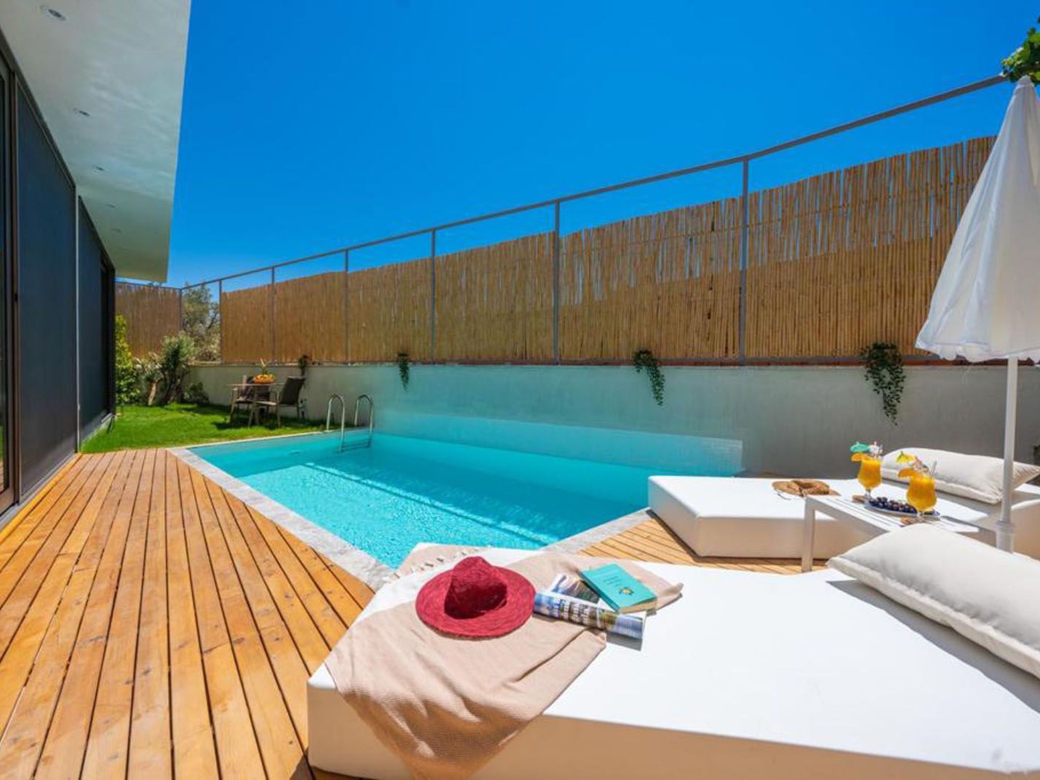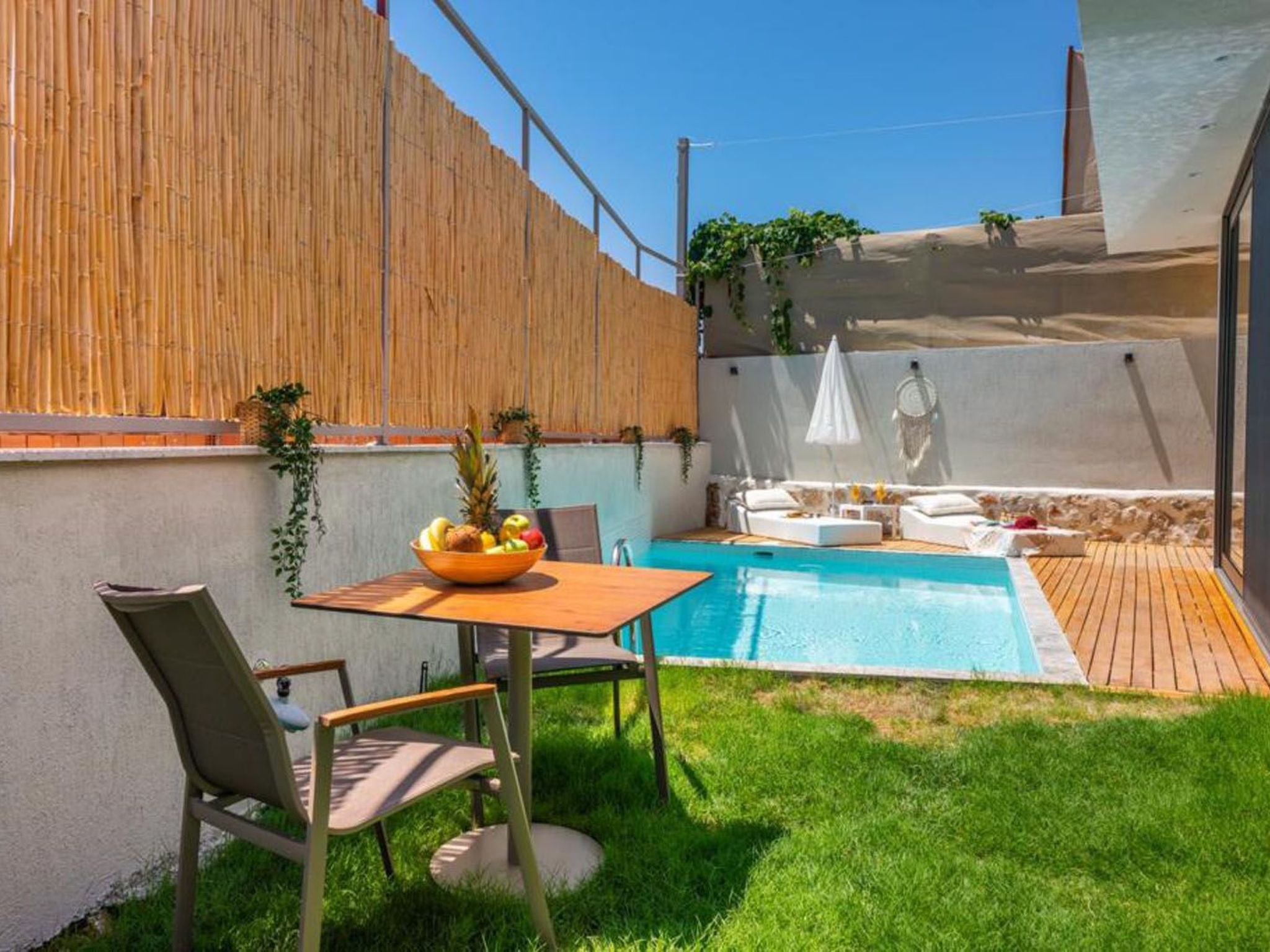 Draußen erwartet Sie ein schön gestalteter Außenbereich, der Ihnen vollständig zur Verfügung steht. Nehmen Sie ein erfrischendes Bad im privaten Pool oder genießen Sie entspannte Stunden auf der Terrasse oder dem Balkon. Der zur alleinigen Nutzung bestimmte Garten bietet viel Platz für persönliche Entspannung inmitten der Natur. Diese Außenbereiche laden dazu ein, die ruhige Atmosphäre voll auszukosten.