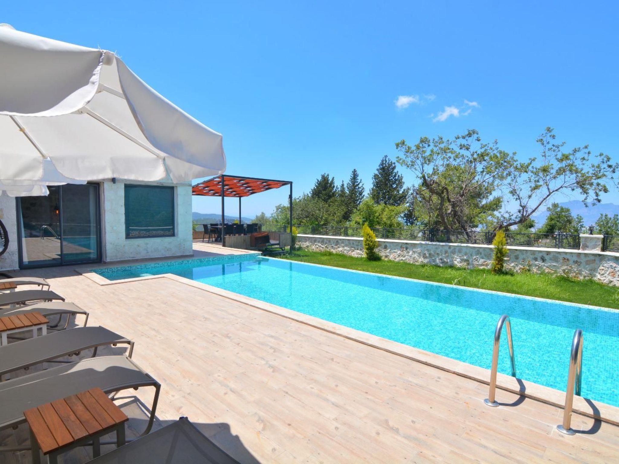 Die Villa liegt in dem charmanten Dorf Kalkan Üzümlü, nur eine kurze Fahrt vom belebten Zentrum von Kalkan entfernt. Die ruhige Lage bietet eine idyllische Umgebung, umgeben von üppigen grünen Hügeln und einer atemberaubenden Aussicht auf die majestätischen Berge.