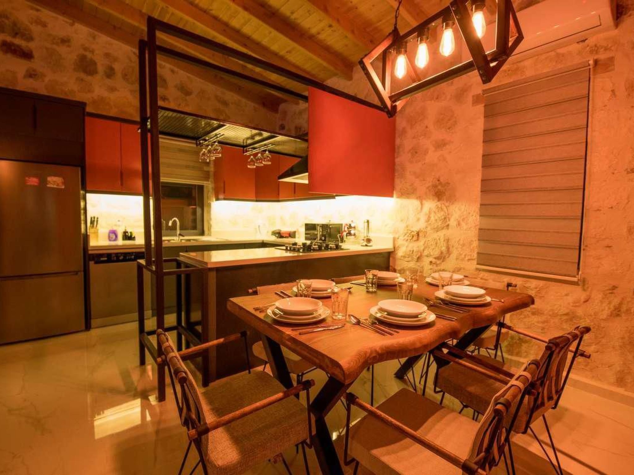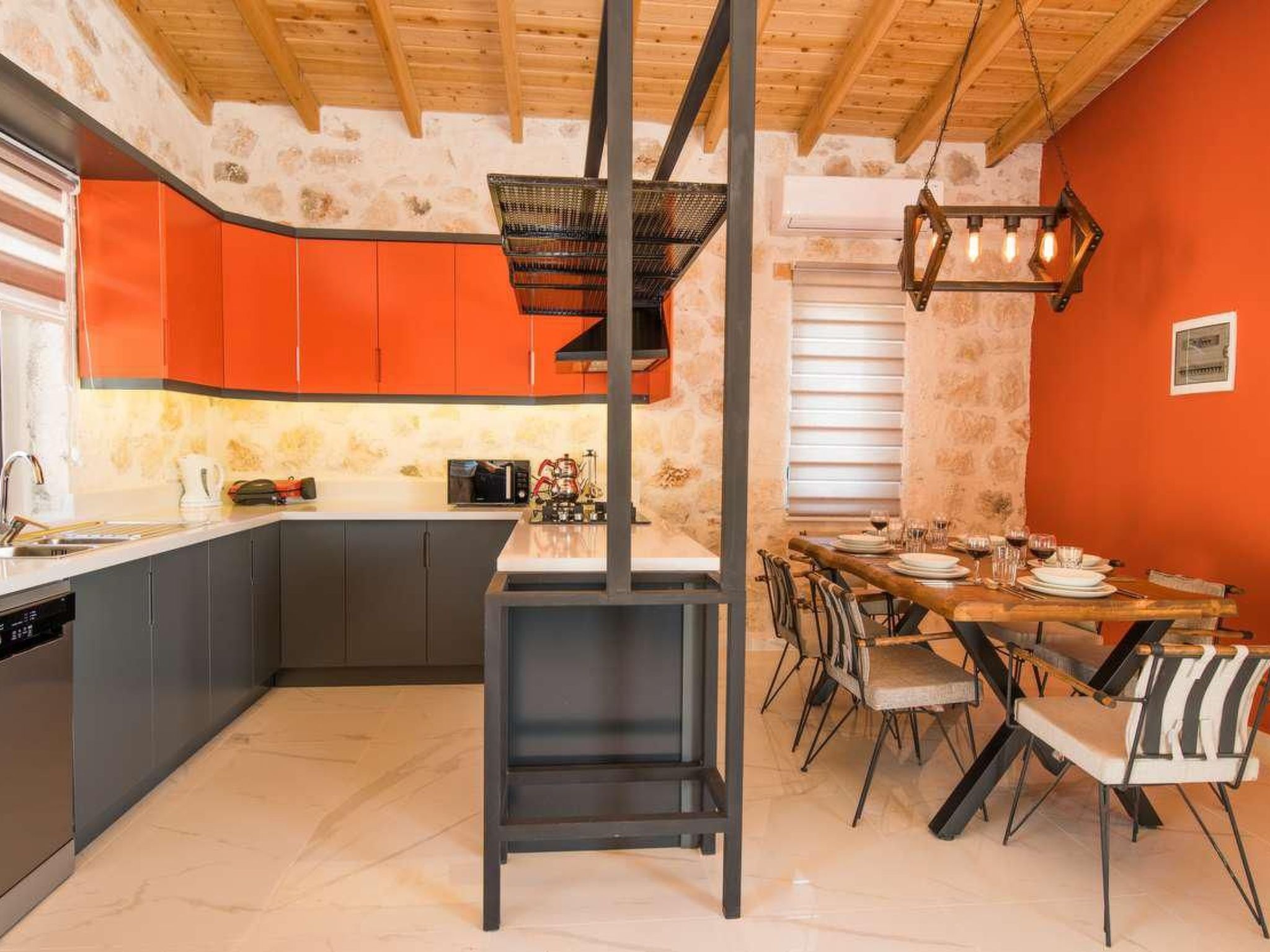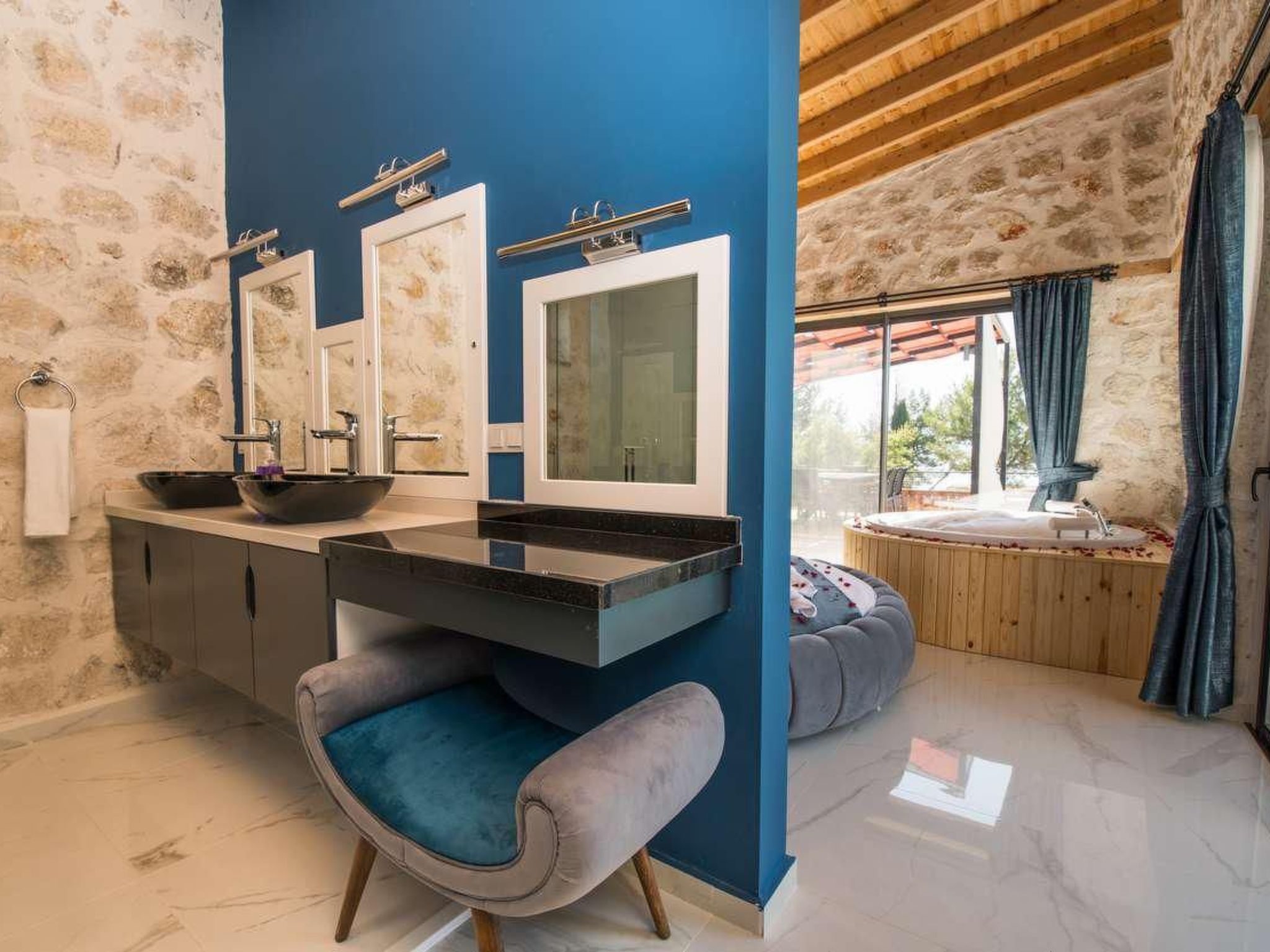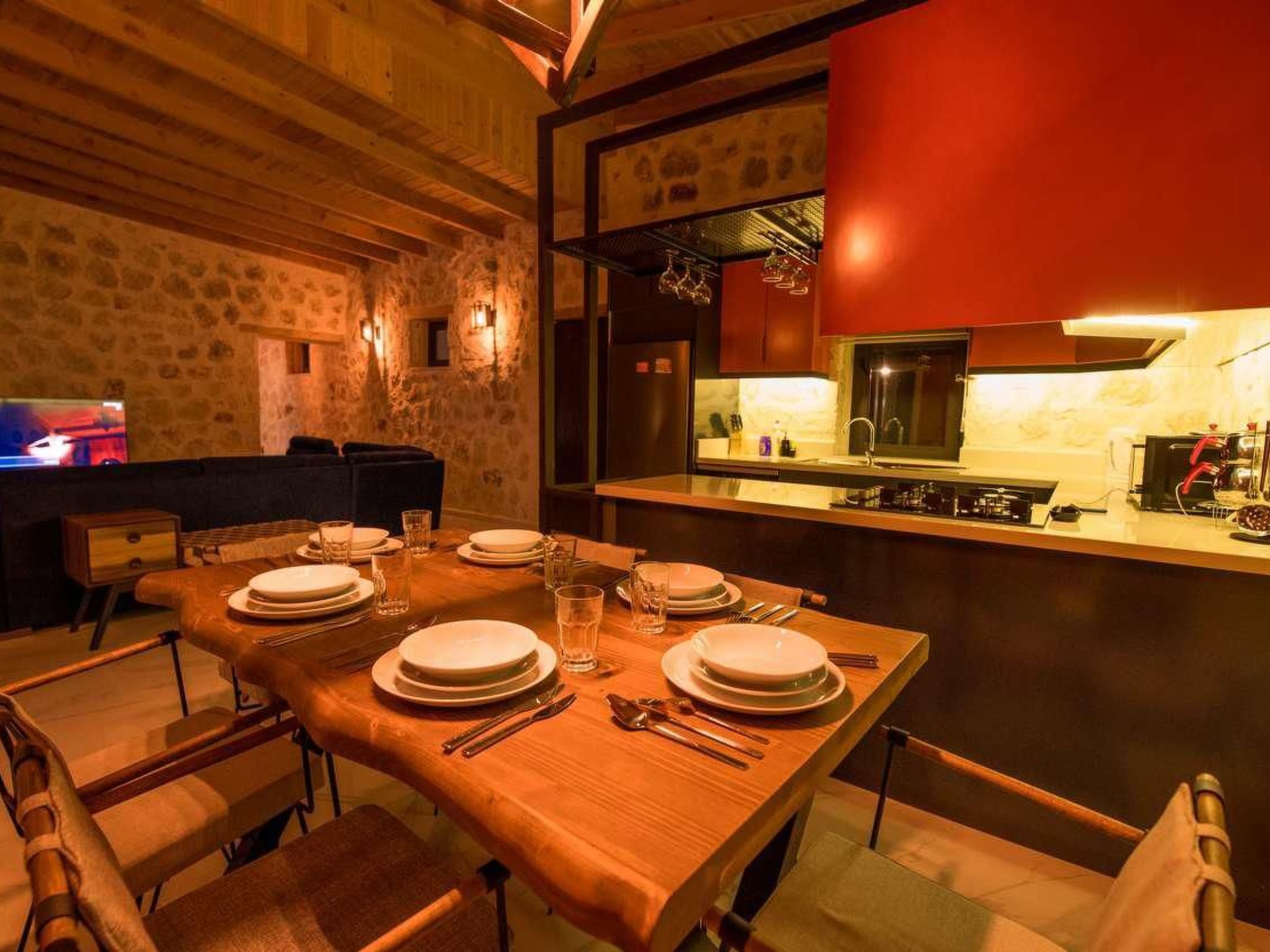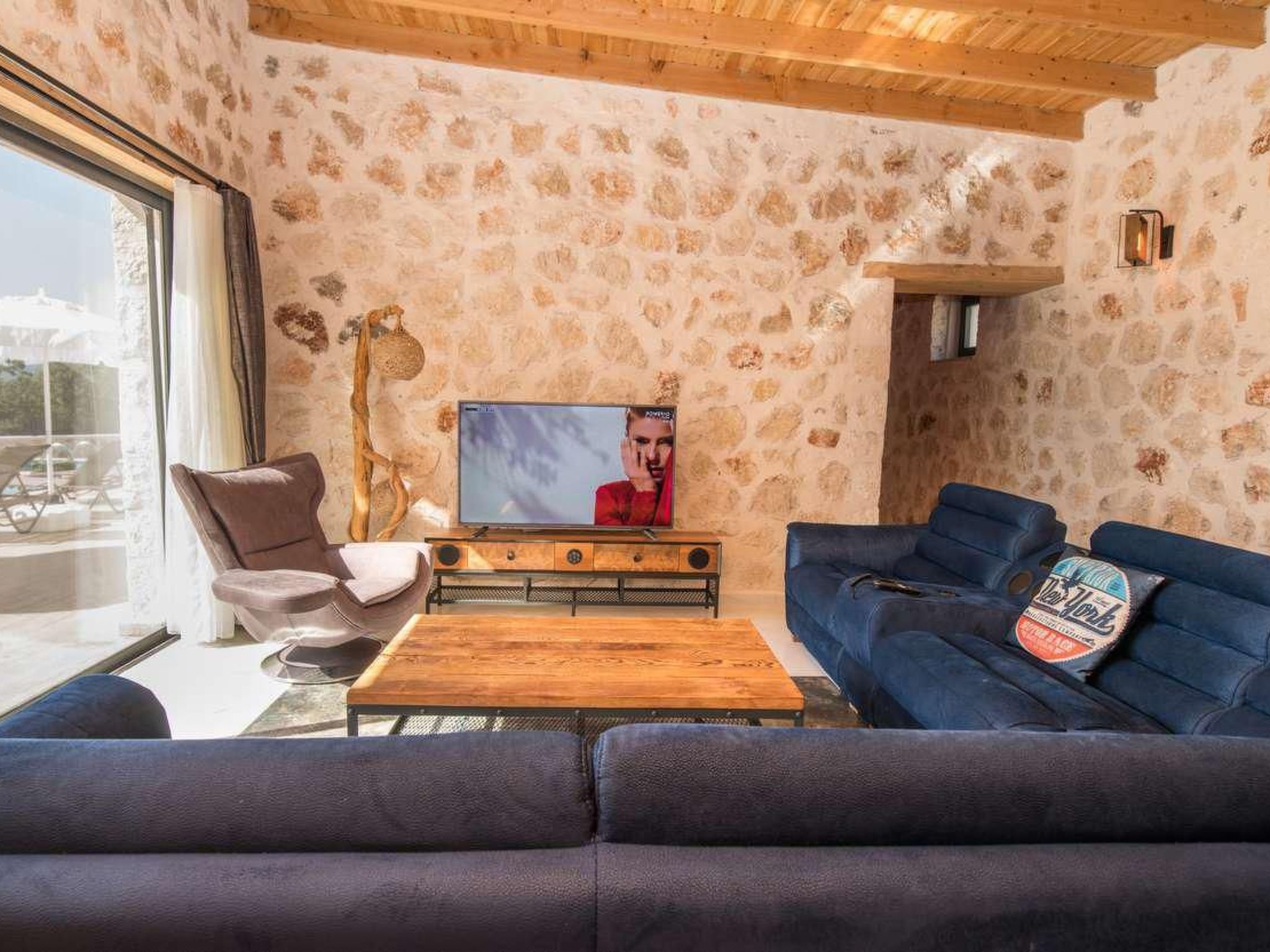 Die Villa ist ein Meisterwerk der traditionellen Architektur, erbaut aus Natursteinen, die perfekt mit der umgebenden Landschaft verschmelzen. Das Interieur ist elegant und stilvoll gestaltet, wobei rustikale Elemente wie Holzbalken und handgefertigte Möbel eine gemütliche und einladende Atmosphäre schaffen.