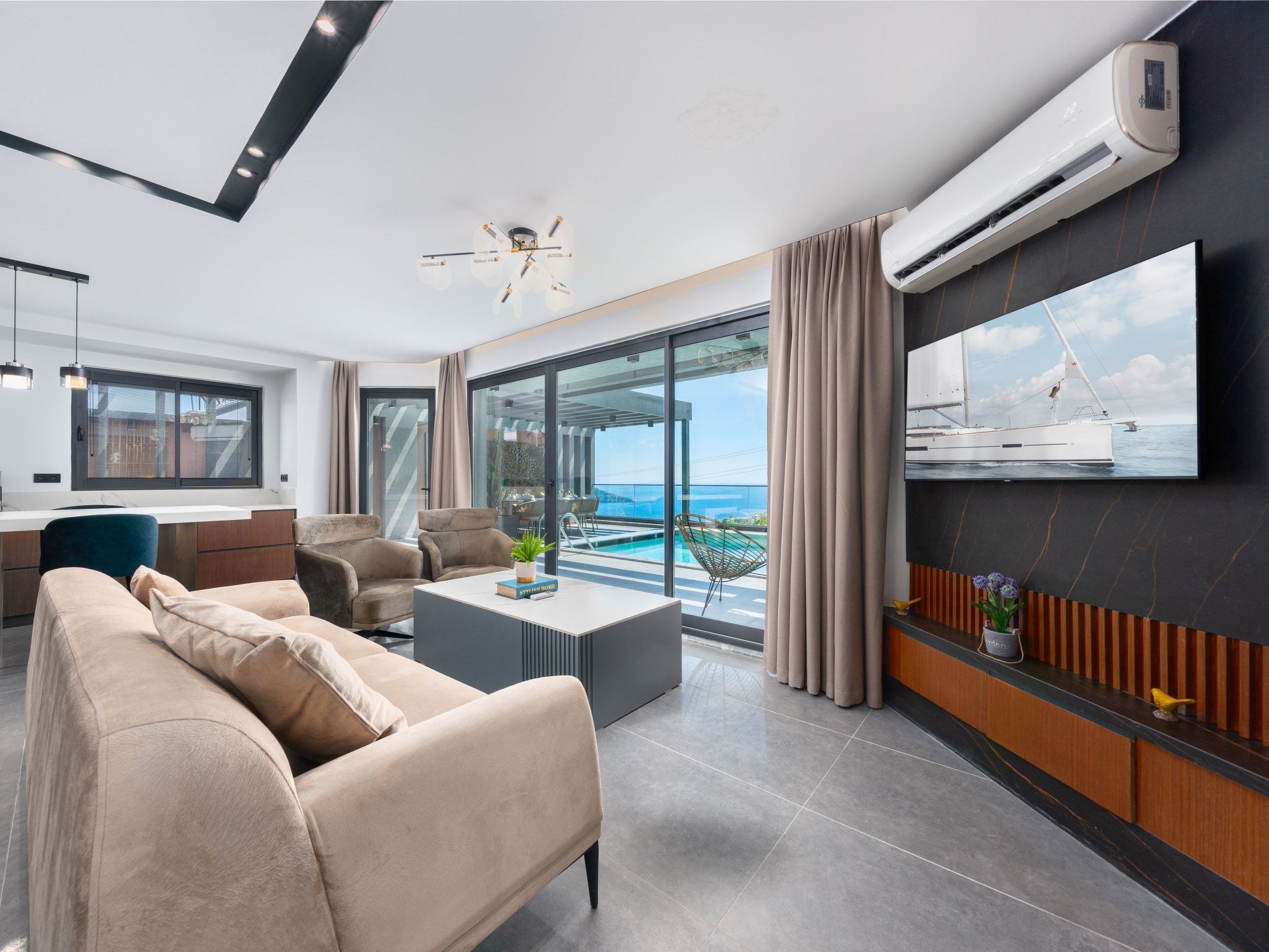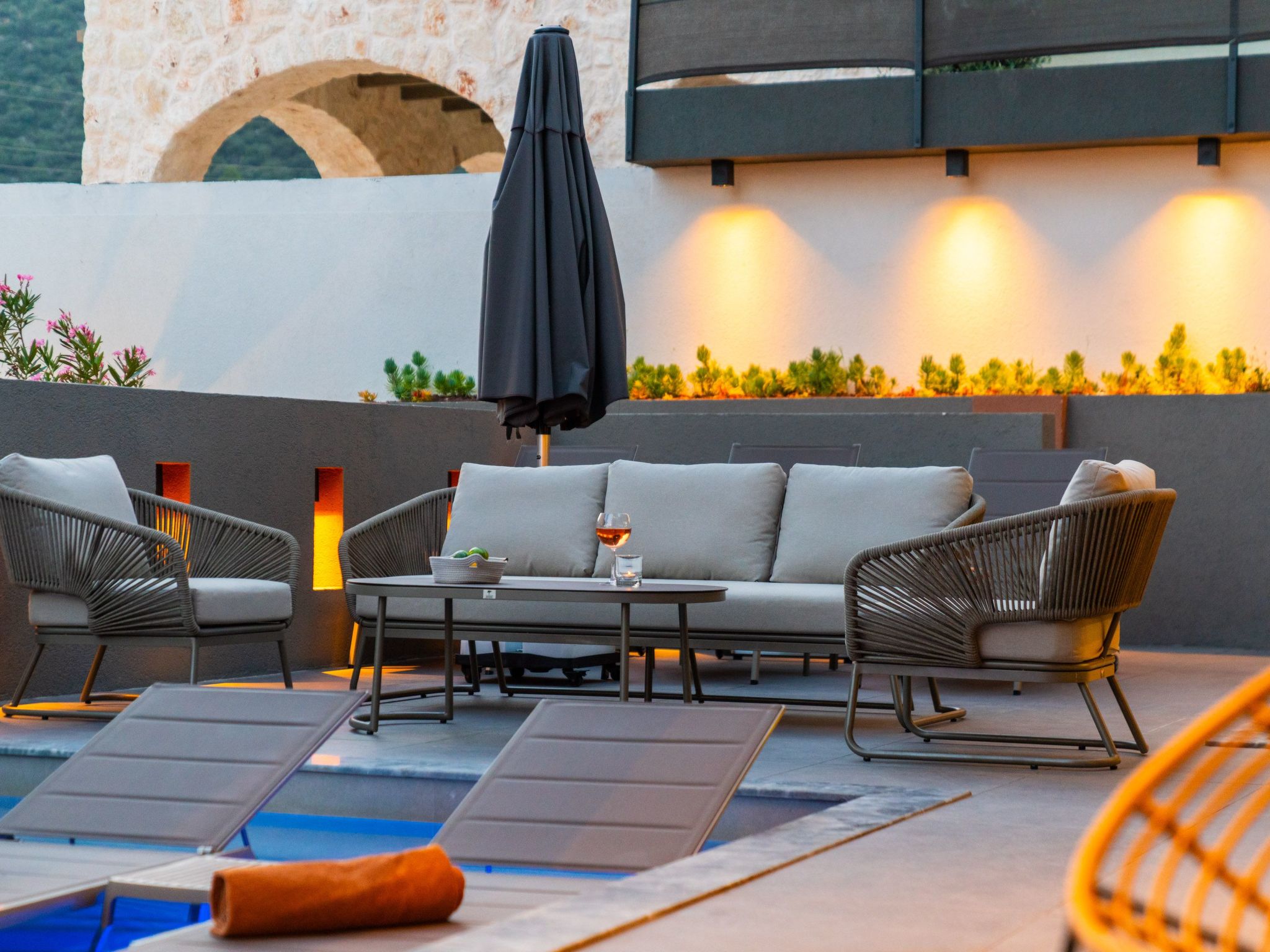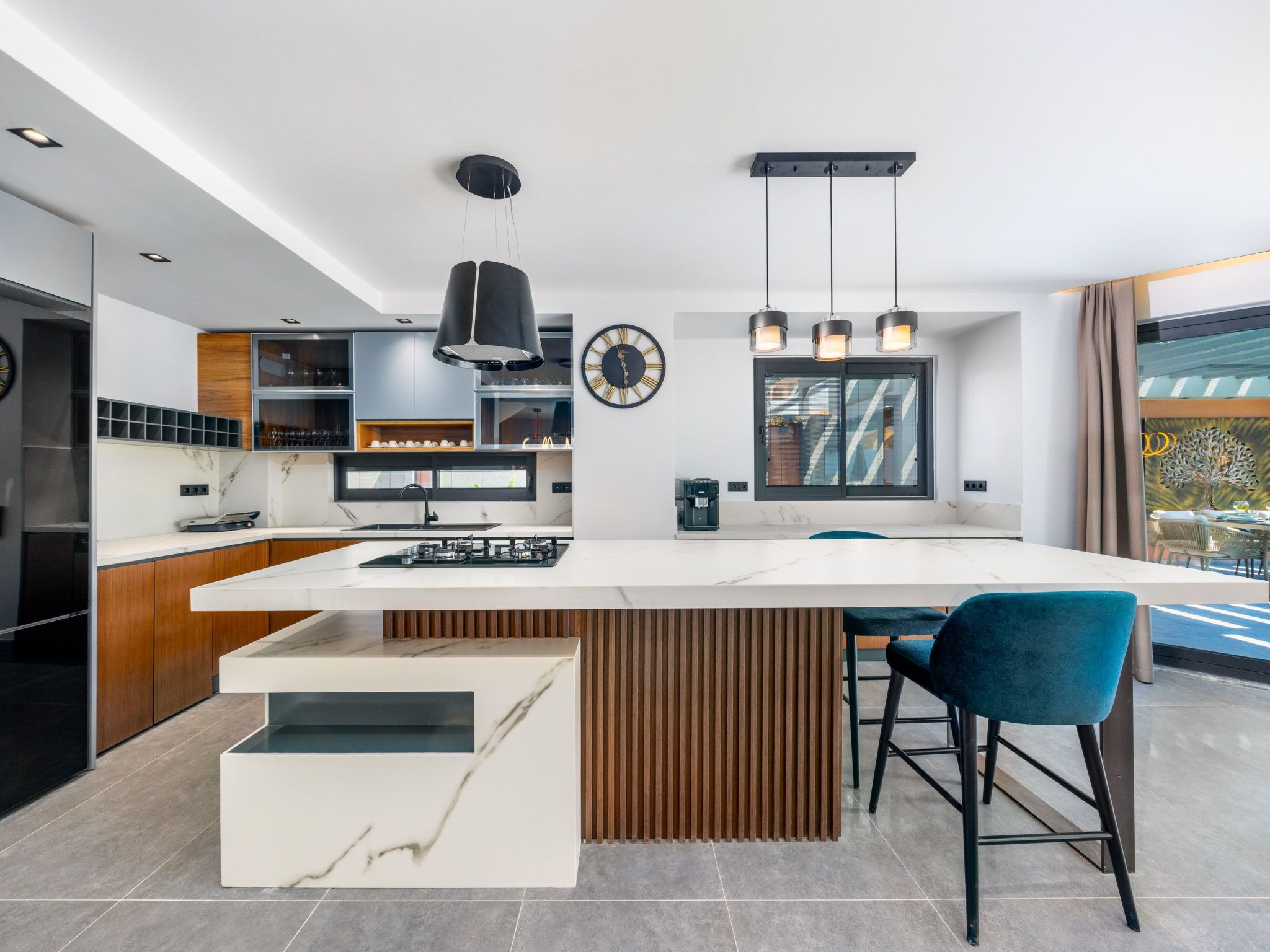 Im Außenbereich lädt ein exklusiver Pool zur alleinigen Nutzung ein, der perfekte Ort, um sich unter der Sonne Anatoliens zu entspannen. Die großzügige Terrasse und der umliegende Garten sind ideal, um die Ruhe und Schönheit der Natur in privater Atmosphäre zu genießen. Eine Dachterrasse bietet zusätzlichen Raum im Freien und ergänzt die Vielfalt der Möglichkeiten, in denen Sie Ihre Tage verbringen können.