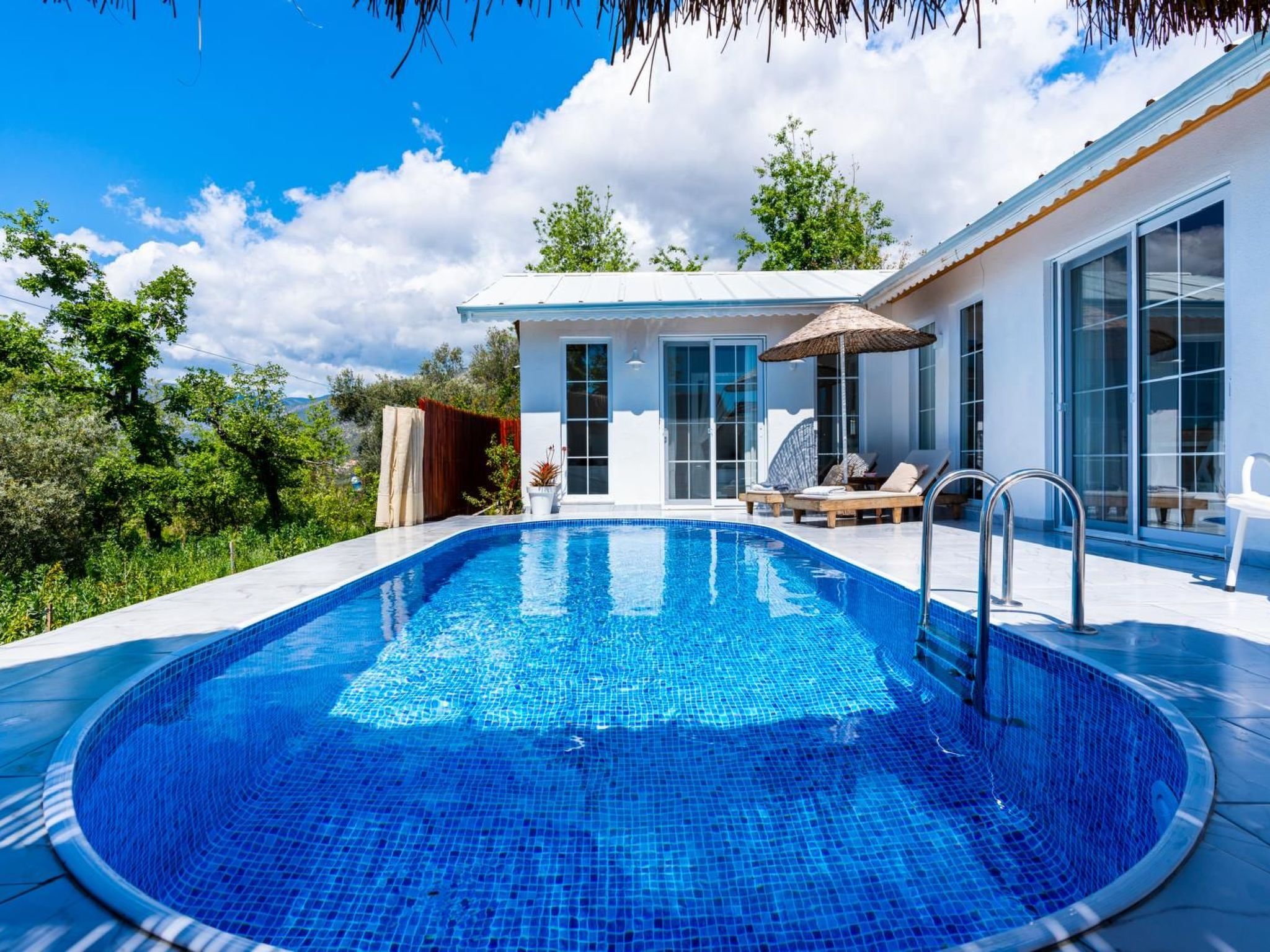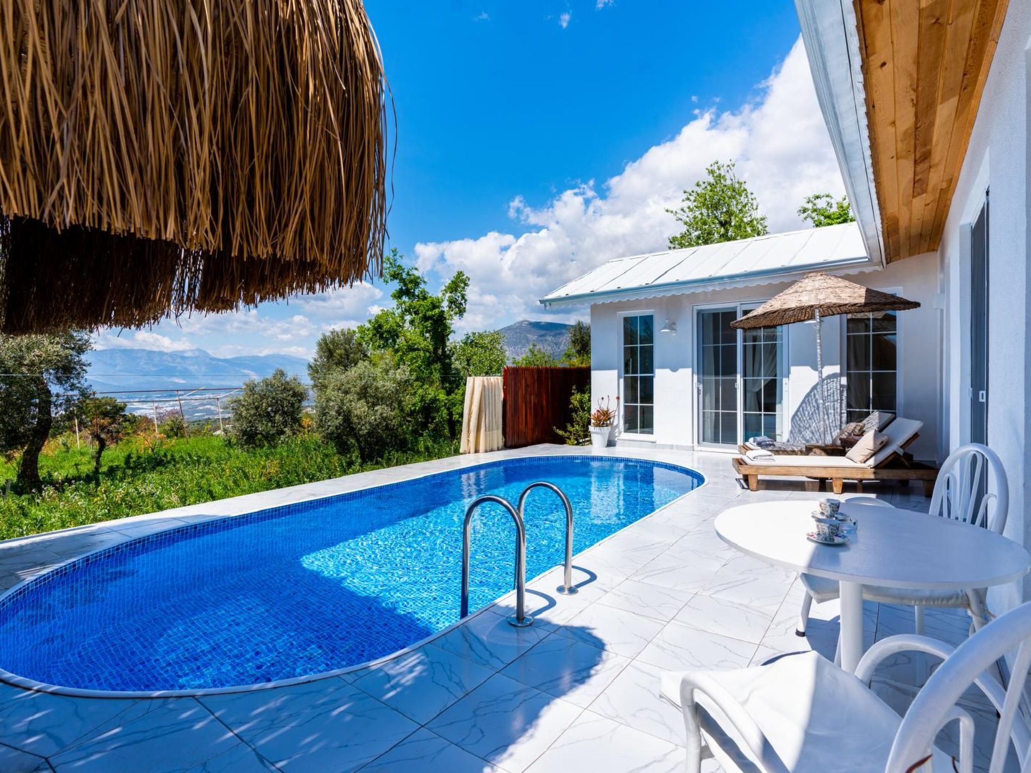 Das Außengelände des Ferienhauses lädt zum Entspannen ein. Der private Garten ist ein ruhiger Rückzugsort, während Sie den eigenen Pool zur Erfrischung nutzen können. Auf der Terrasse lassen sich wunderbare Stunden im Freien verbringen, sei es beim Essen, Lesen oder einfach nur beim Genießen der Ruhe.