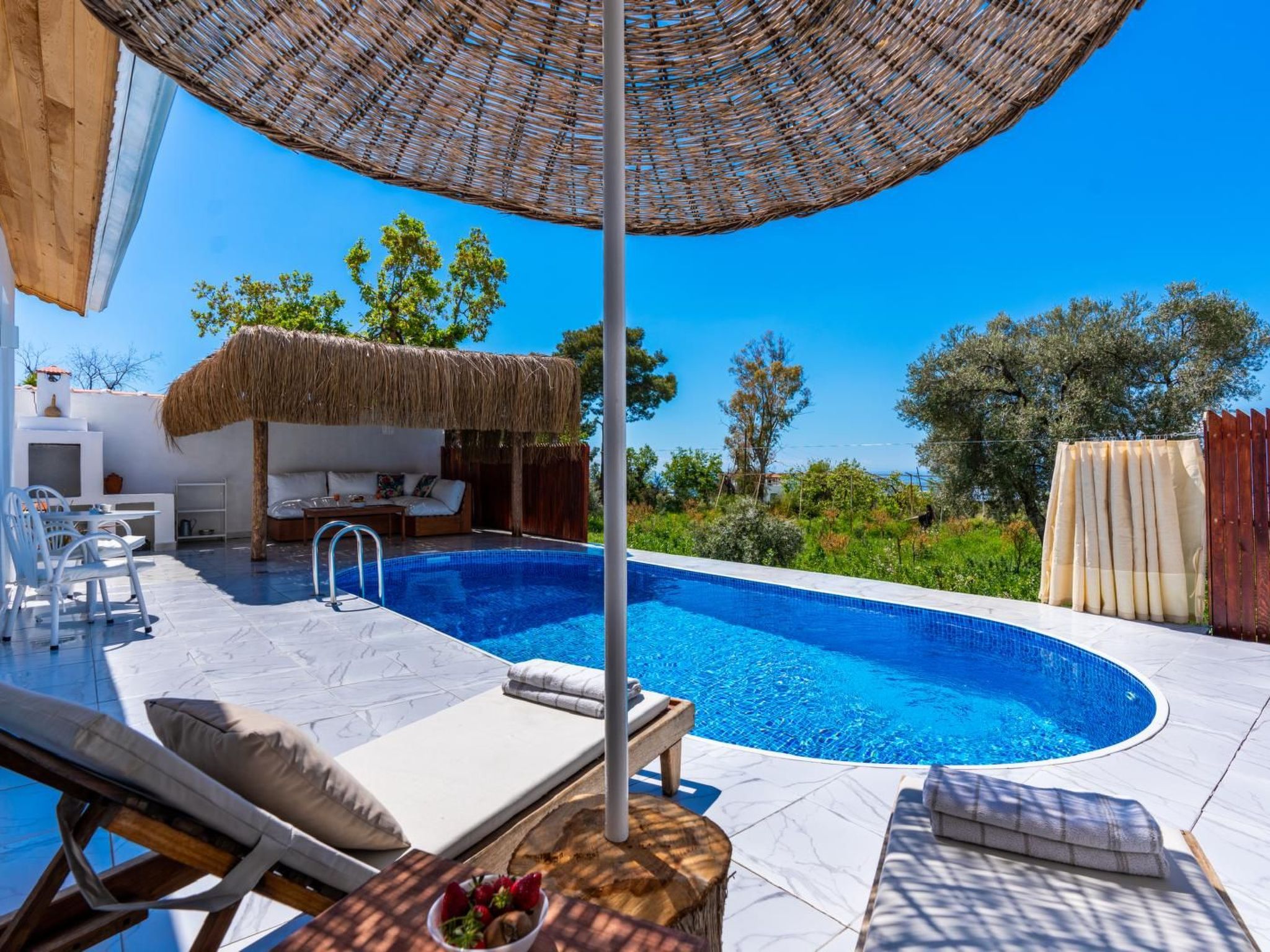 Die Umgebung von Üzümlü bietet reichlich Gelegenheiten für Unternehmungen. Trotz der ruhigen Lage des Hauses erreichen Sie innerhalb von kurzer Zeit den Lebensmittelhandel (2km) für die täglichen Besorgungen oder den Strand (10km) für sonnige Tage am Meer. Der Hinweis auf einen Mietwagen unterstreicht die Flexibilität, mit der Sie die Hügel und die natürliche Landschaft der Region erkunden können.
