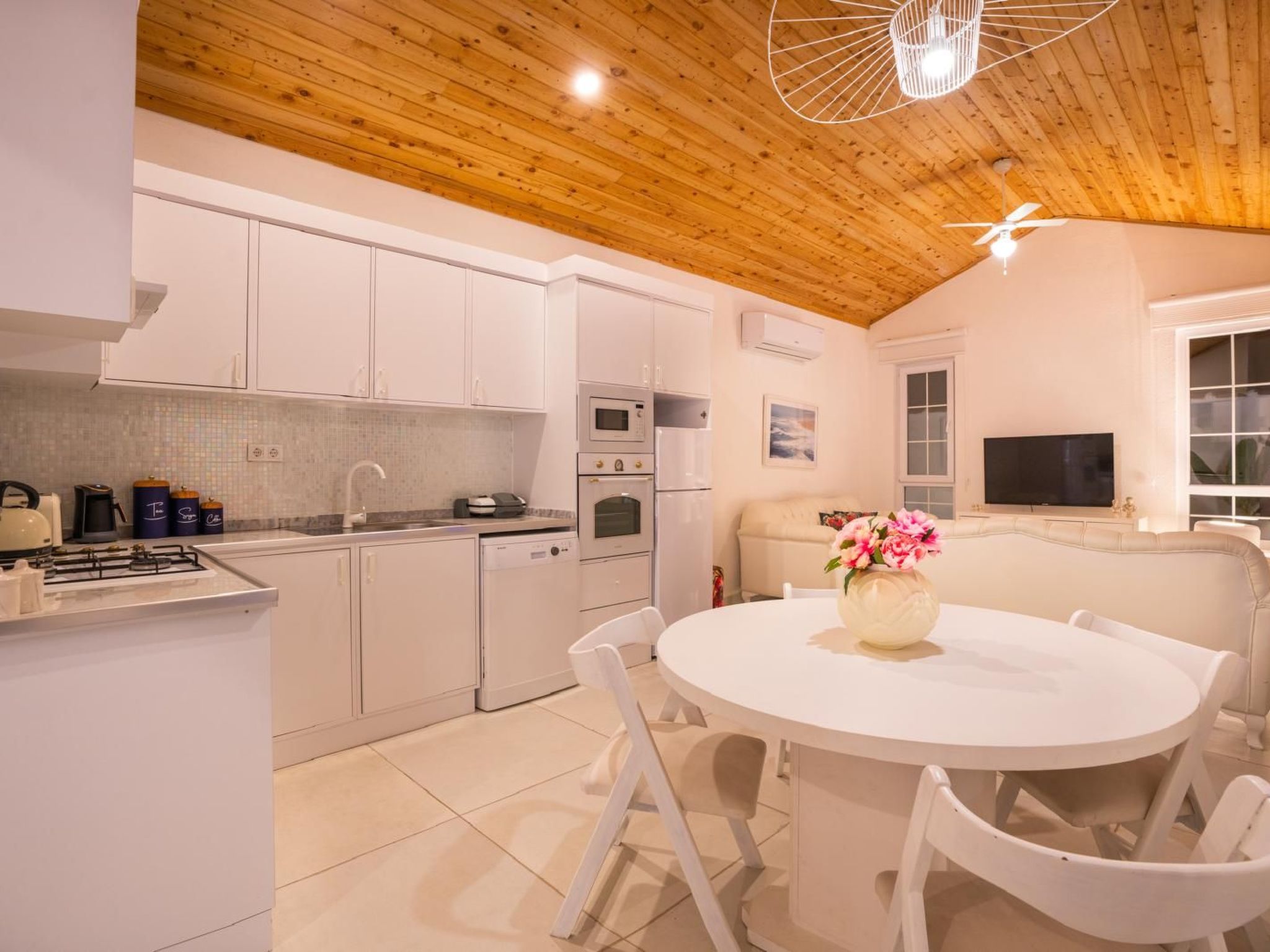 Im Inneren des Ferienhauses finden Sie alles, was Sie für einen komfortablen Aufenthalt benötigen. Eine gut ausgestattete Küche mit Gasherd, Spülmaschine und Wasserkocher steht Ihnen zur Verfügung. Für Ihr weiteres Wohlergehen sorgt die Klimaanlage, die in allen Räumen eine angenehme Temperatur sichert. Eine Waschmaschine für die alleinige Nutzung ist ebenso vorhanden, sodass Sie auch für längere Aufenthalte bestens ausgerüstet sind.