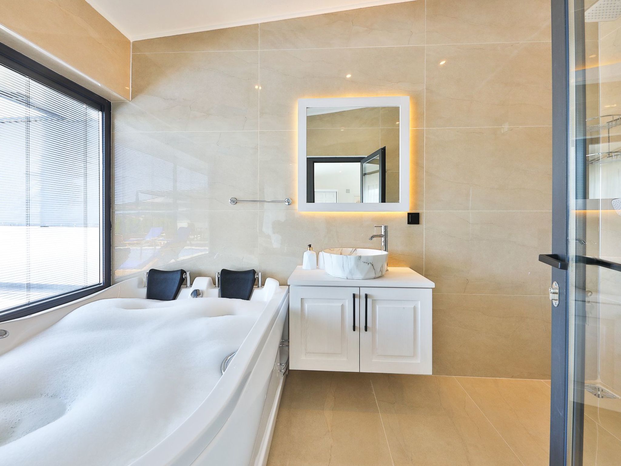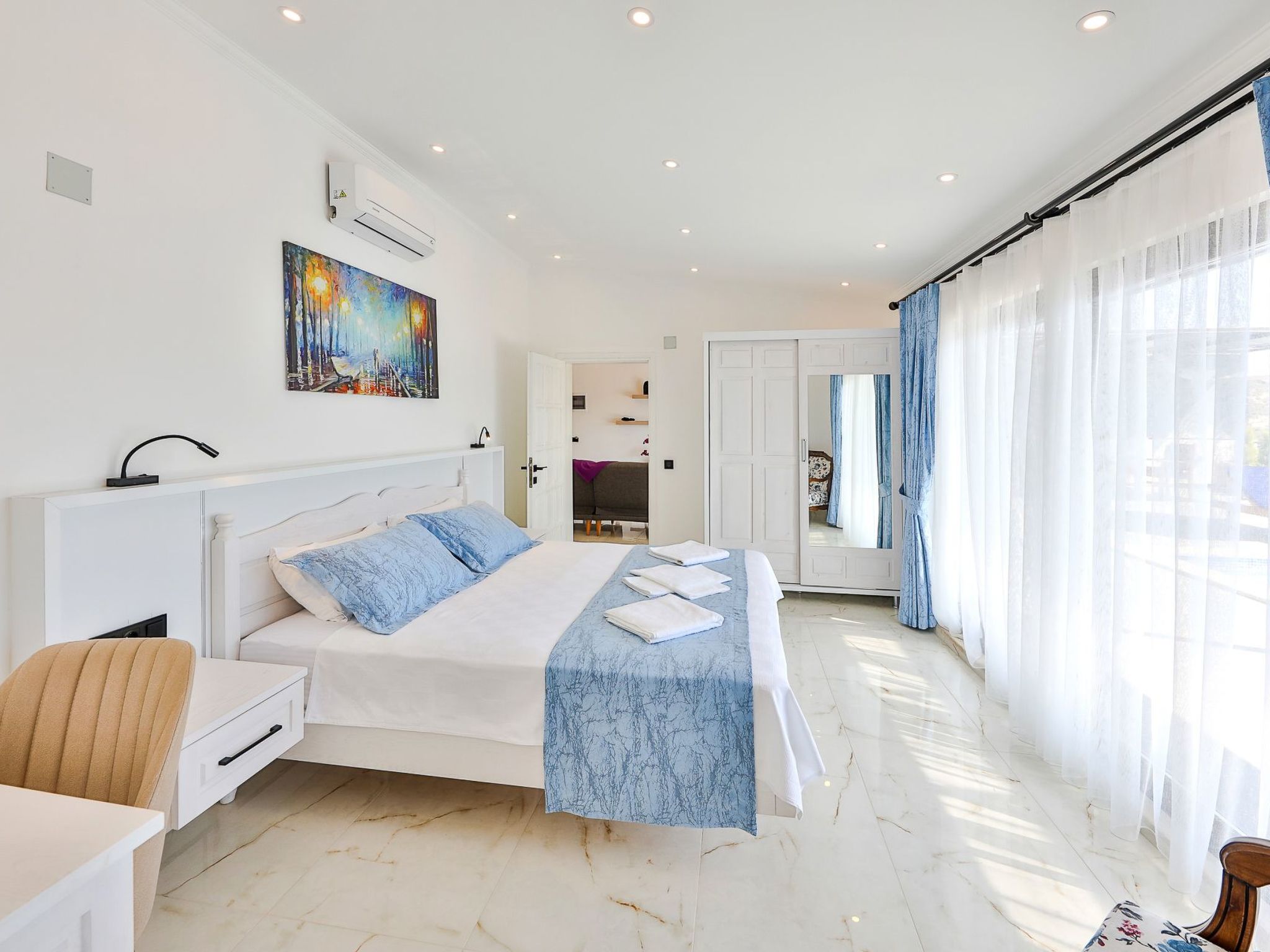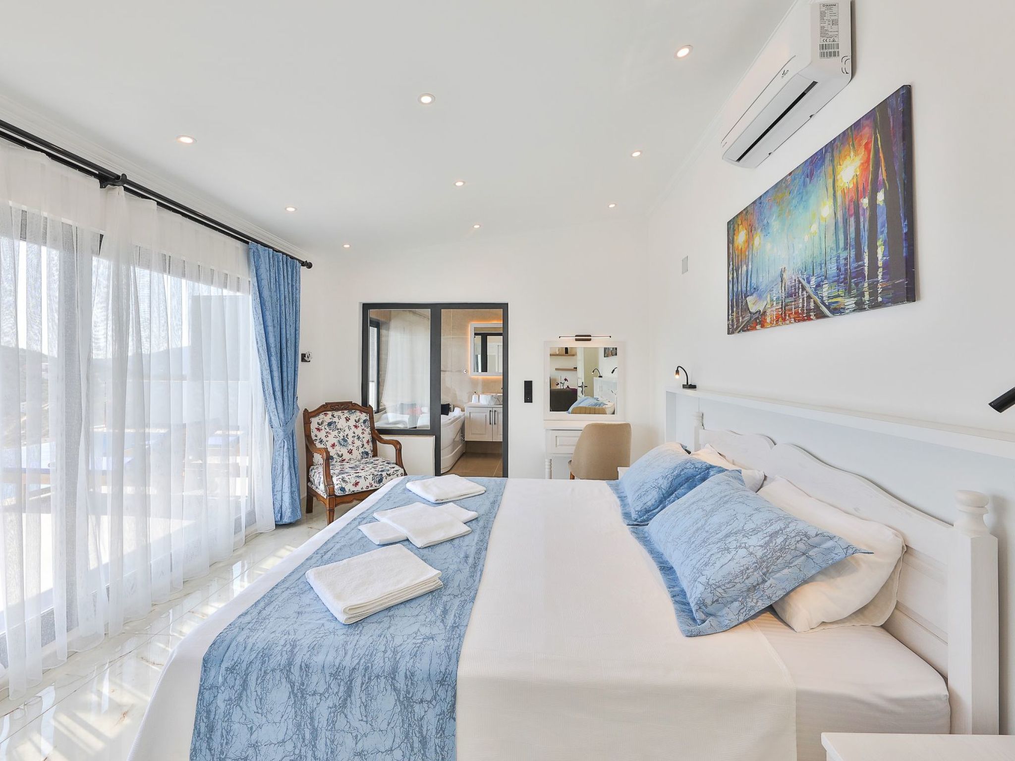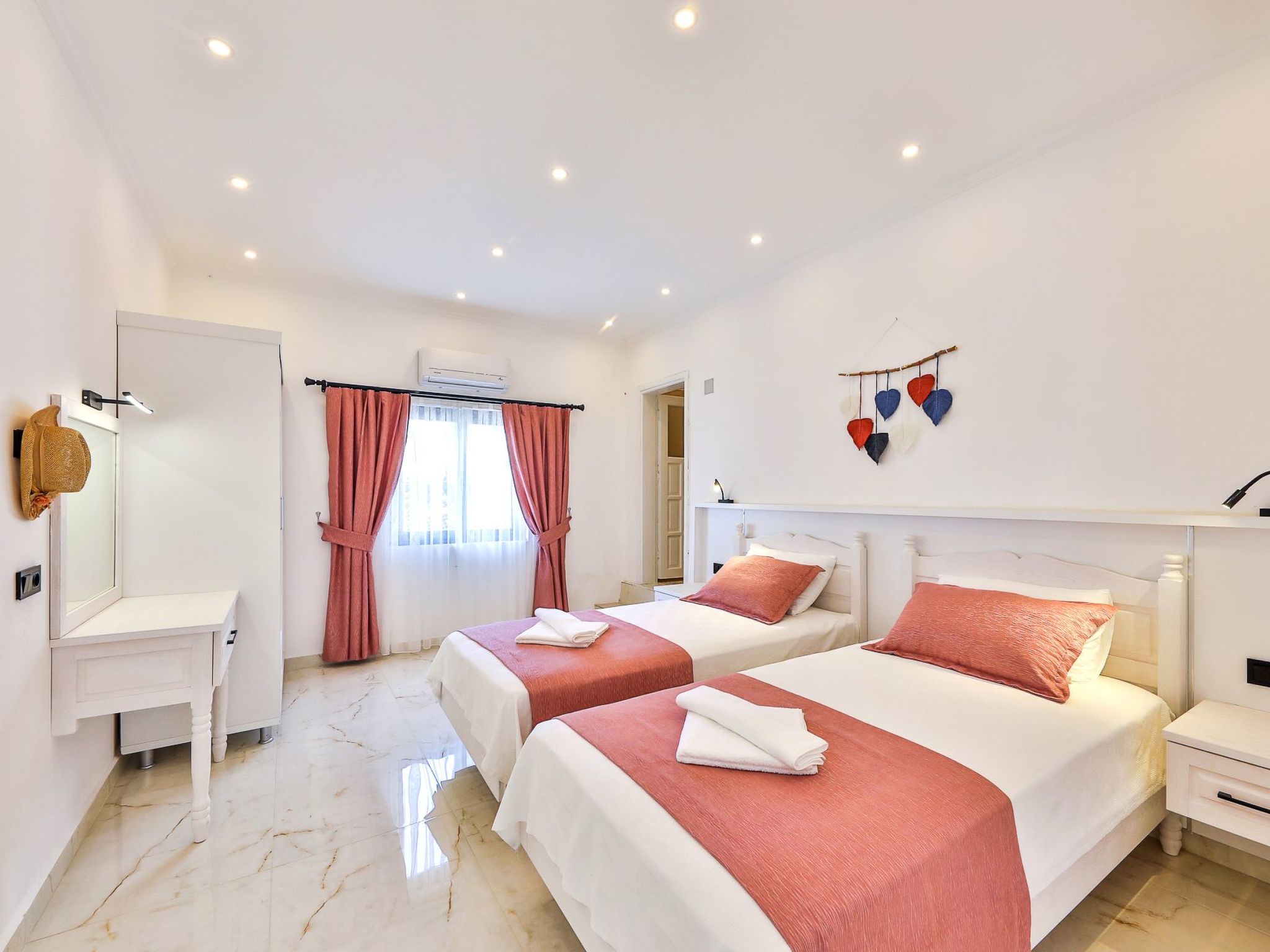 Im Inneren des Ferienhauses erwarten Sie alle Annehmlichkeiten, die Sie für einen komfortablen Aufenthalt benötigen. Zwei gemütliche Schlafzimmer bieten nach einem Tag voller Abenteuer Ruhe und Erholung. Zwei Badezimmer sorgen dafür, dass sich jeder Gast ohne Zeitdruck fertigmachen kann. Für zusätzlichen Komfort sorgen die Klimaanlage, die in der gesamten Villa verfügbar ist, eine Waschmaschine für Exklusivnutzung, sowie eine gut ausgestattete Küchenzeile mit einer Kaffeemaschine, einem Wasserkocher, einem Minibackofen und einer Spülmaschine. Diese Einrichtung macht das Ferienhaus zu einem wahren Zuhause fern von zuhause.