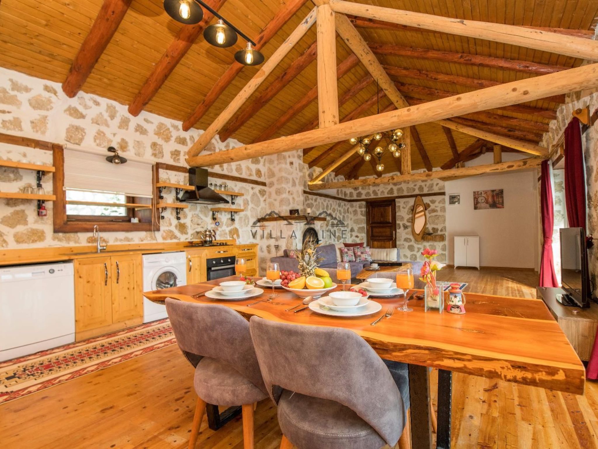 Die Villa verfügt über zwei Schlafzimmer, ein geräumiges Wohnzimmer mit einem offenen Kamin und eine voll ausgestattete Küche, die perfekt ist, um lokale Köstlichkeiten zuzubereiten. Draußen erwartet Sie eine malerische Terrasse mit Gartenmöbeln, auf der Sie Ihre Mahlzeiten im Freien genießen können, während Sie den Blick auf die majestätischen Berge bewundern.