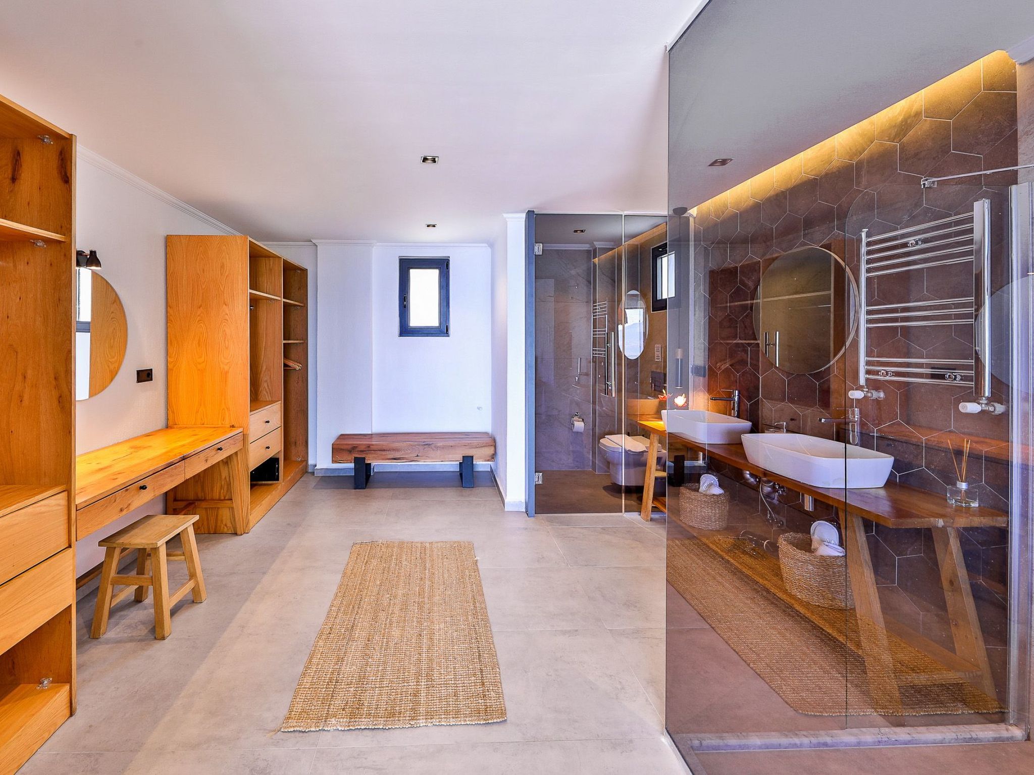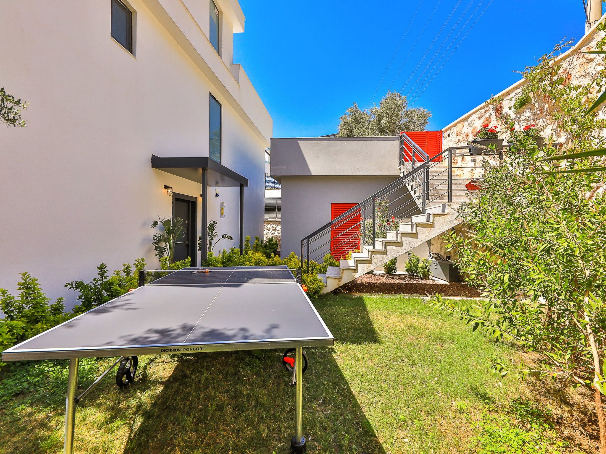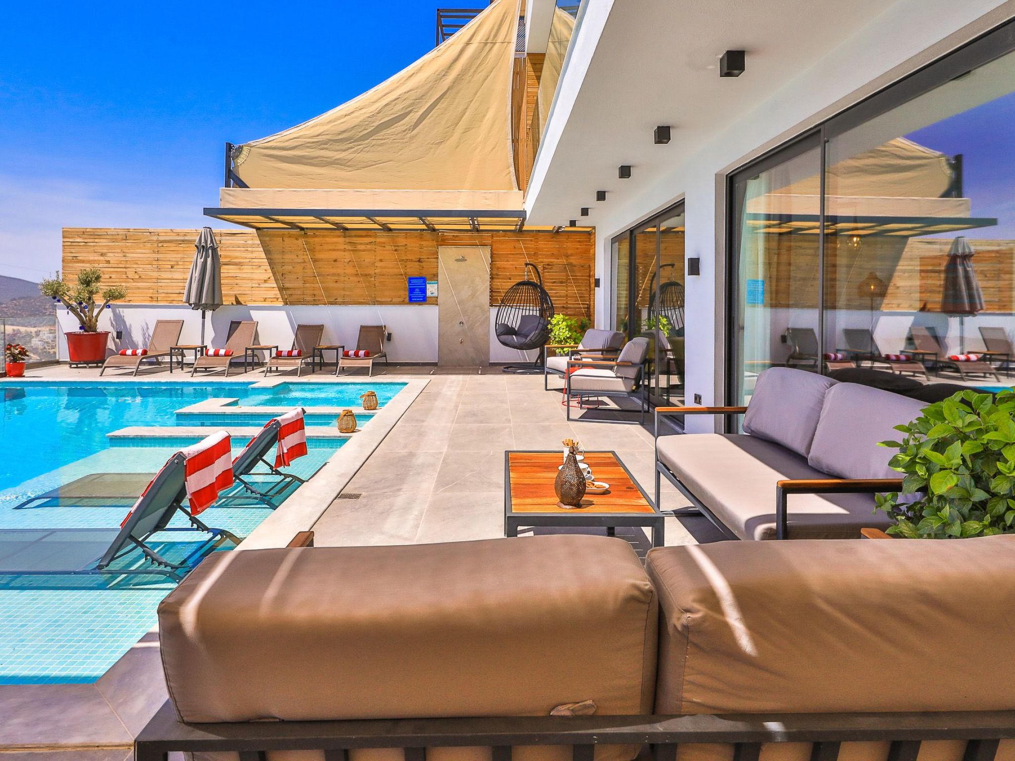 Das äußerliche Erscheinungsbild des Hauses wird durch seine großzügige Poolterrasse geprägt, welche exklusiv den Gästen zur Verfügung steht. Hier lässt sich in völliger Privatsphäre entspannen und die Sonne genießen. Zusätzlich laden der private Garten und einladende Außenbereiche wie die Terrasse oder der Balkon dazu ein, die Tage und Abende im Freien zu verbringen und das milde Klima Anatoliens in vollen Zügen auszukosten.