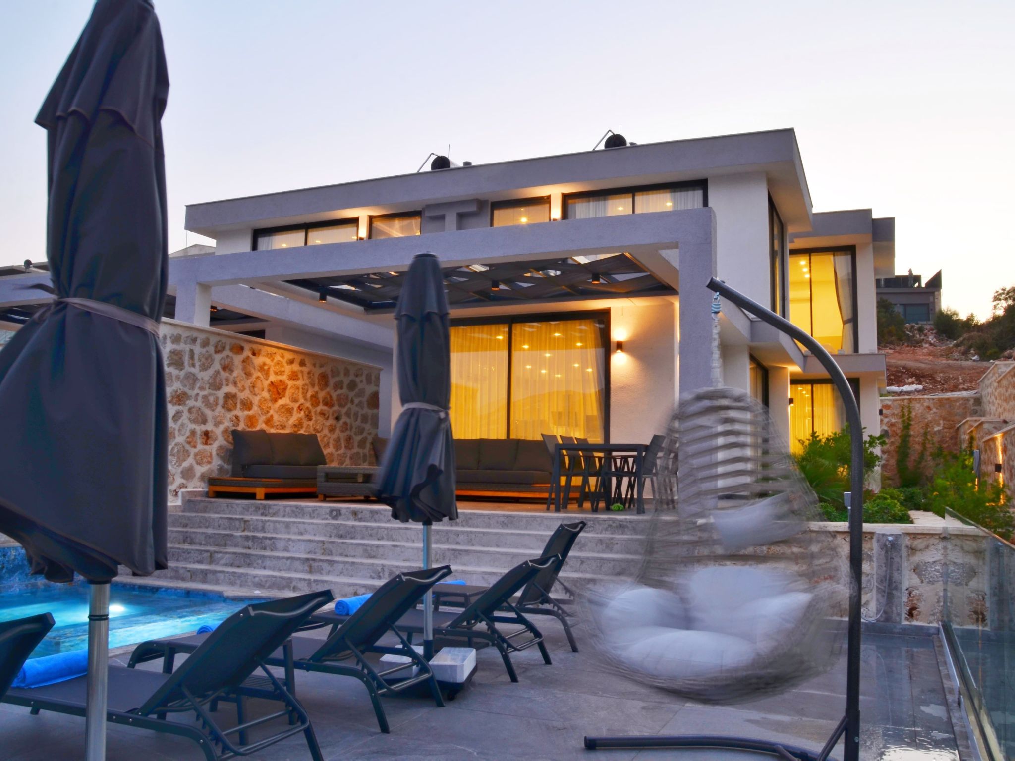 Außenbereich: Der großzügige Außenbereich umfasst eine wunderschön angelegte Terrasse, ideal für Mahlzeiten im Freien, sowie bequeme Liegen am Pool, die zum Sonnenbaden einladen.