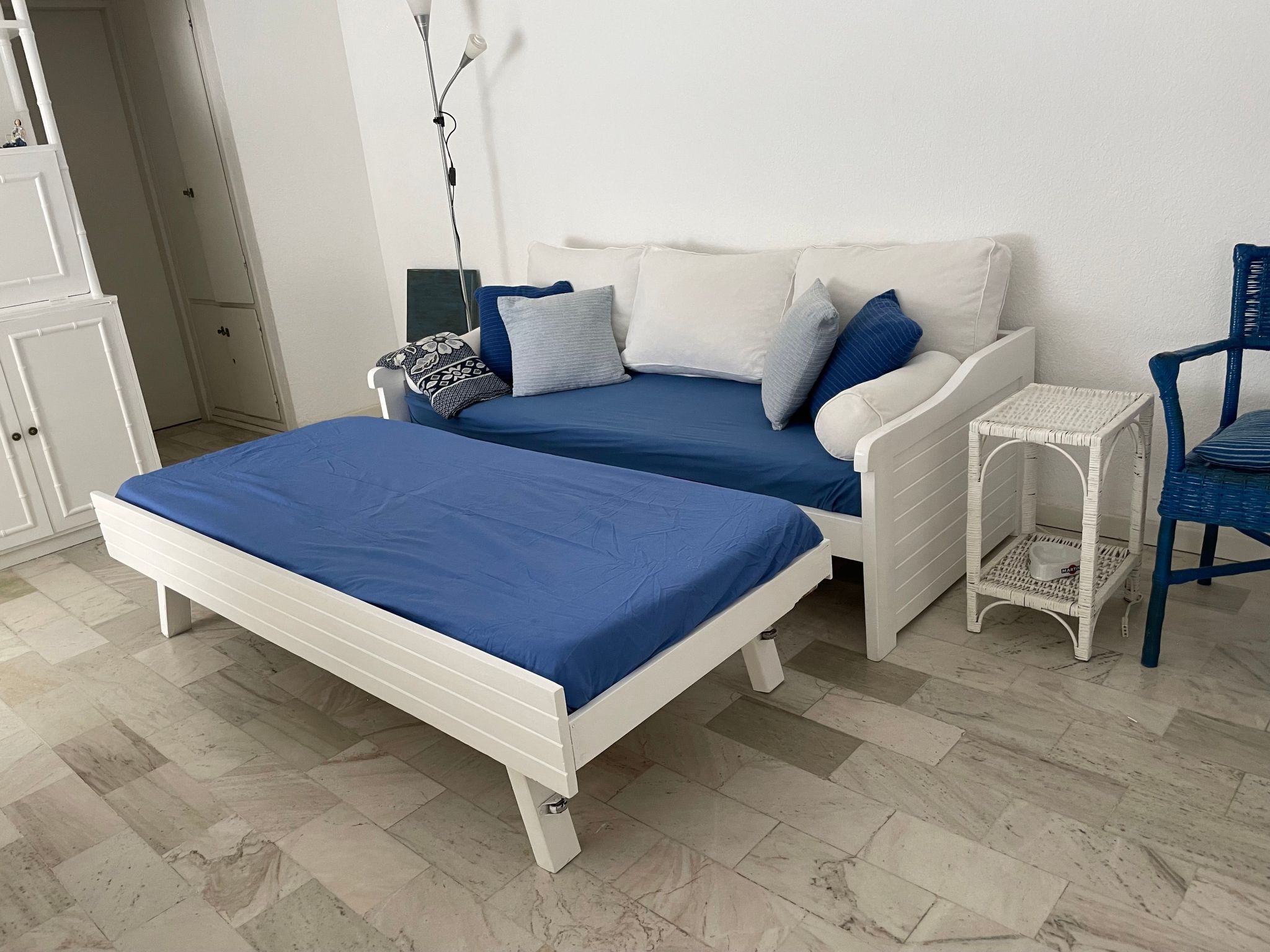 Die Wohnung ist für 4 Personen ausgestattet. Sie hat eine Fläche von 50 m2, 1 Schlafzimmer mit Doppelbett und Ventilator, ein Wohn-Esszimmer mit Tisch und 6 Stühlen, ein Schlafsofa für weitere 2 Personen, 1 Smart TV 32", Radio, CD-Player und Klimaanlage. Die Küche ist komplett ausgestattet mit Geschirr, Besteck, Kochutensilien, elektrischer Kaffeemaschine, Toaster, elektrischer Kanne, Mikrowelle, 4-Flammen-Herd mit elektrischem Backofen, Kühlschrank mit Gefrierfach, Bügeleisen, Küchentüchern und Tischtüchern. Das Badezimmer verfügt über eine Dusche mit Duschwand, WC, Bidet, Waschtisch, Spiegel und Schränke. Bettwäsche und Handtücher sind vorhanden, ebenso wie 2 Strandstühle.