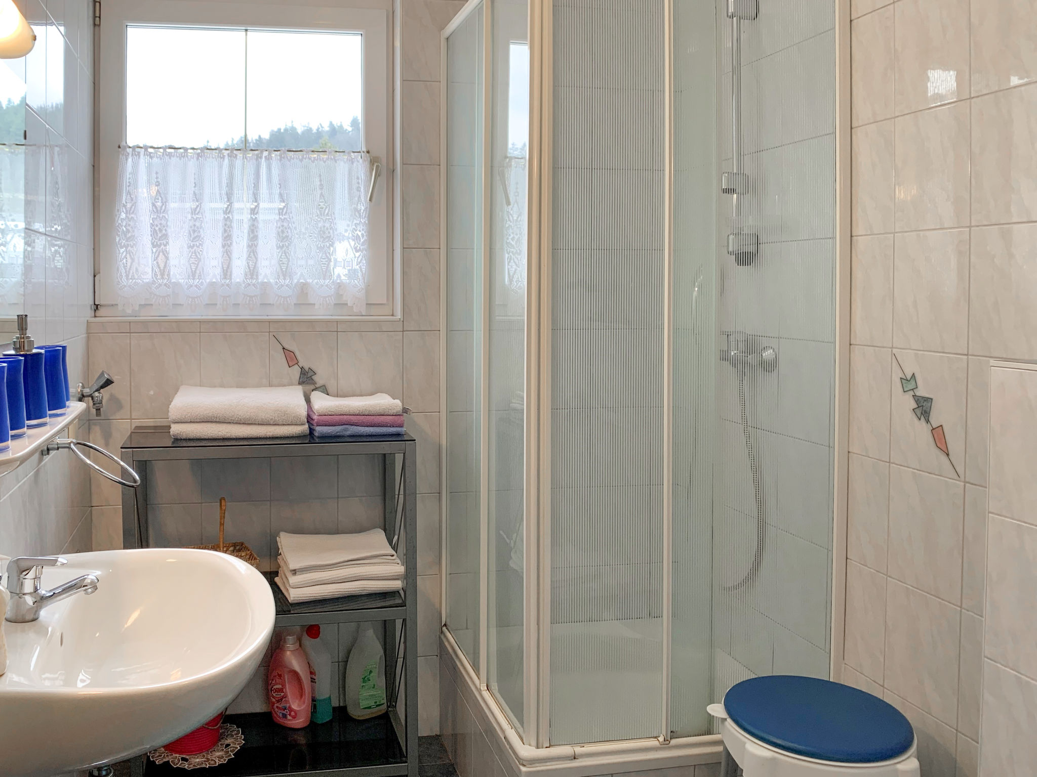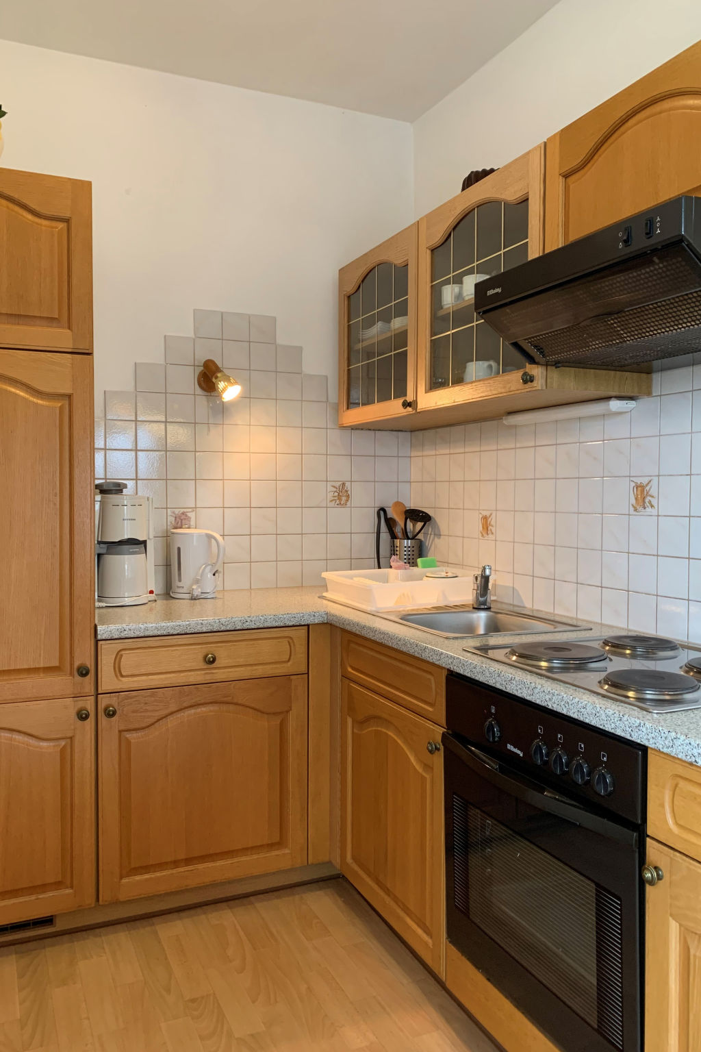 2-Zimmer-Wohnung, 1. Etage, ca. 56 m². Flur. Wohn-/Schlafraum mit Doppelbettcouch, Essplatz, Einbauküche (4 Platten, Backofen, Kühlschrank, Kaffeemaschine) und Ausgang zu Südbalkon. Doppelzimmer mit Ausgang zu Balkon. Dusche/WC.