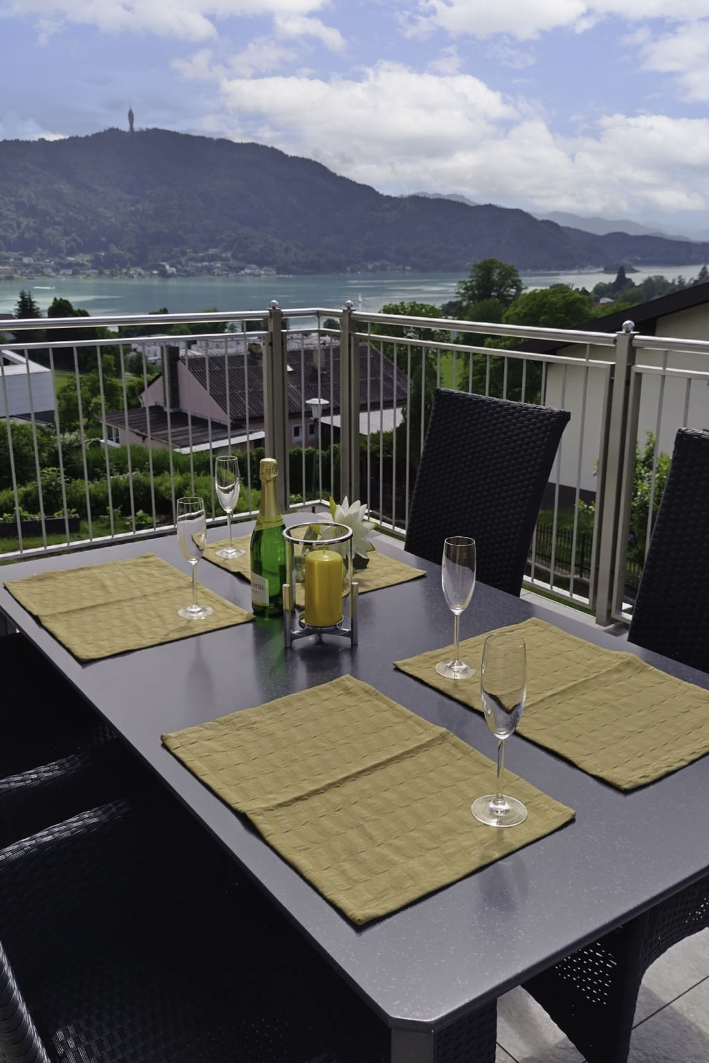 Haus MERAN steht in herrlicher Aussichtslage über dem Wörthersee, auf einem ca. 2000 m² großen Grundstück. Ca. 800 m entfernt das Saalacher Freibad (kostenlos). Ortsmitte Pörtschach 2,5 km. Restaurant ca. 700 m, Geschäfte 2 km. Bootsvermietung, Tennisplätze und Surfschule 1,5 km. Kleine Liegewiese mit Freisitzmöglichkeit, Gartenmöbeln, Grill und Tischtennis. Parkplätze beim Haus. PTS 120 mit großem Südbalkon (ca. 12 m², Mobiliar und 2 Sonnenliegen) und kleinem überdachten Balkon. PTS 121 mit möbliertem, überdachten Balkon. Jeweils schöner Blick auf den Wörthersee und den Pyramidenkogel. Die renovierten Wohnungen sind hell und freundlich eingerichtet. Sat-TV und Radio. Internetzugang (WLAN, € 10 pro Woche). Heizung.