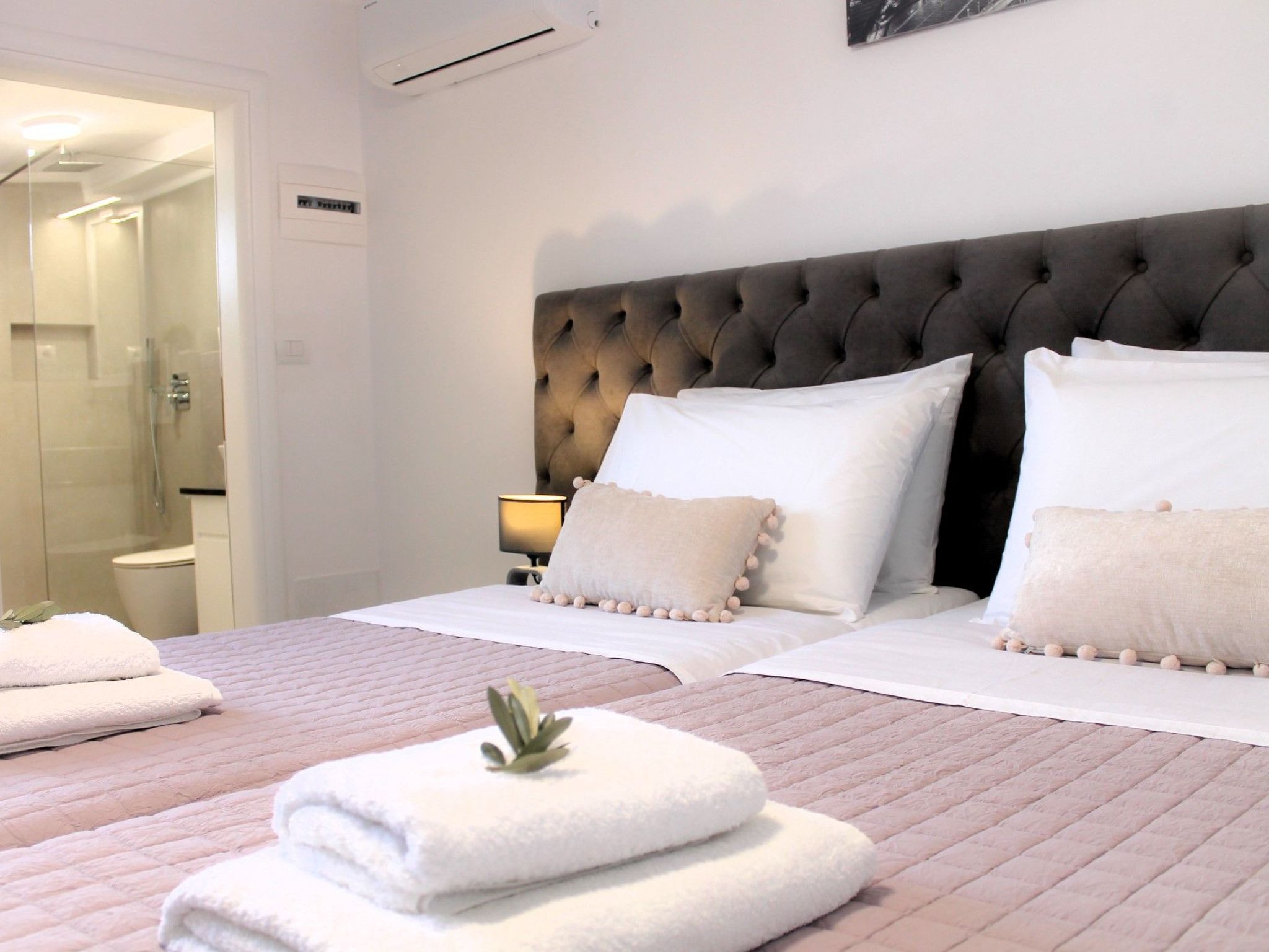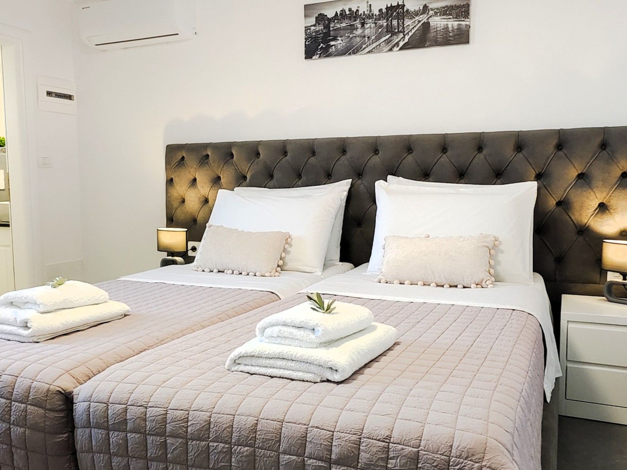 Schlafzimmer 2: Ein Doppelbett, das leicht in zwei Zwillinge umgewandelt werden kann, mit eigenem Bad.