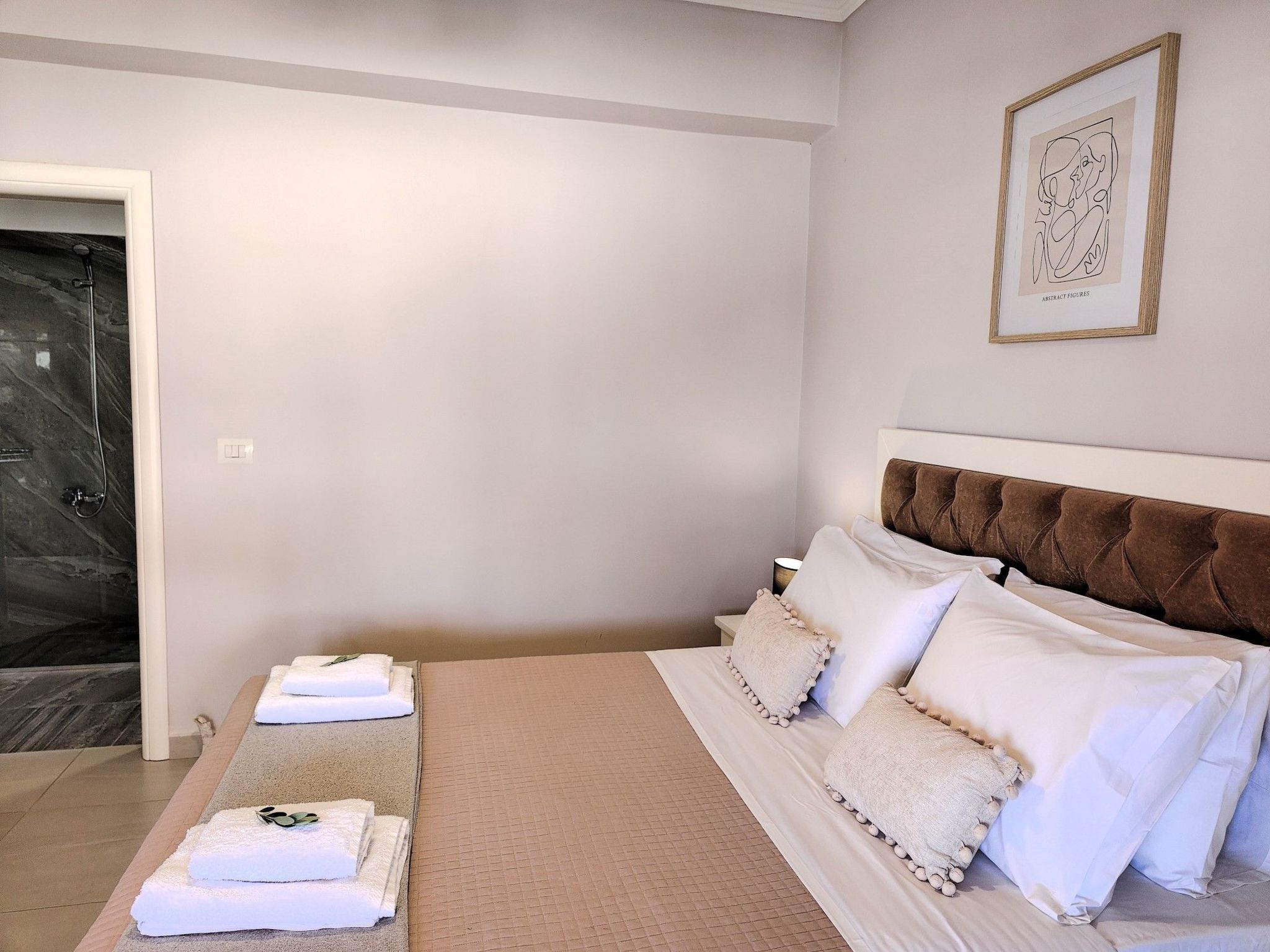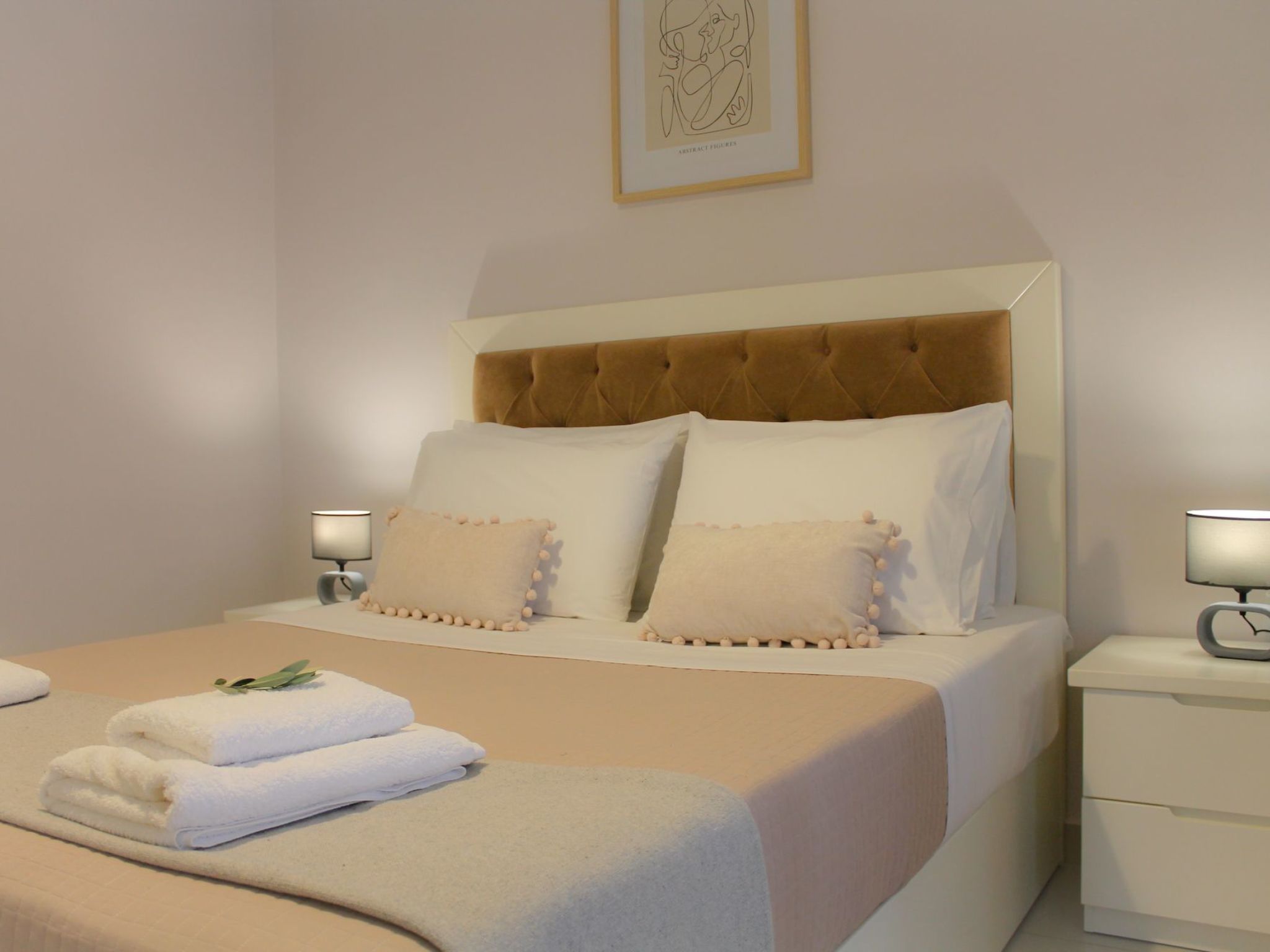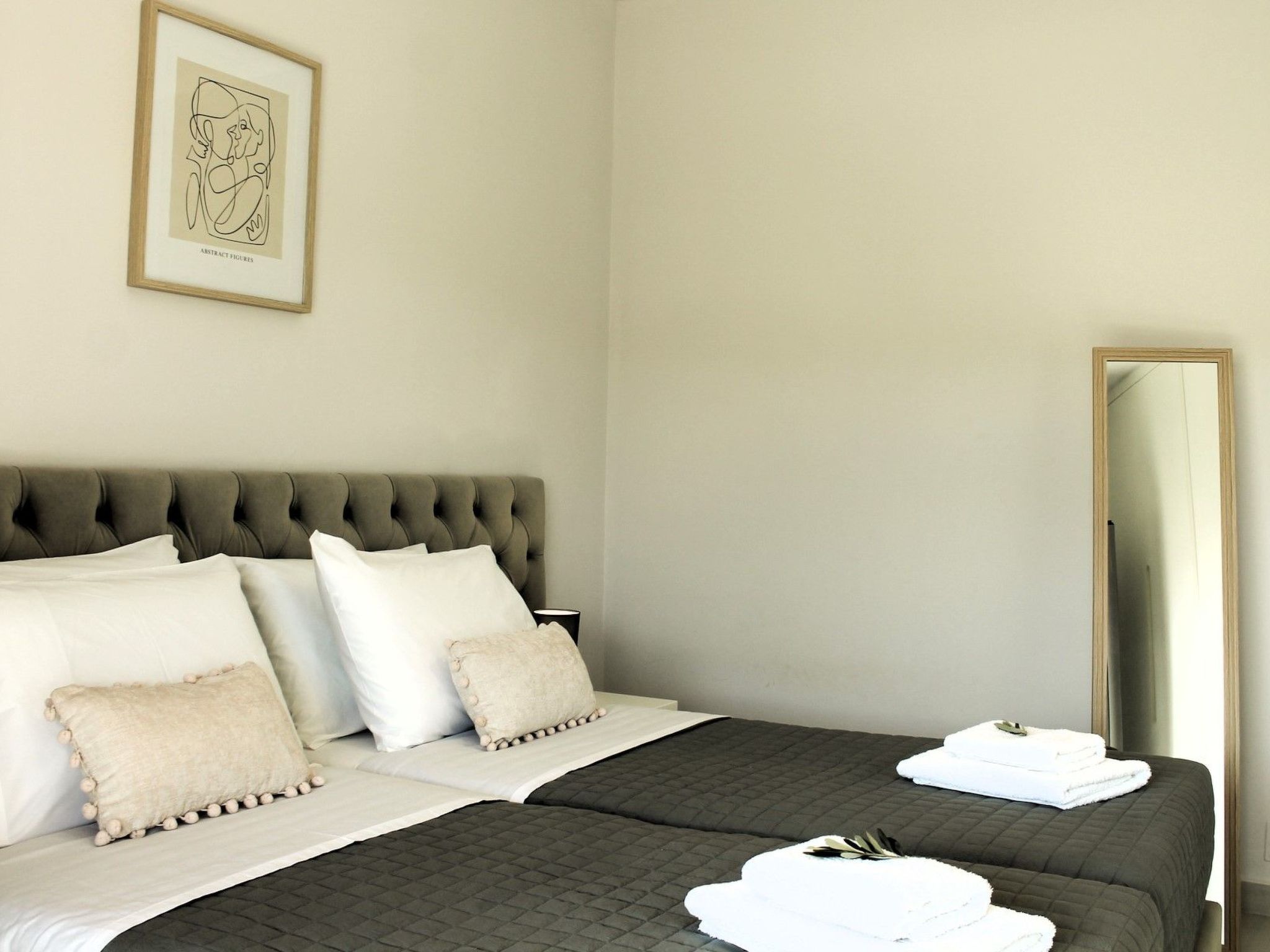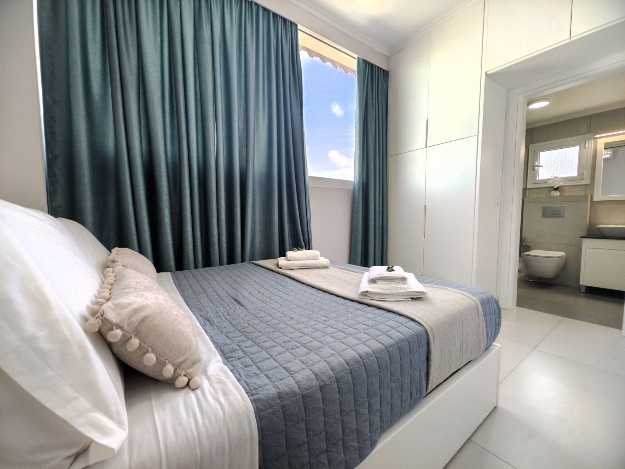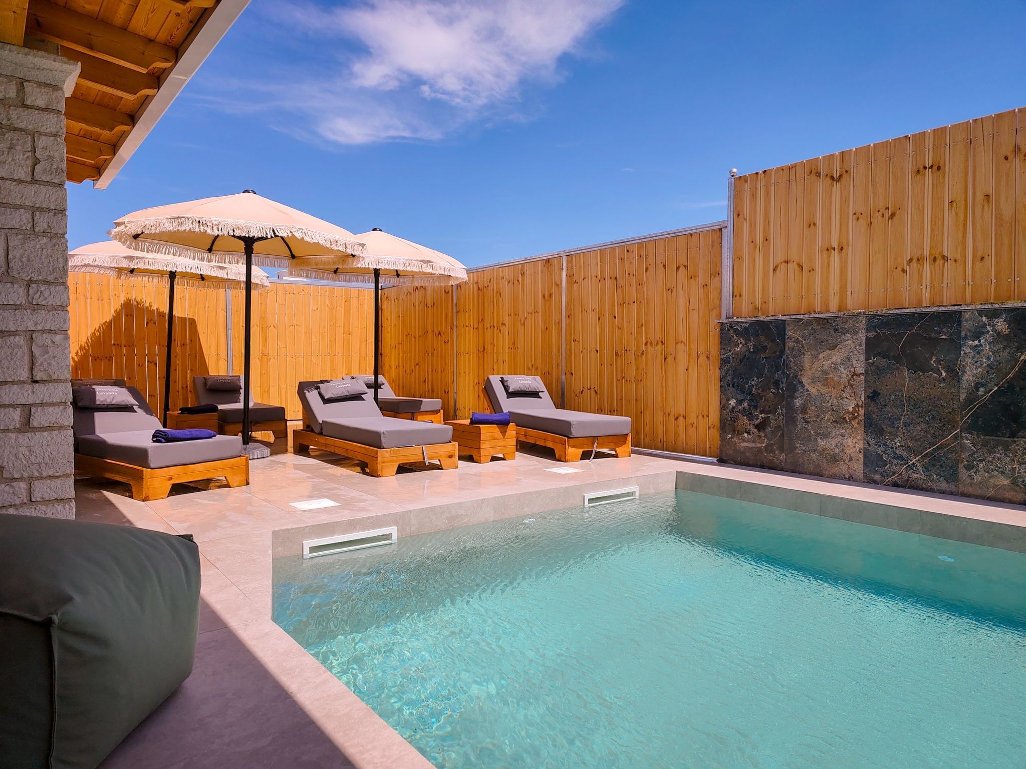 Jedes der vier exquisit gestalteten Schlafzimmer der Luxury Villa Levanda strahlt durchdachten Komfort und zeitlose Eleganz aus. Im Erdgeschoss befindet sich ein Schlafzimmer mit eigenem Bad, TV und Klimaanlage - ein idyllischer Rückzugsort für eine erholsame Nachtruhe. Im Obergeschoss empfängt Sie ein modernes Wohnzimmer mit Plüschsofas und einem eleganten Esstisch. Die moderne Küche auf dieser Etage ist ein kulinarisches Paradies, ausgestattet mit modernsten Geräten für die Zubereitung köstlicher Mahlzeiten. Drei weitere Schlafzimmer befinden sich auf dieser Etage, zwei davon mit eigenem Bad und das dritte mit einem bequem zu erreichenden Bad direkt außerhalb des Raumes.