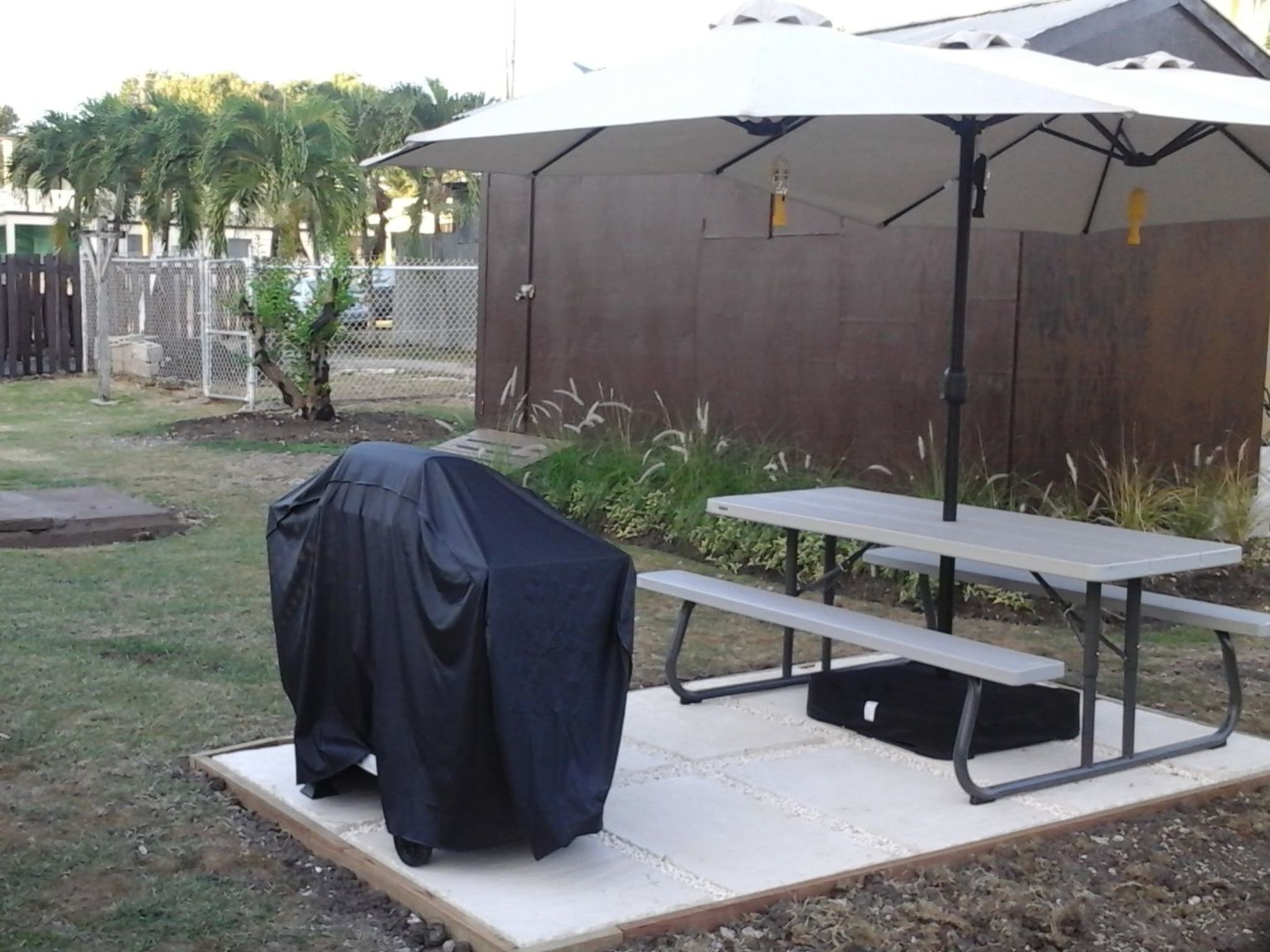 Kleine vordere Terrasse zum Sitzen und Kaffee trinken; auch Outdoor-BBQ-Picknick-Bereich mit Strand Liegestühle.