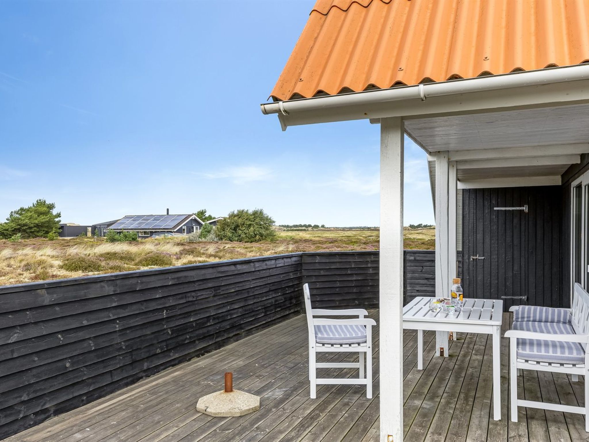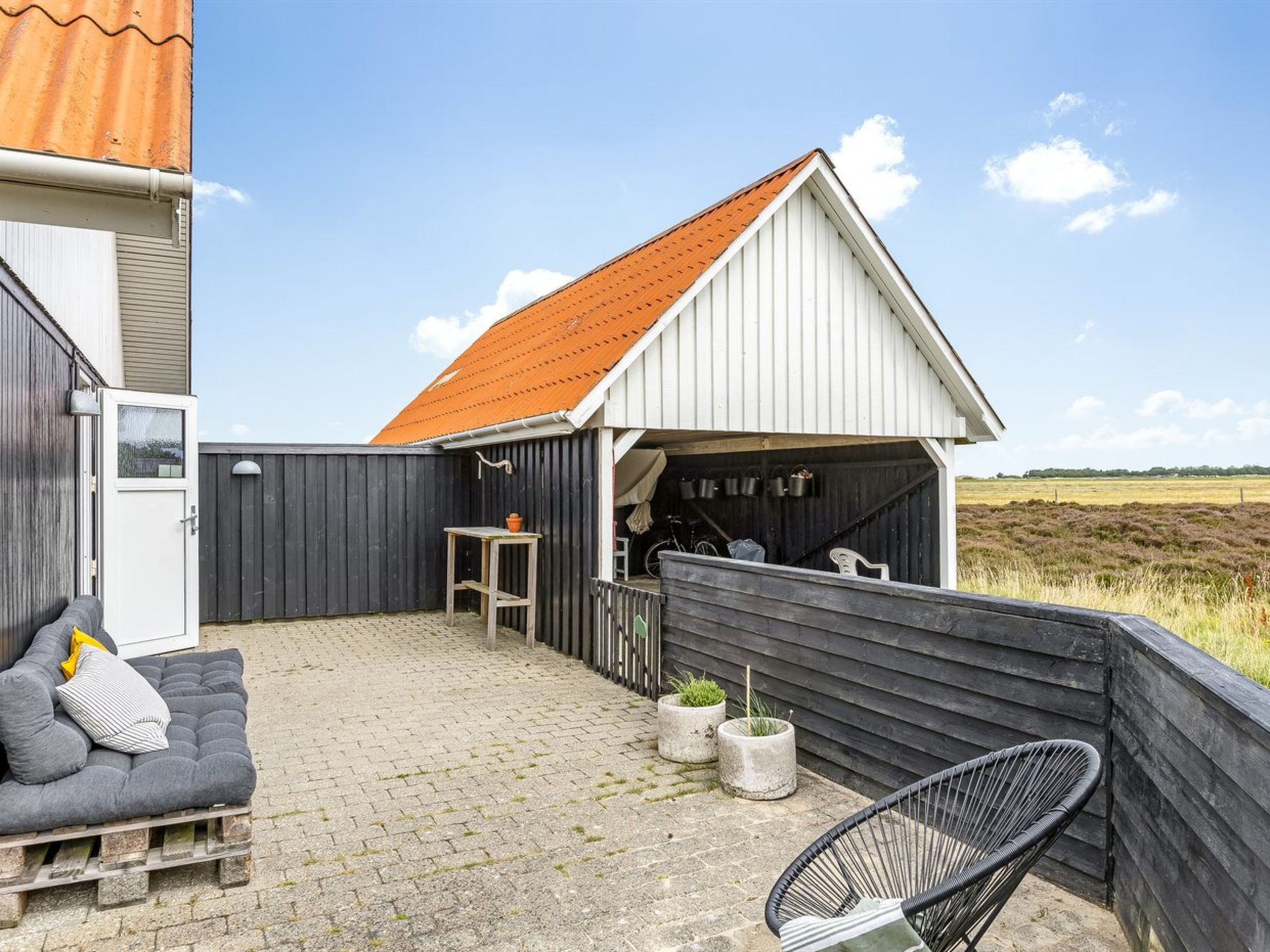 Einfamilienhaus, Baujahr 1975. 2 km vom Meer. Zur Alleinbenutzung: naturbelassenes Grundstück 2'000 m2. Terrasse (50 m2). Im Hause: Waschmaschine. Parkplatz beim Haus. Carport. E-Ladestation. Lebensmittelgeschäft 2 km.