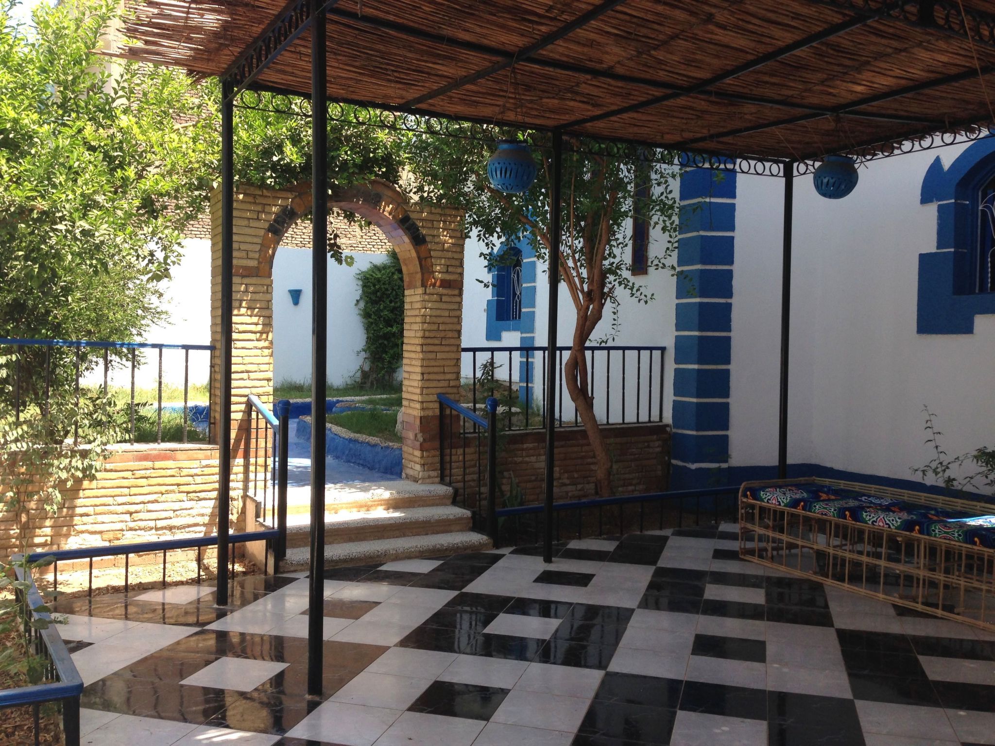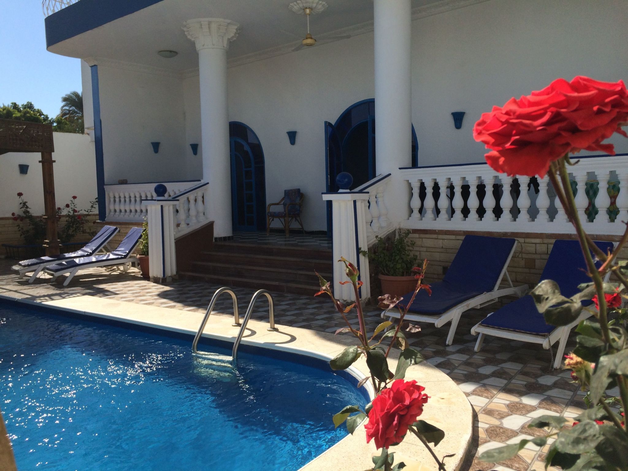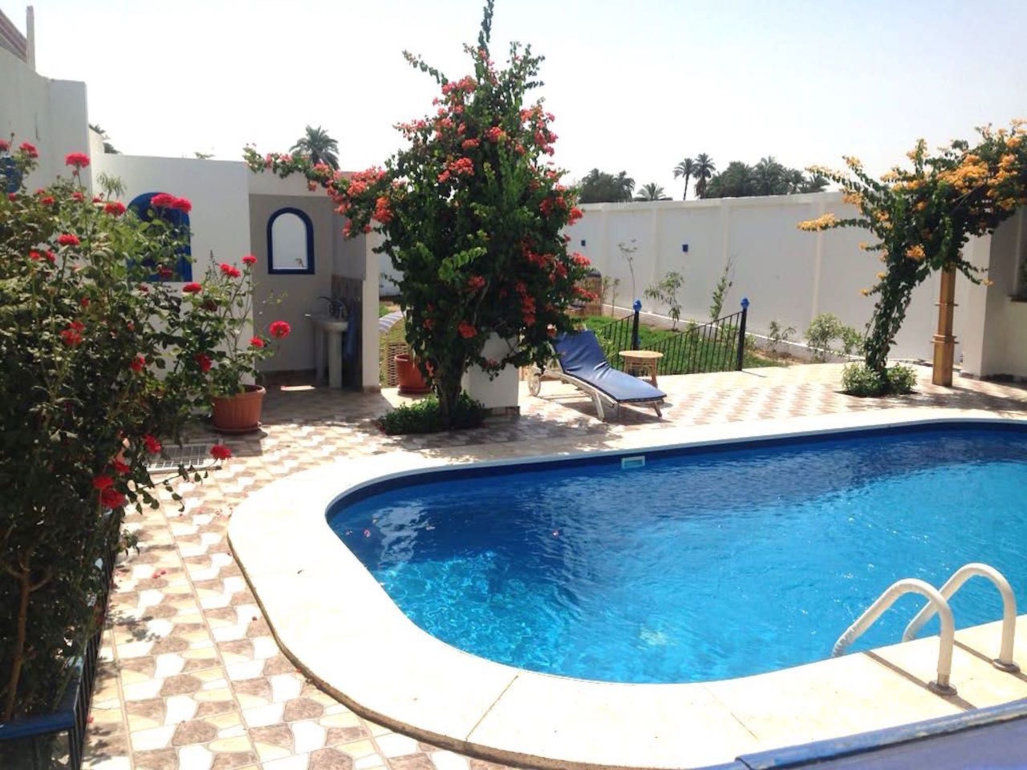 Villa Kaslan liegt sehr privat inmitten von Dattelpalmen, Bananenplantagen, Zuckerrohr- und Weizenfeldern auf der West Bank von Luxor. In der Liegenschaft selbst hat es viele Blumen, Sträucher, Limetten-, Mandarinen- und Papaya-Bäume, Pfefferminze, Basilikum..... Die Ruhe vor Ort wird tagsüber nur vom Zwitschern der Vögel und abends vom Zirpen der Grillen unterbrochen und man kann sich bei uns so richtig erholen. Sei es am oder im Swimmingpool, auf der grossen Dachterrasse mit Panormablick, im Garten oder auf den separaten Terrassen der Ferienwohnungen; irgendwo findet sich immer ein Plätzchen.