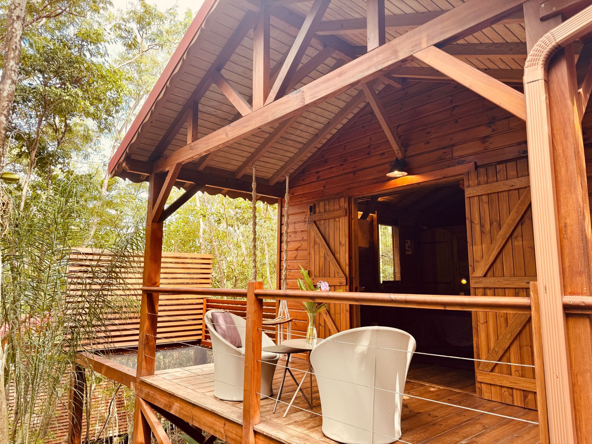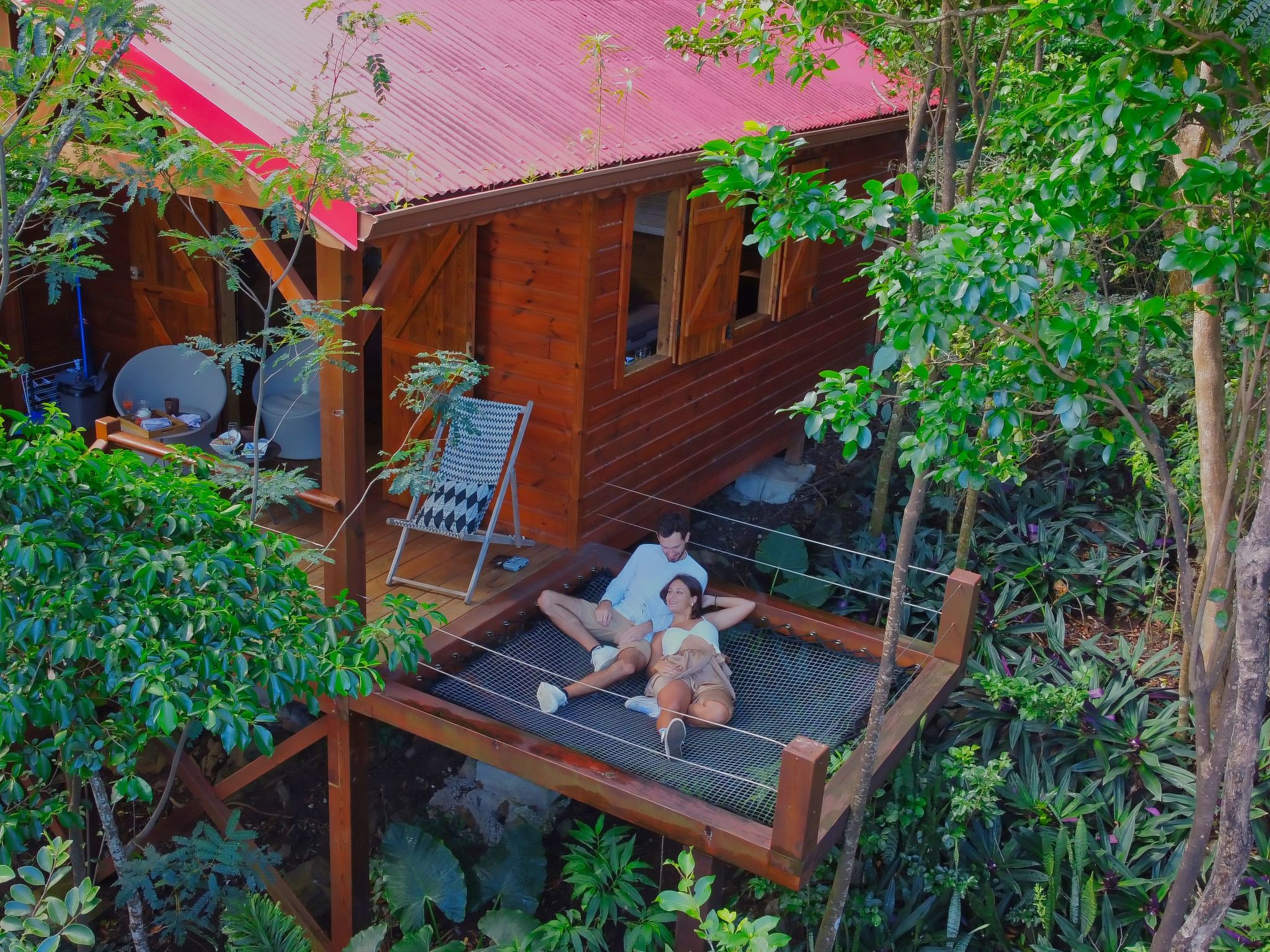 Die Terrasse, auf der Sie mit den Kolibris unter sich sein können, bietet Ihnen außerdem ein unglaubliches Sternenbett... Es hängt im Regenwald und eignet sich perfekt für ein Nickerchen zu zweit, um bei einem Planteur die Welt neu zu erkunden oder, warum nicht, um eine Nacht unter dem Sternenhimmel zu verbringen.