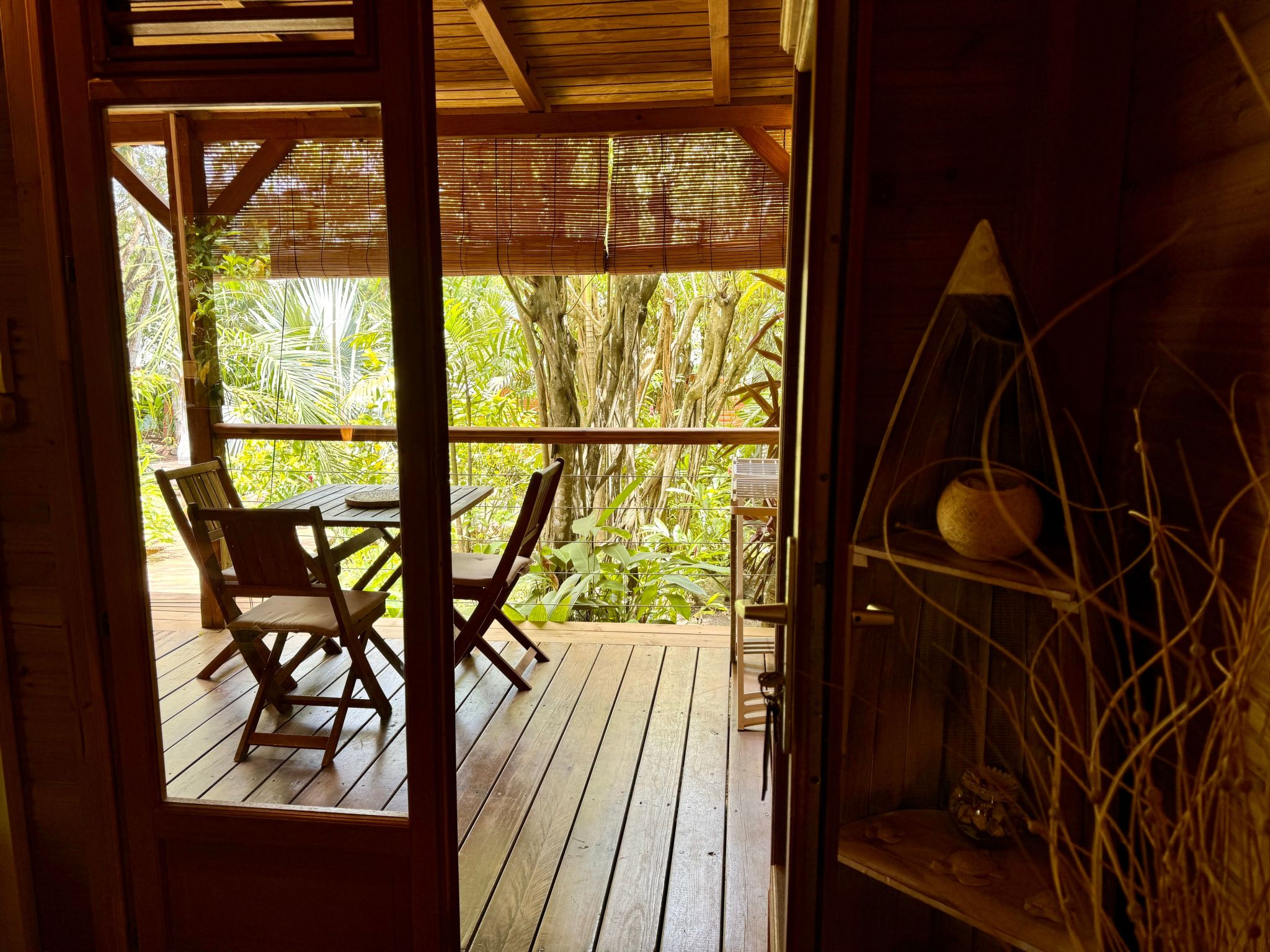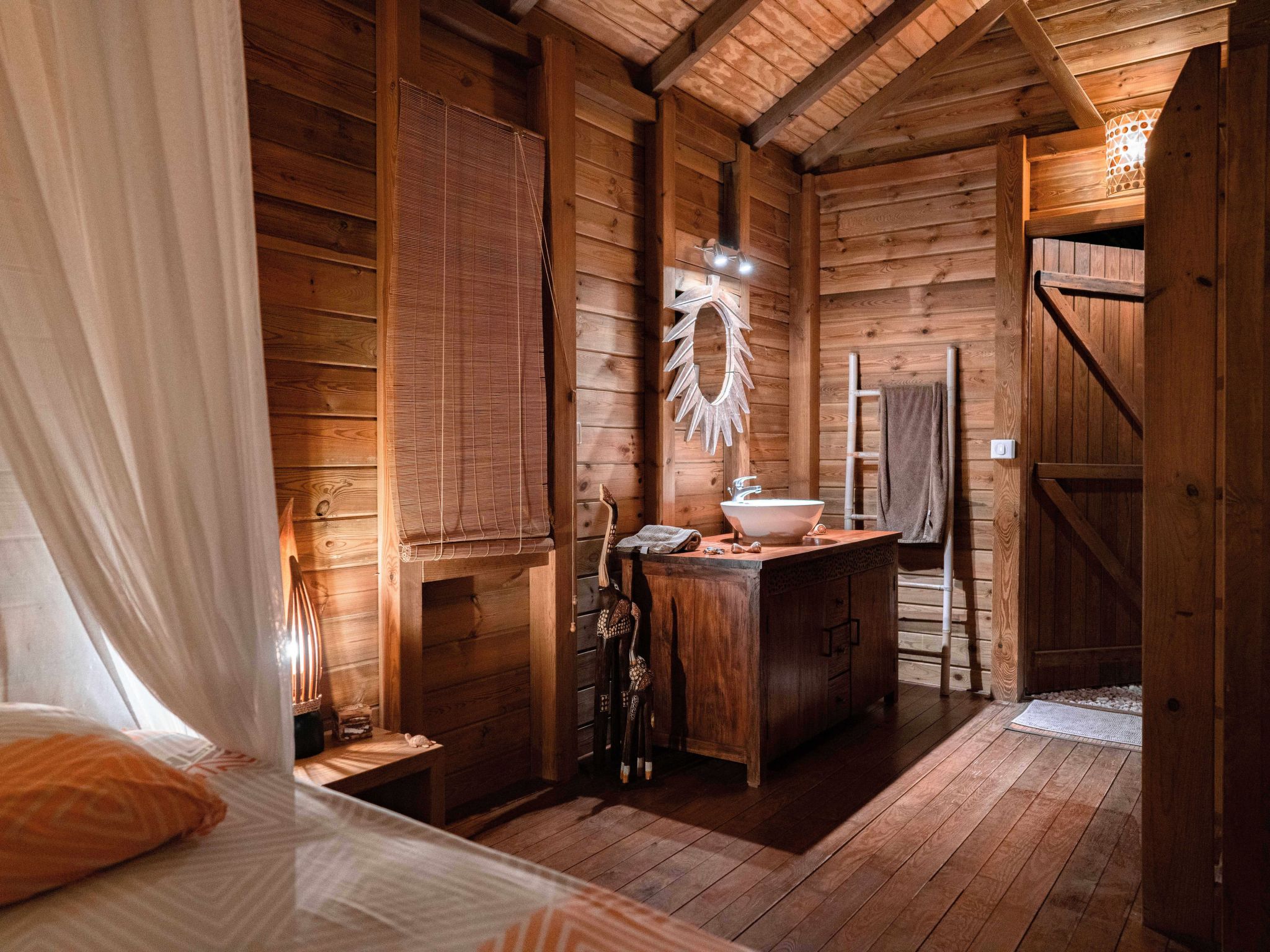 Holzhaus, das für Verliebte gedacht ist. Ein großes Zimmer im Stil einer tropischen Suite mit Kingsize-Bett und Außendusche unter den Sternen ... Terrasse mit ausgestatteter Außenküche, Hängematte und Weber-Bbq.