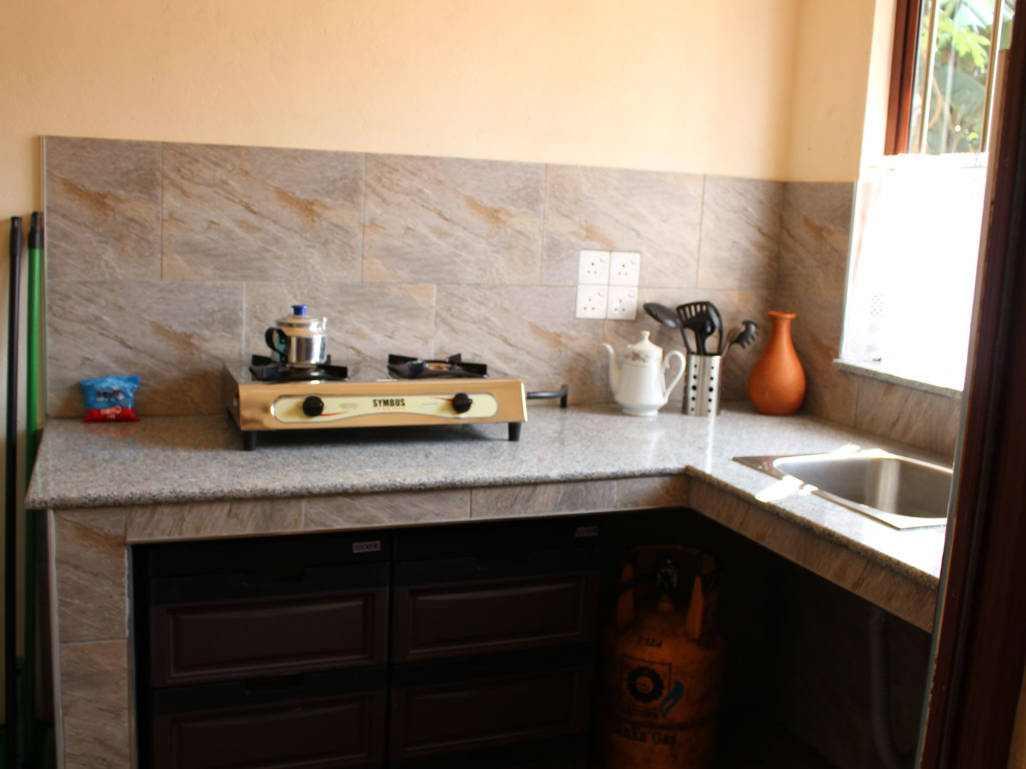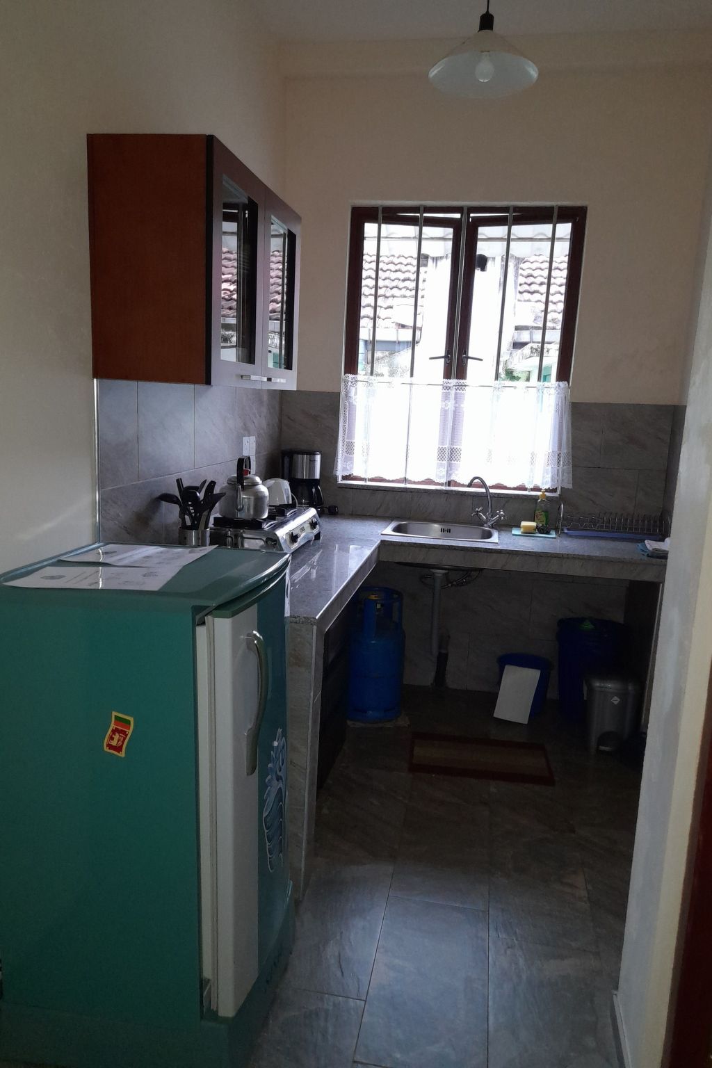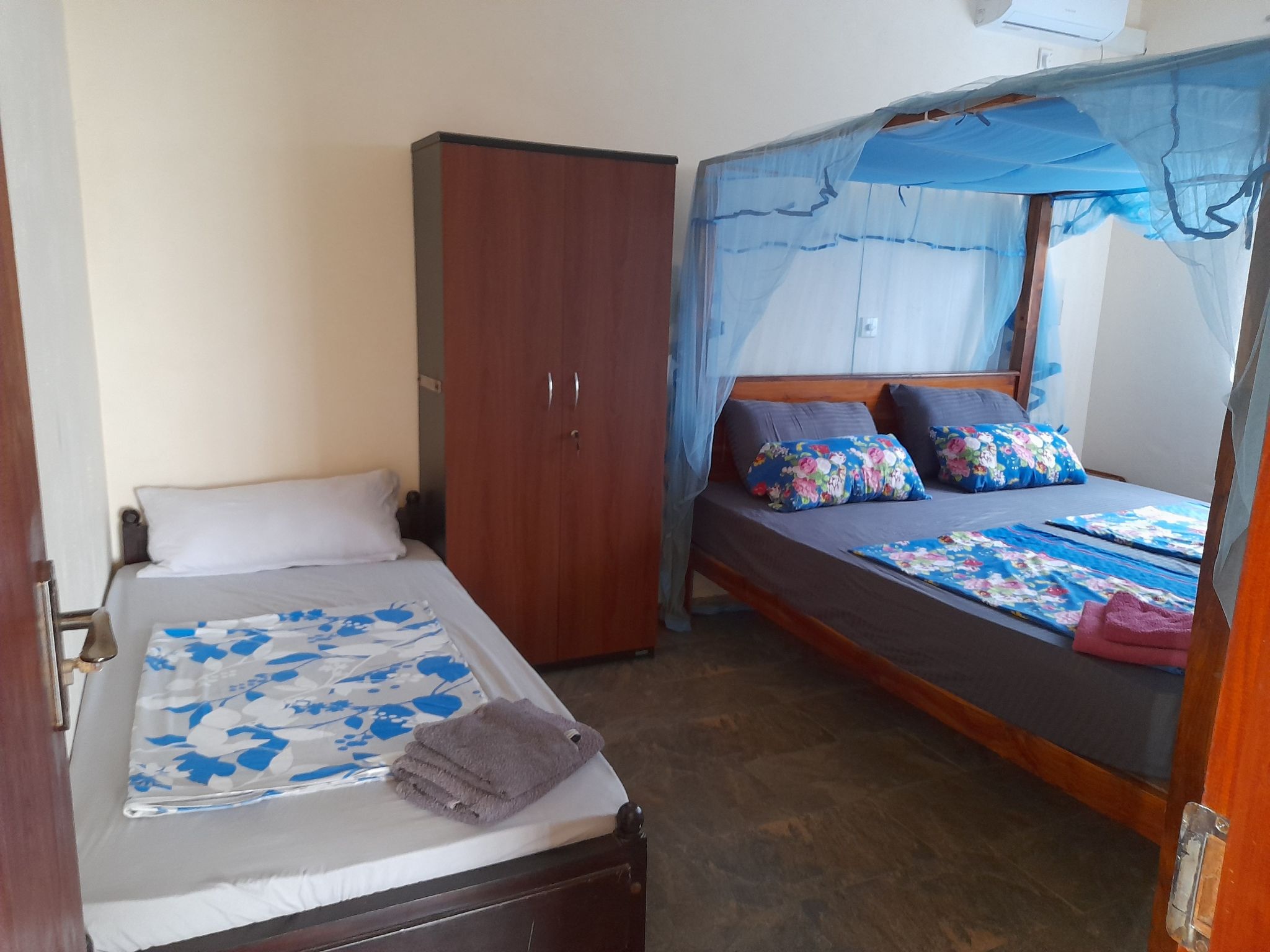 Im Inneren der Ferienwohnung im Erdgeschoss finden Gäste eine gut ausgestattete Küche mit Gaskocher, Wasserkocher und Kaffeemaschine vor - ideal für die Zubereitung leckerer Mahlzeiten. Die Unterkunft verfügt über zwei komfortable Schlafzimmer und ein Badezimmer mit Dusche, garantiert also eine erfrischende und erholsame Nachtruhe. In den Schlafzimmern der Wohnung sorgt eine Klimaanlage für angenehme Temperaturen, während Ventilatoren eine sanfte Brise in alle Räume bringen. Zudem wird das Haus mit Solarenergie betrieben, was den Aufenthalt nachhaltig gestaltet.