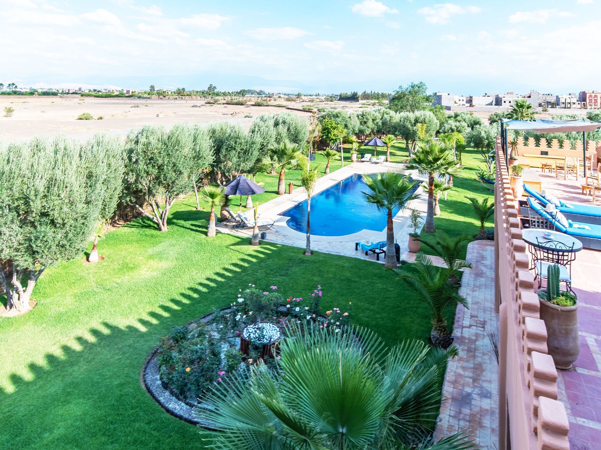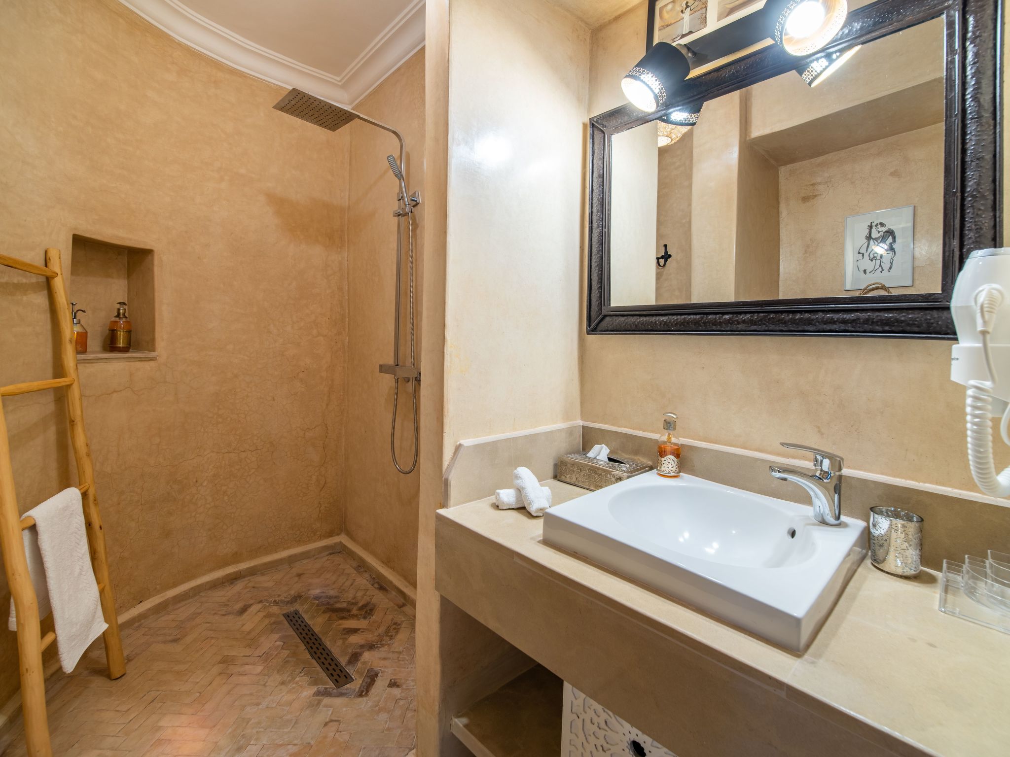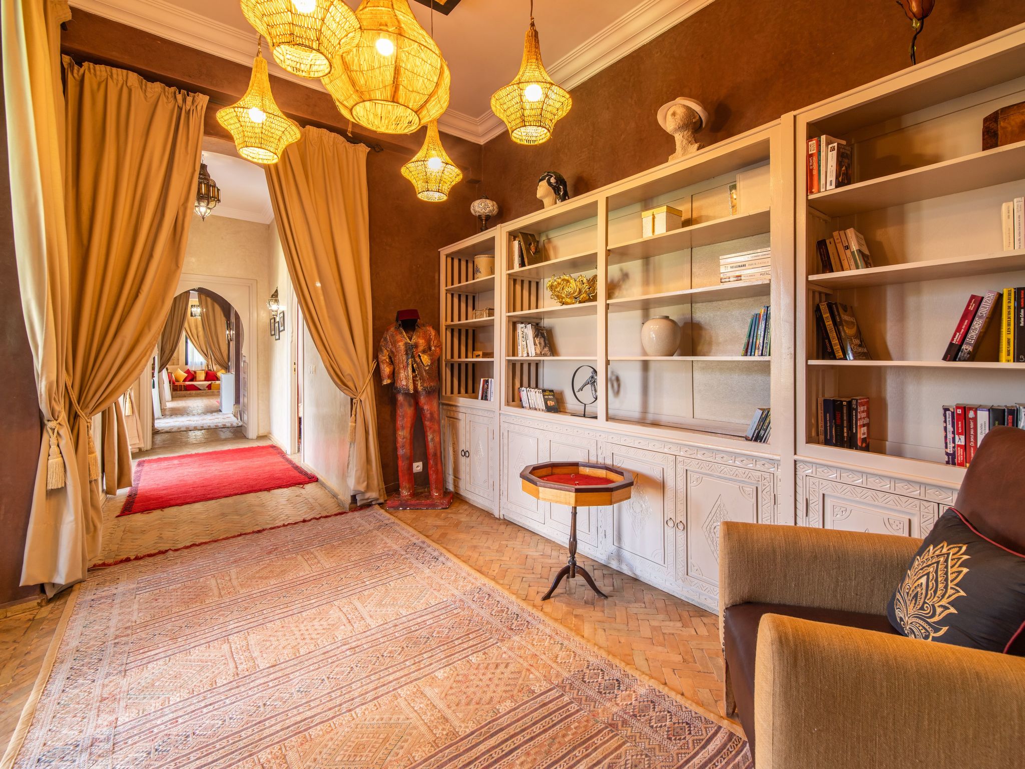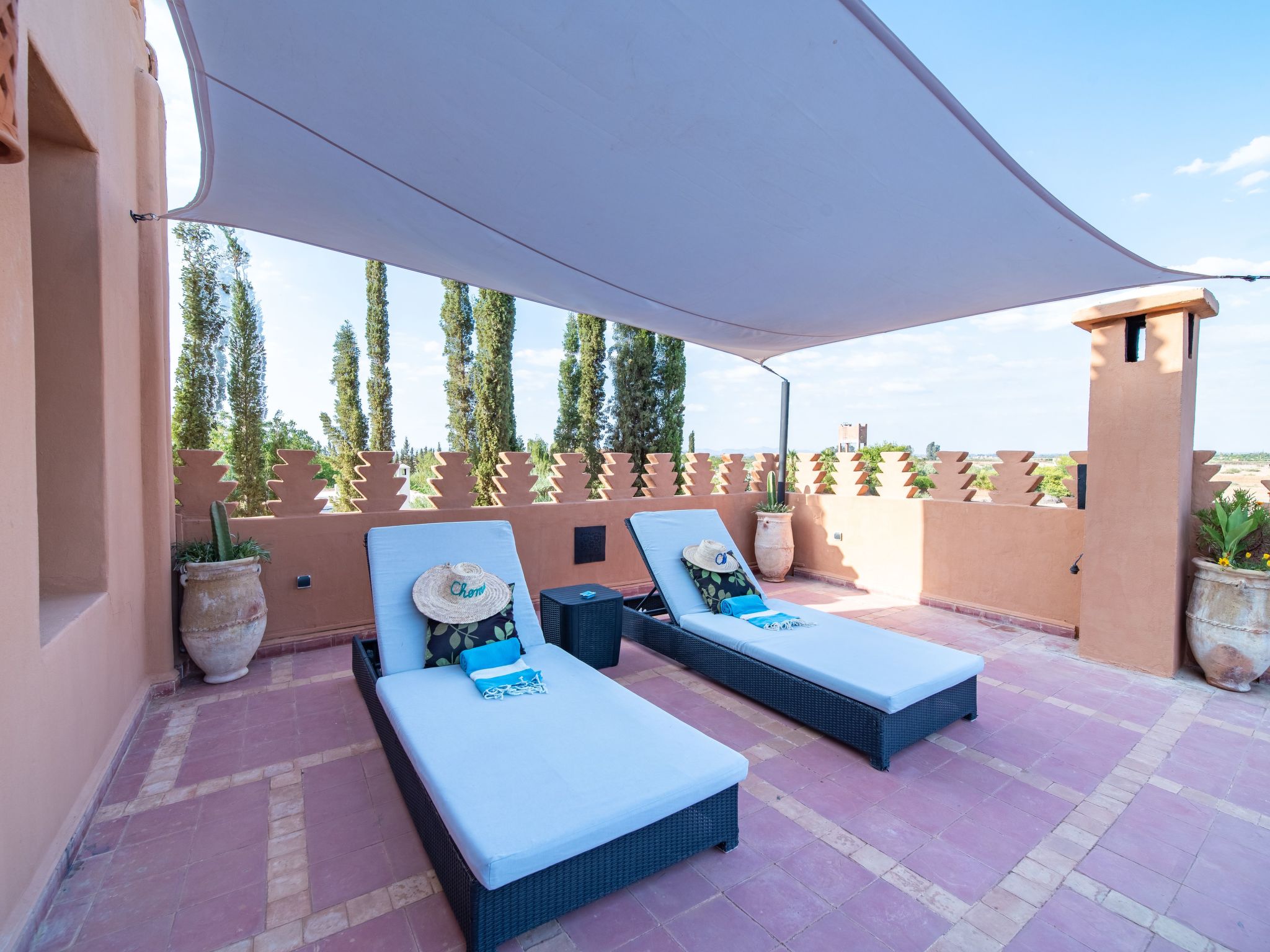 Im Außenbereich öffnet sich das Haus zu einem üppigen und sorgfältig gepflegten Außenbereich, der zur gemeinschaftlichen Nutzung zur Verfügung steht und eine Vielzahl von Optionen zum Entspannen und Genießen des milden Klimas von Marrakesch bietet. Die Terrasse und die Dachterrasse laden zu geselligen Stunden oder entspannenden Momenten ein, während Sie die Aussicht genießen, während der belebende Pool nach einem Tag voller Erkundungen willkommene Erfrischungen verspricht. Der Garten mit seinem Grillplatz eignet sich perfekt für Grillabende unter dem Sternenhimmel.