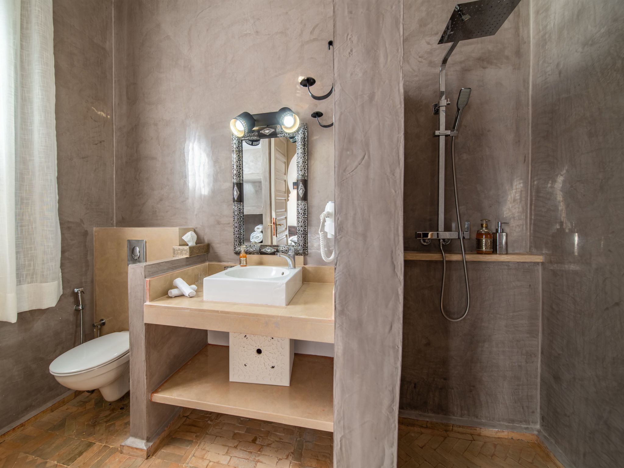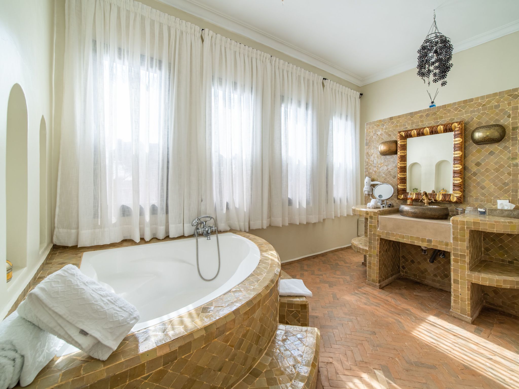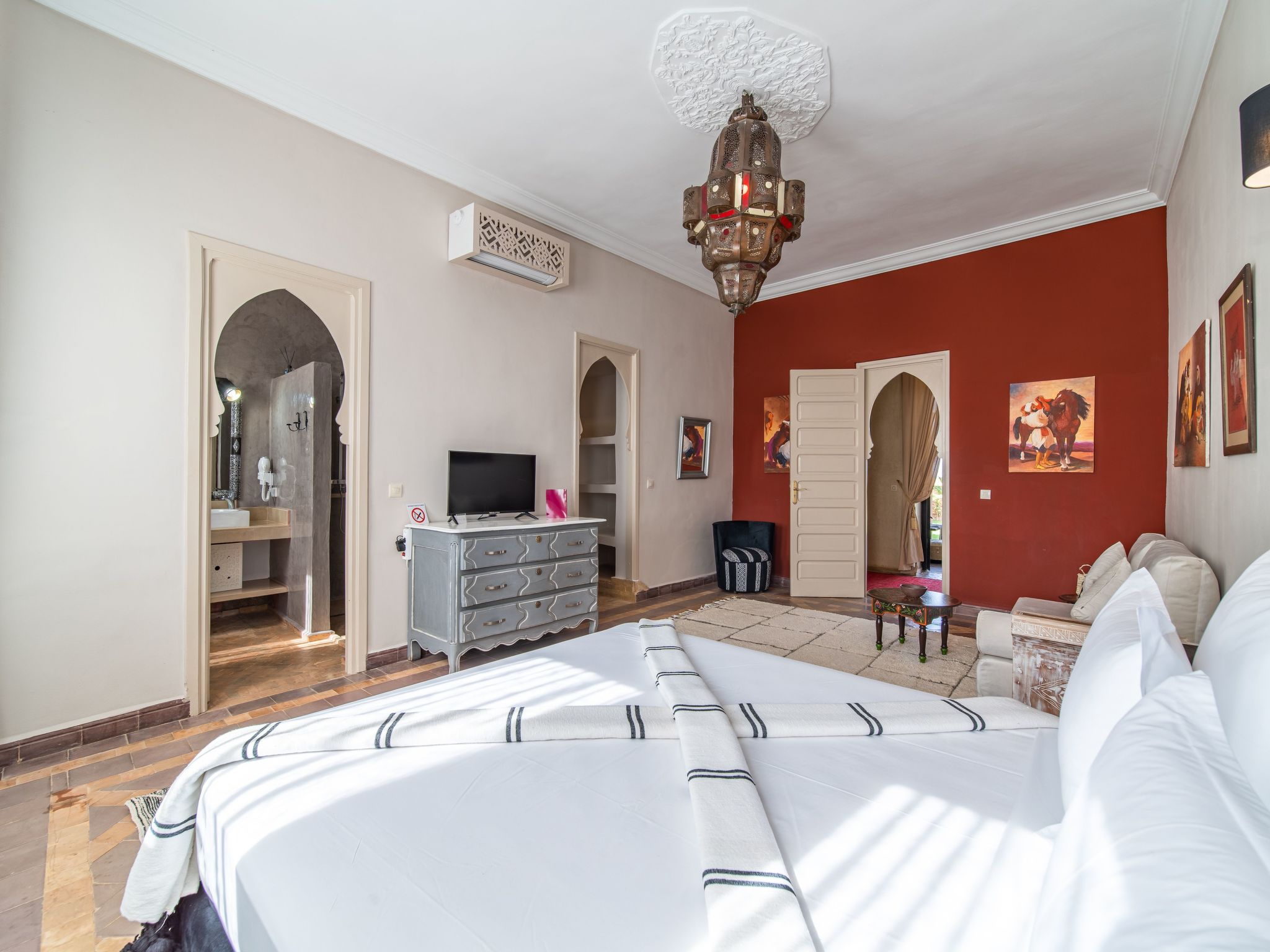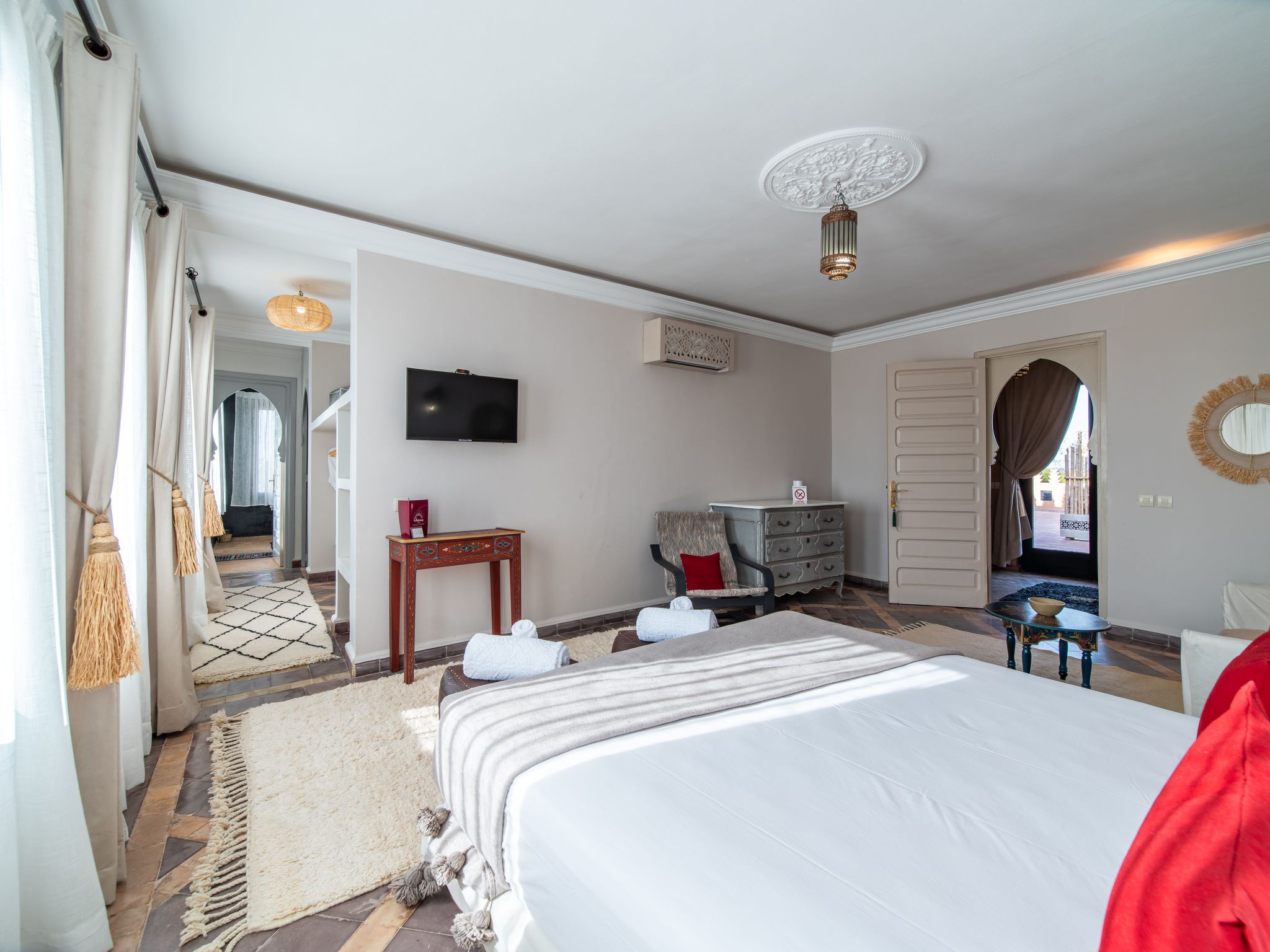 Im Außenbereich öffnet sich das Haus zu einem üppigen und sorgfältig gepflegten Außenbereich, der zur gemeinschaftlichen Nutzung zur Verfügung steht und eine Vielzahl von Optionen zum Entspannen und Genießen des milden Klimas von Marrakesch bietet. Die Terrasse und die Dachterrasse laden zu geselligen Stunden oder entspannenden Momenten ein, während Sie die Aussicht genießen, während der belebende Pool nach einem Tag voller Erkundungen willkommene Erfrischungen verspricht. Der Garten mit seinem Grillplatz eignet sich perfekt für Grillabende unter dem Sternenhimmel.