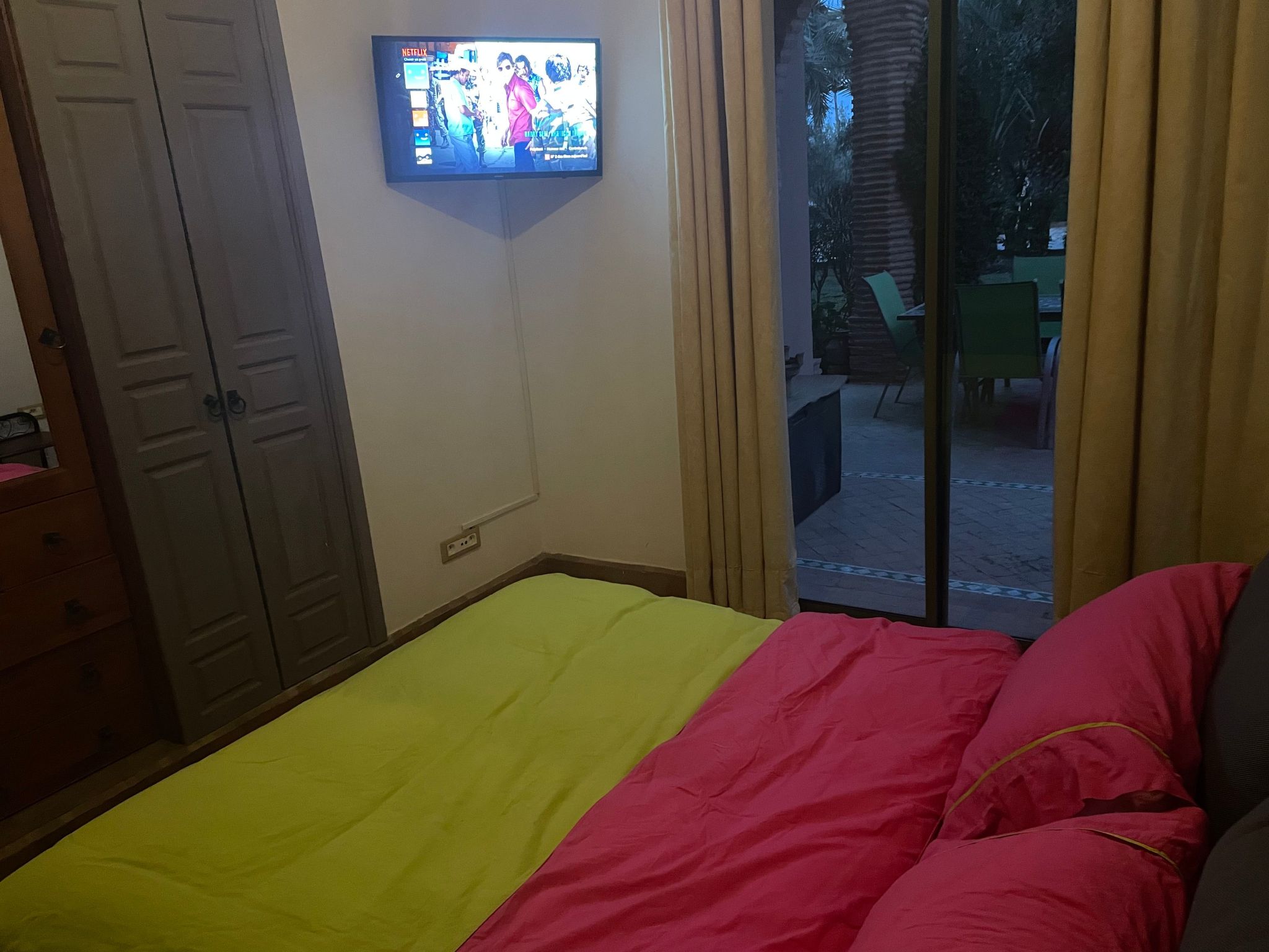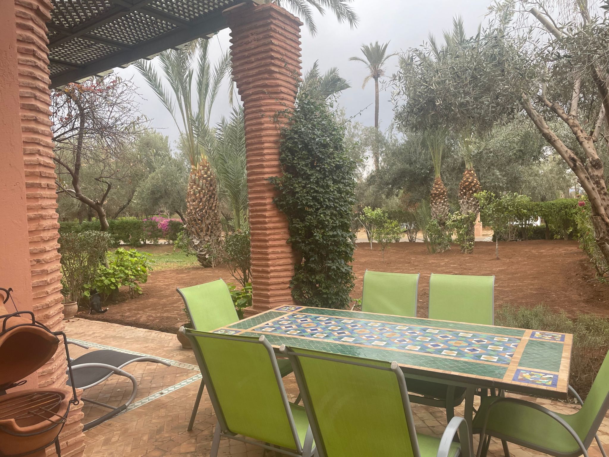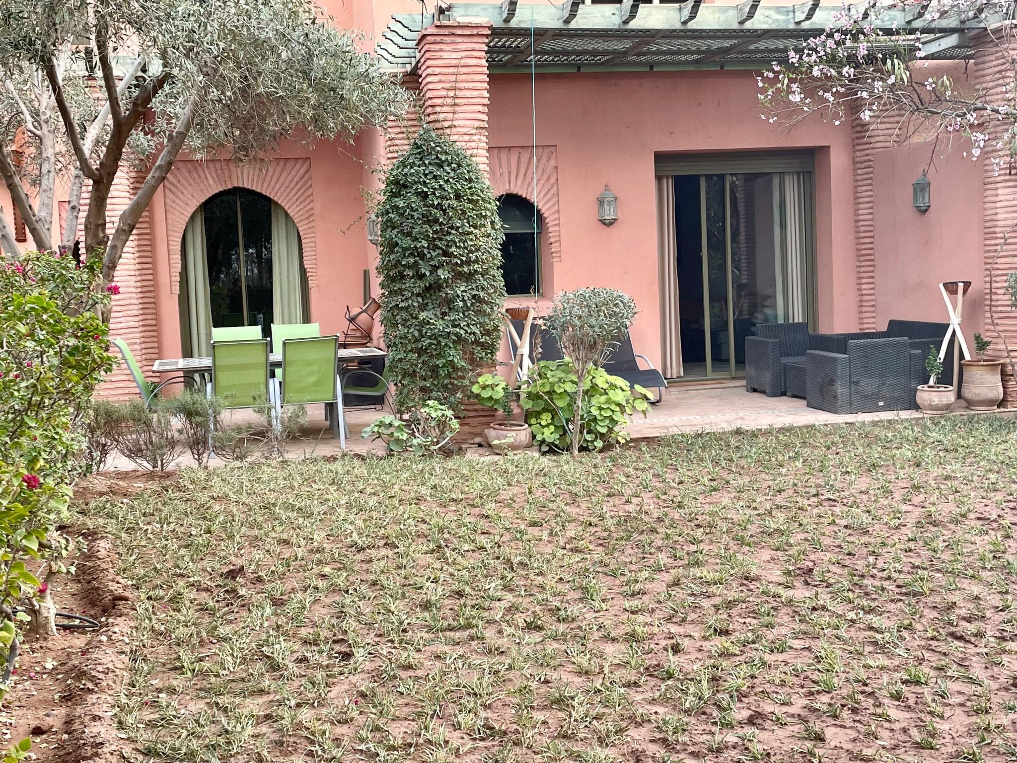 Draußen öffnet sich die Wohnung auf eine wunderschöne Terrasse mit Blick auf einen privaten Garten, der mit einem Grill ausgestattet ist, der bereit ist, Ihre Sommerabende zu bewirten. Dieser Außenbereich, der für Ihre Entspannung und Unterhaltung gedacht ist, bietet einen idealen Rahmen, um das milde Klima von Marrakesch in aller Privatsphäre zu genießen. Der Pool zur gemeinsamen Nutzung steht Ihnen ebenfalls zur Verfügung, damit Sie sich unter der Sonne Marrakeschs erfrischen und entspannen können.