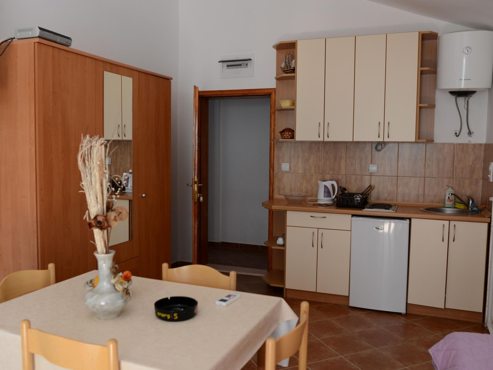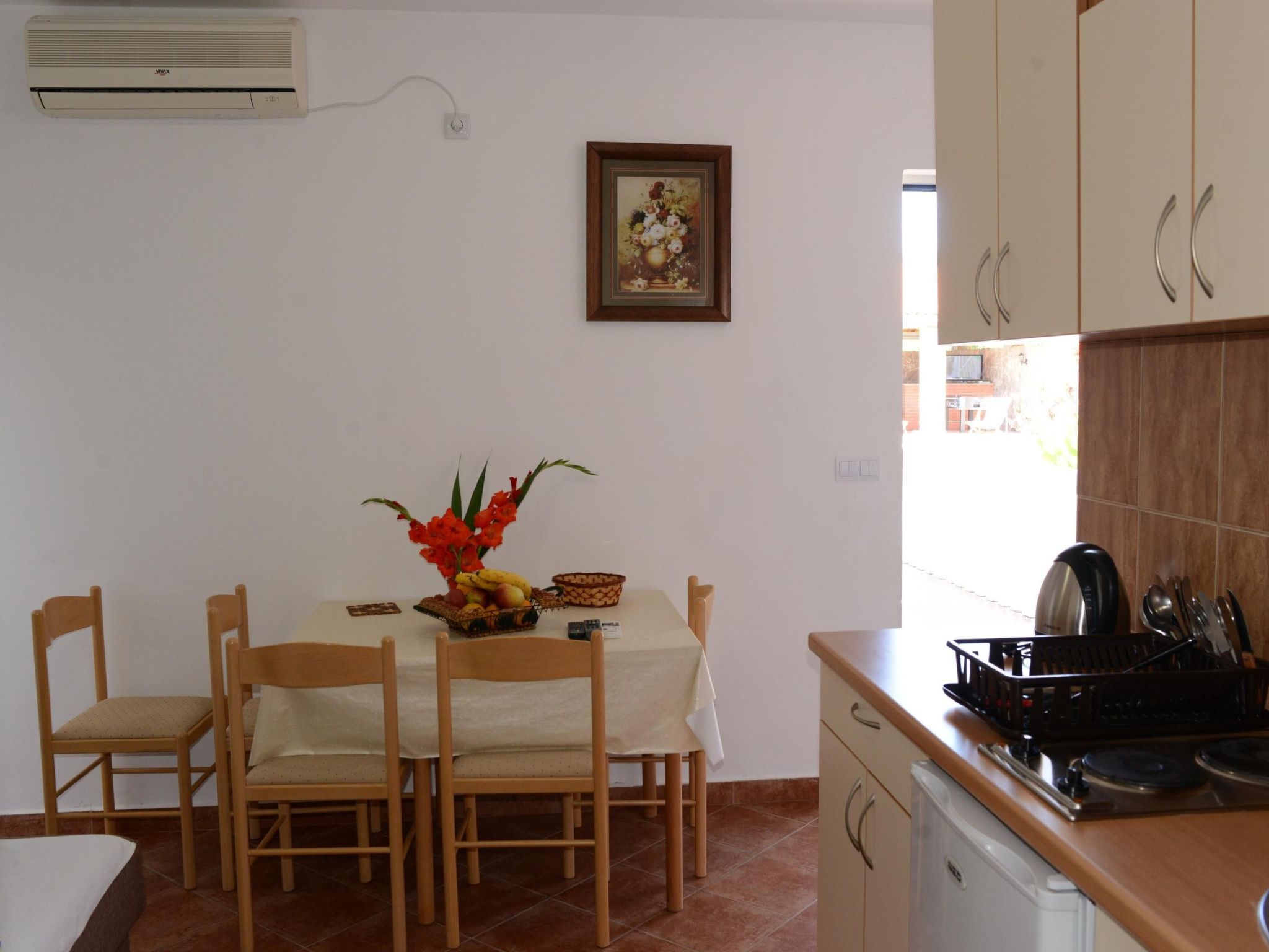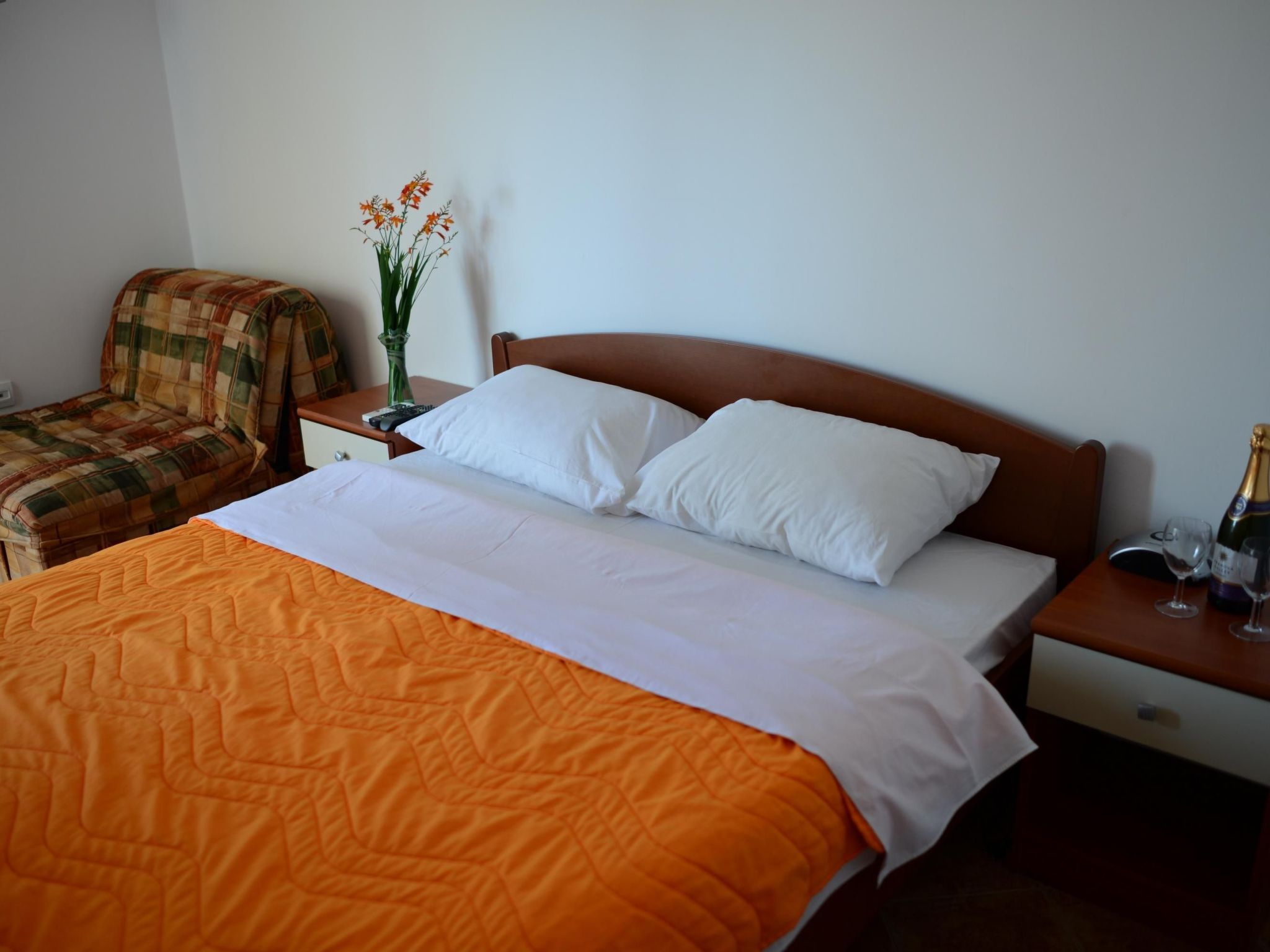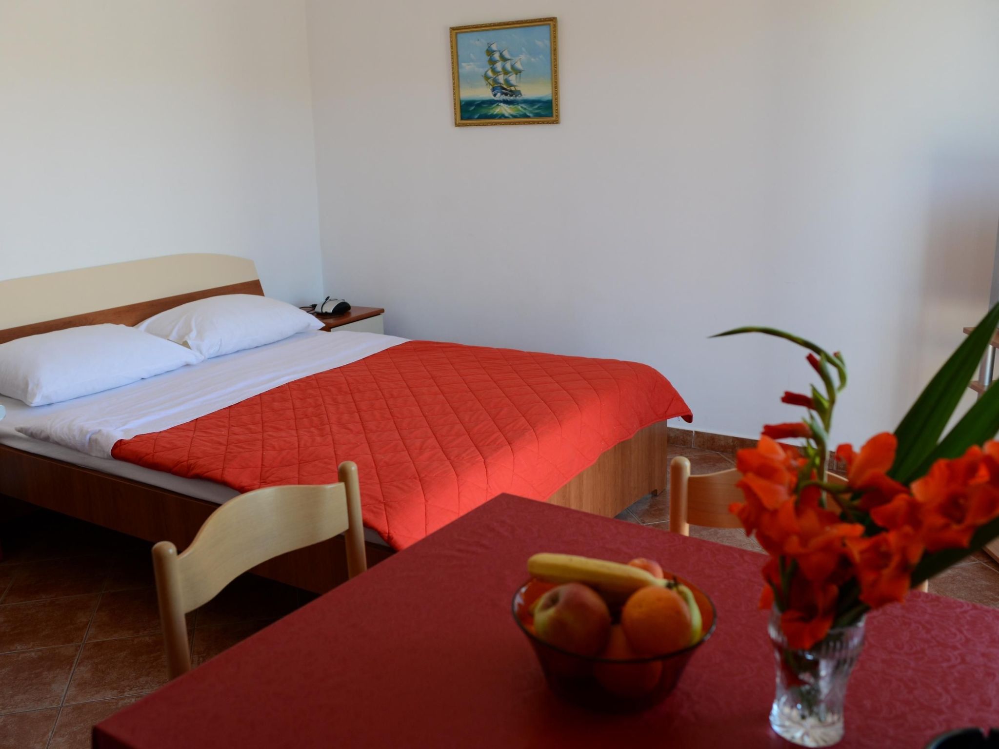 Dieses klimatisierte Studio-Appartement liegt auf der dritten Etage und bietet vier Personen Platz. Als Schlafgelegenheiten verfügt es über ein Doppelbett, ein Einzelbett und eine Schlafcouch. Weiterhin stehen ein Kleiderschrank, ein Fernseher mit Sat.-TV sowie ein Esstisch mit Stühlen bereit. Die Küchenzeile ist mit einem 2-Platten-Herd, Kühlschrank mit Gefrierfach, Wasserkocher und Kaffeemaschine ausgestattet. Das Badezimmer ist mit einer Dusche, Waschbecken und Toilette eingerichtet.