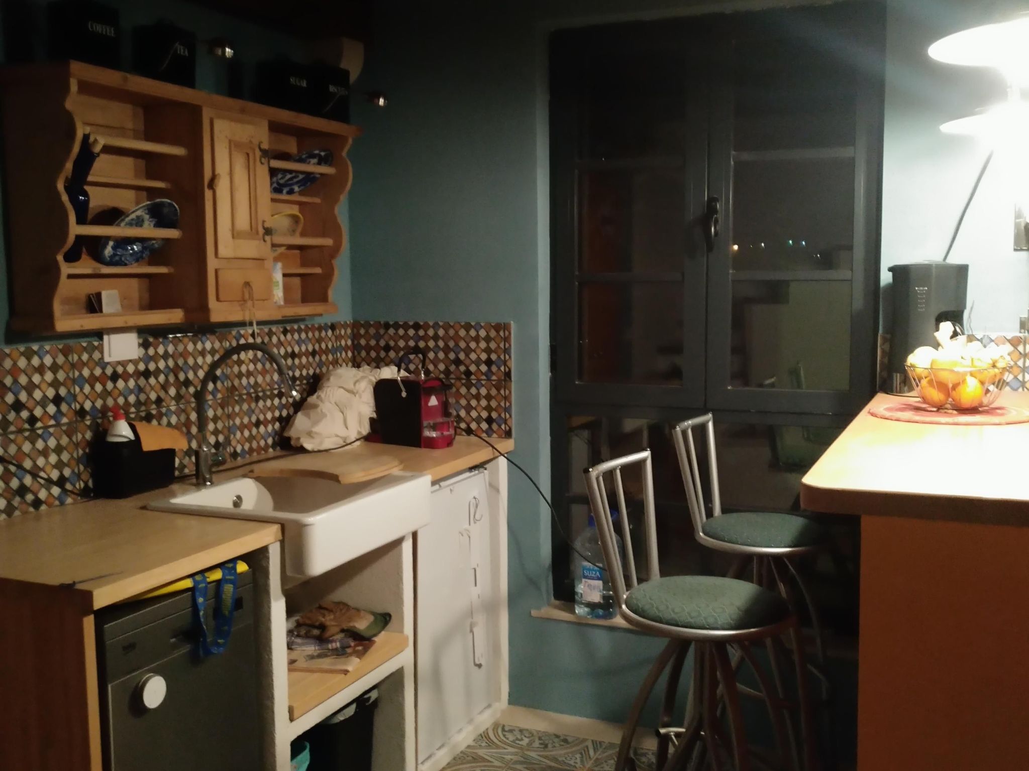 Es gibt eine kleine, gut ausgestattete Küche neben der Eingangstür, eine Gästetoilette mit franz.Klosett und Waschmaschine unter dem Treppenaufgang.