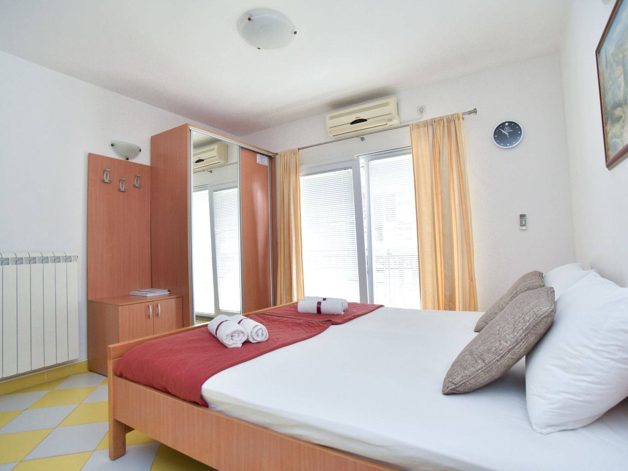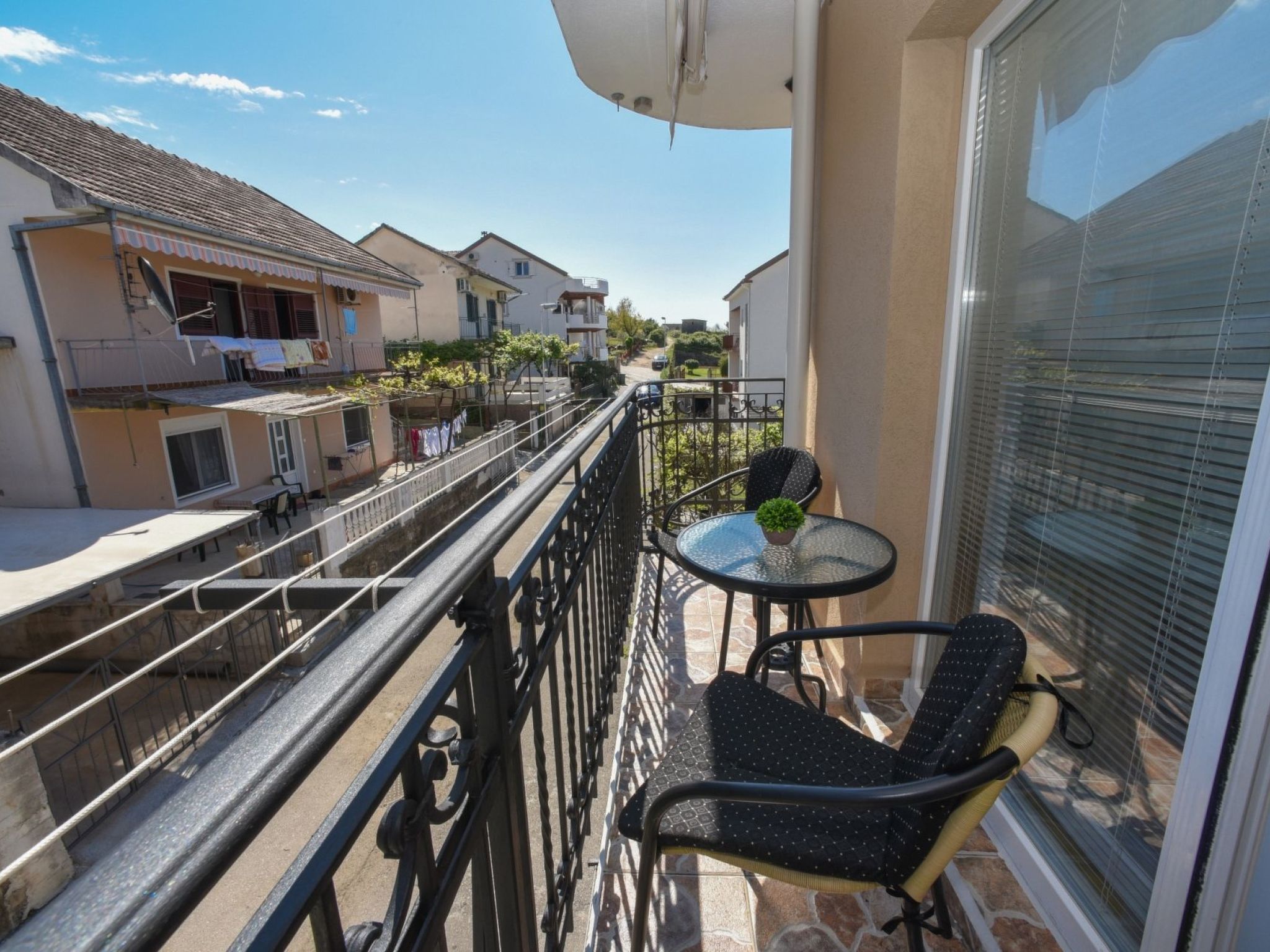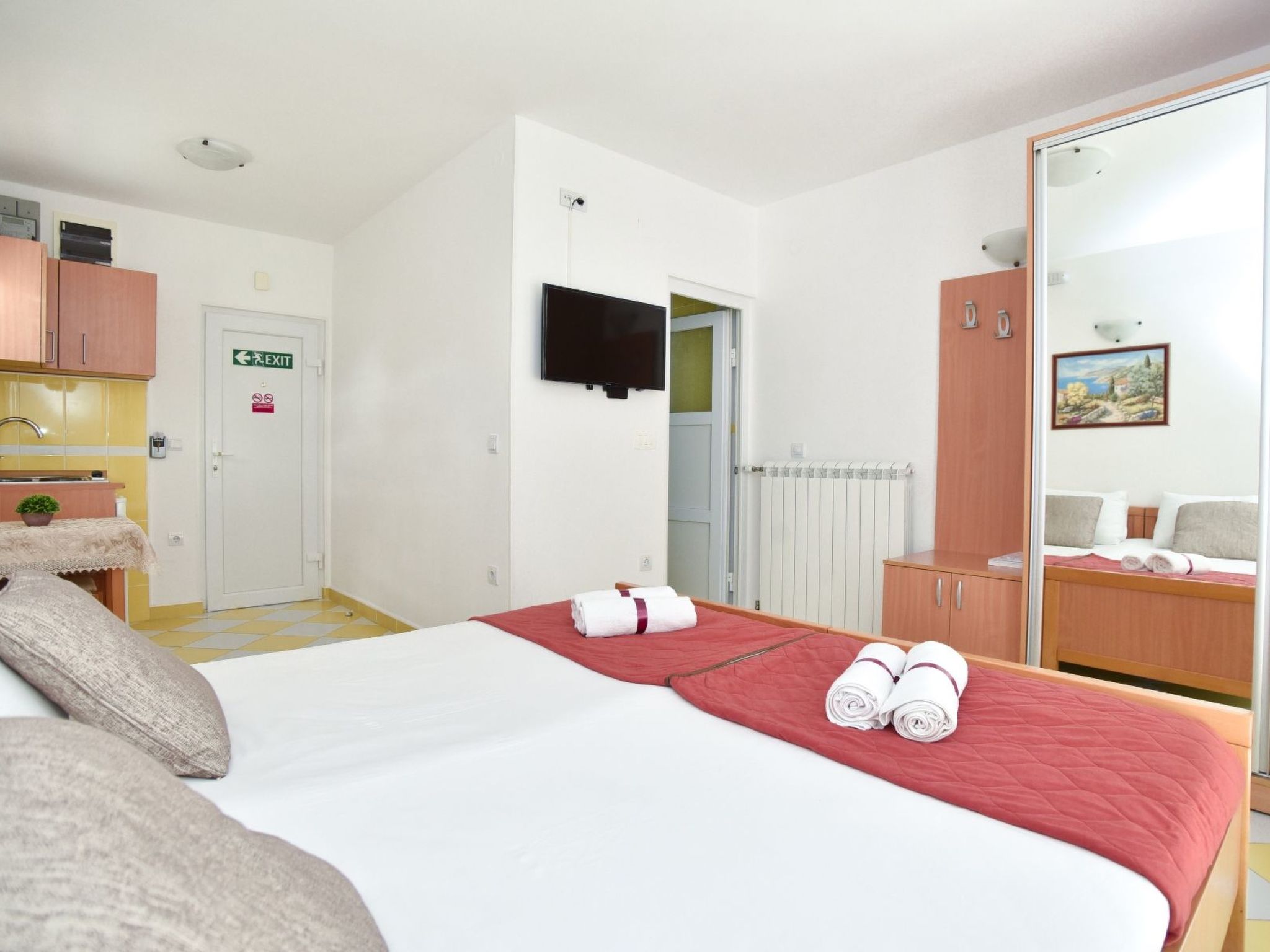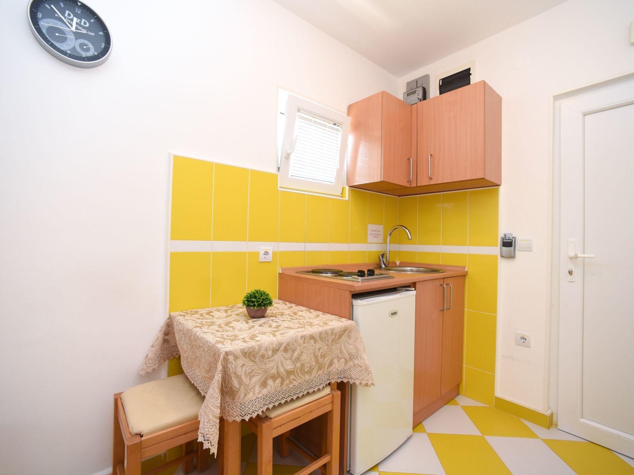 Das Innere der Wohnung ist für Ihren größtmöglichen Komfort ausgelegt und verfügt über eine Klimaanlage, die bei jedem Wetter für ein angenehmes Klima sorgt. Es ist mit einer Reihe von Annehmlichkeiten ausgestattet, die auf Ihre Bedürfnisse zugeschnitten sind, darunter ein Fernseher mit Kabelkanälen, eine Miniküche für Ihre kulinarischen Abenteuer und eine Waschmaschine, die Sie exklusiv nutzen können, so dass Sie sich wie zu Hause fühlen können. Die Liebe zum Detail erstreckt sich auch auf das Praktische: ein Wasserkocher für Ihr morgendliches Gebräu, Jalousien an den Fenstern für mehr Privatsphäre und ein gut ausgestattetes Badezimmer.