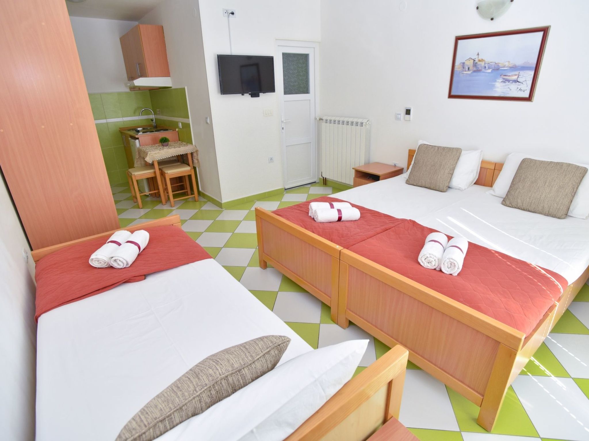 Im Inneren bietet die Wohnung eine Reihe von Annehmlichkeiten, die Ihren Aufenthalt so komfortabel und problemlos wie möglich gestalten. Genießen Sie die Annehmlichkeiten einer Klimaanlage im gesamten Raum, die unabhängig vom Wetter für eine angenehme Umgebung sorgt. Die Waschmaschine, die Ihnen exklusiv zur Verfügung steht, erleichtert die Wäschepflege, so dass Sie mehr Zeit haben, um Ihren Urlaub zu genießen. Außerdem sorgen ein Wasserkocher, Internetzugang und Kabelfernsehen dafür, dass Ihr Aufenthalt so gemütlich und verbunden wie möglich ist. Jedes Detail, von der Miniküche, die für Ihre kulinarischen Experimente ausgestattet ist, bis hin zum zusätzlichen Komfort der Jalousien für Privatsphäre und einen ruhigen Schlaf, wurde sorgfältig durchdacht.