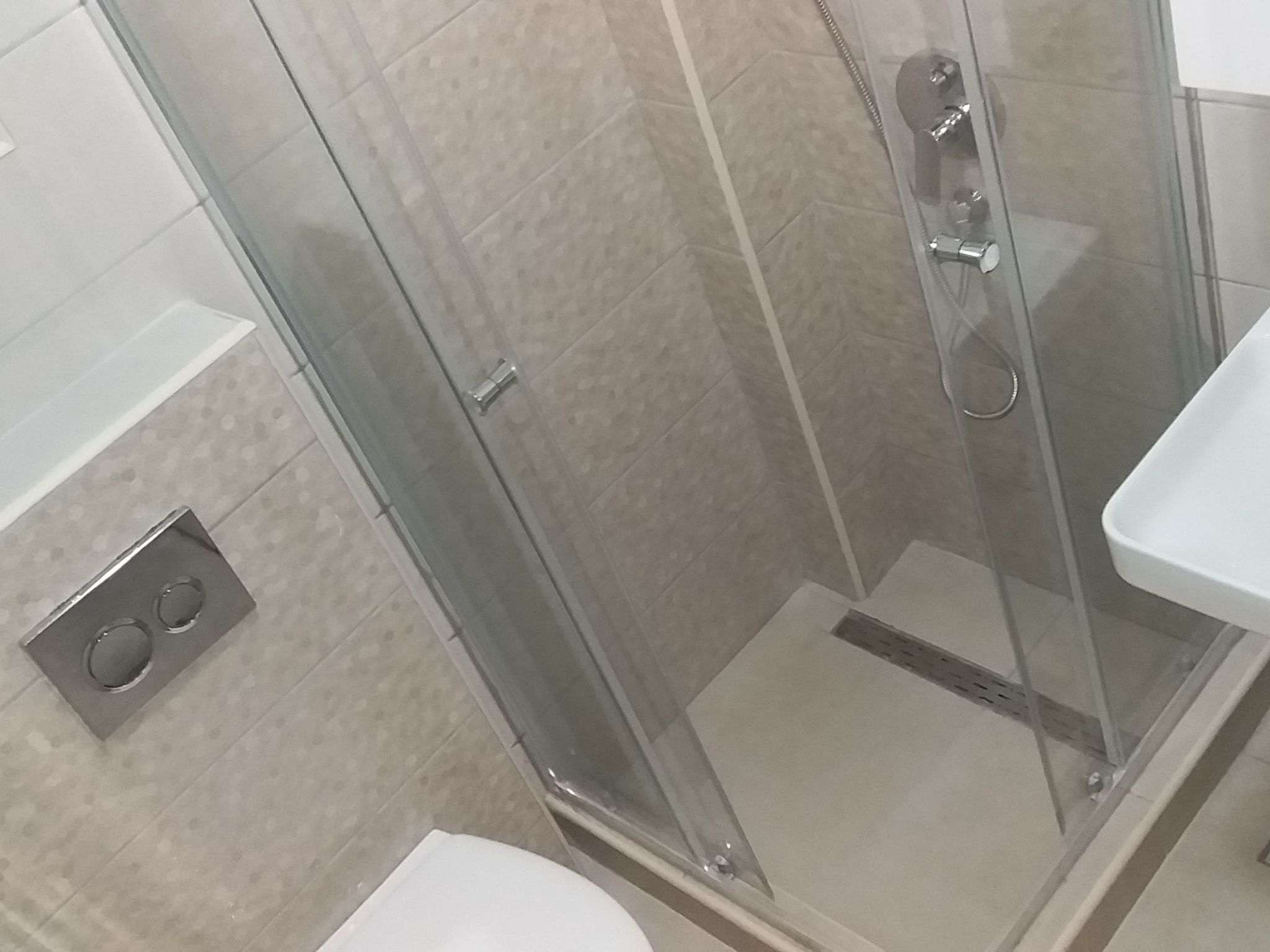 FERNSEHER. Das Badezimmer ist ausgestattet mit Toilette, Waschbecken, Spiegel, Duschkabine, Waschmaschine, Haartrockner, Bügeleisen
