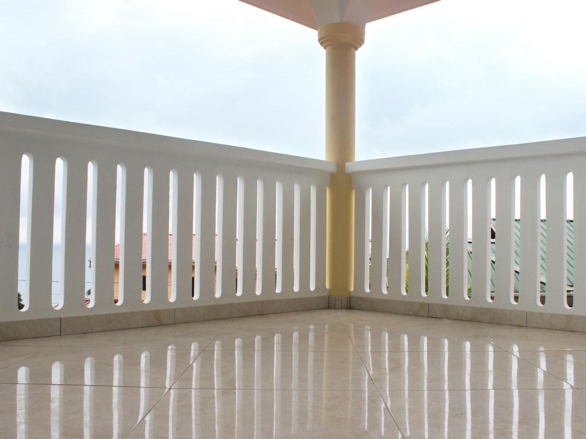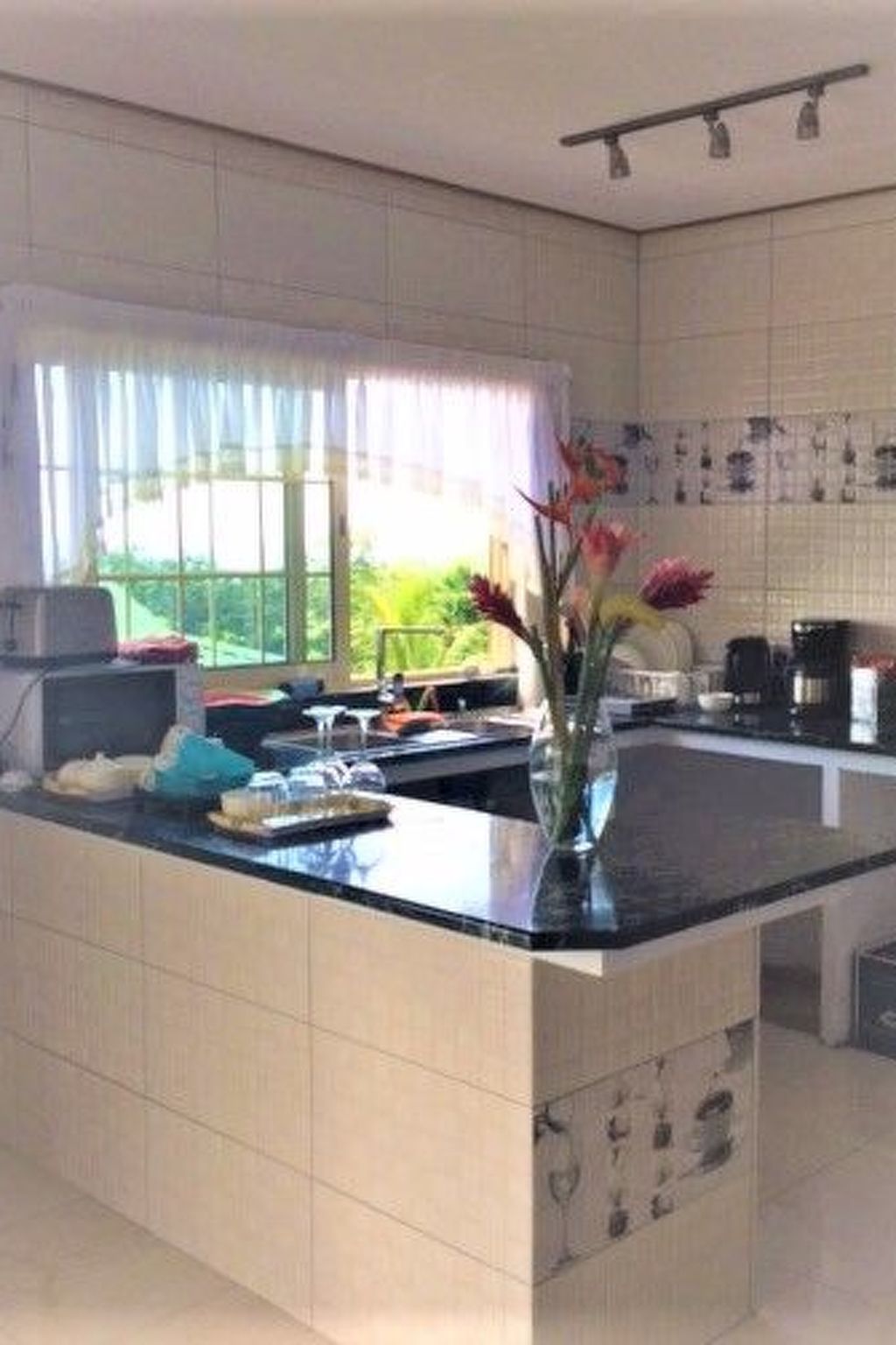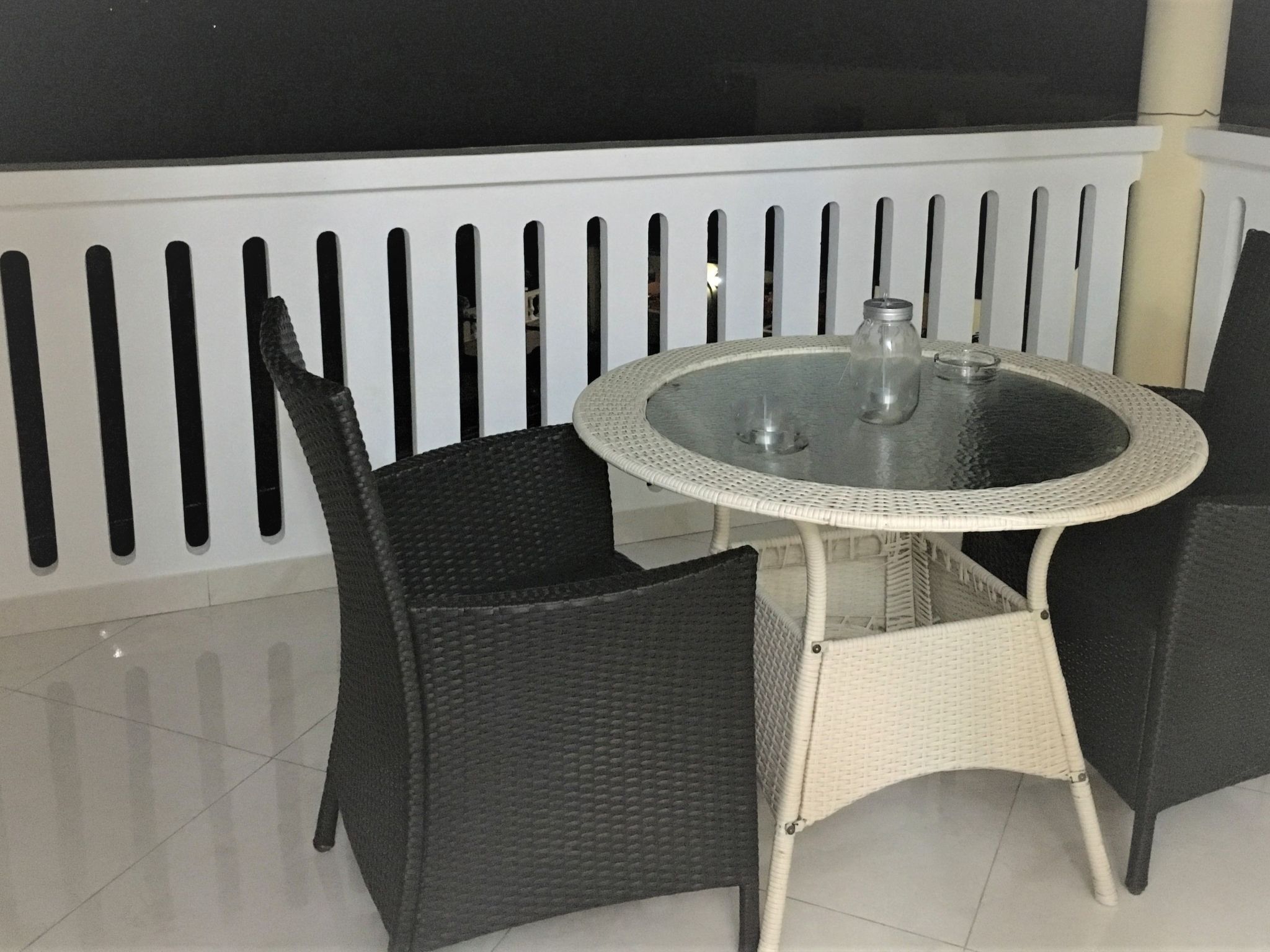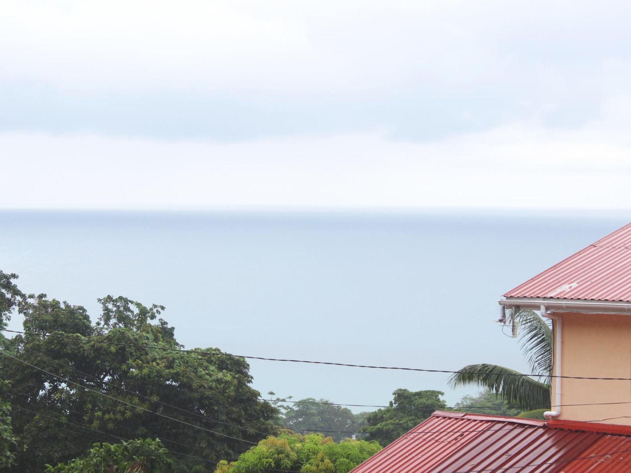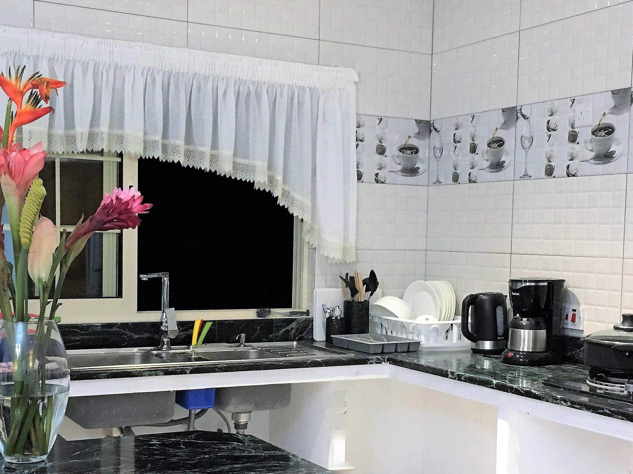 Auf der überdachten Terrasse genießen Sie Ihre Mahlzeit im Freien. Dabei genießen Sie Aussicht über die grüne Umgebung bis auf den Ozean.. Der Bucht Beau Vaallon . Auf dem Gartengrundstück stehen zwei Parkplätze direkt am Haus zur Verfügung.