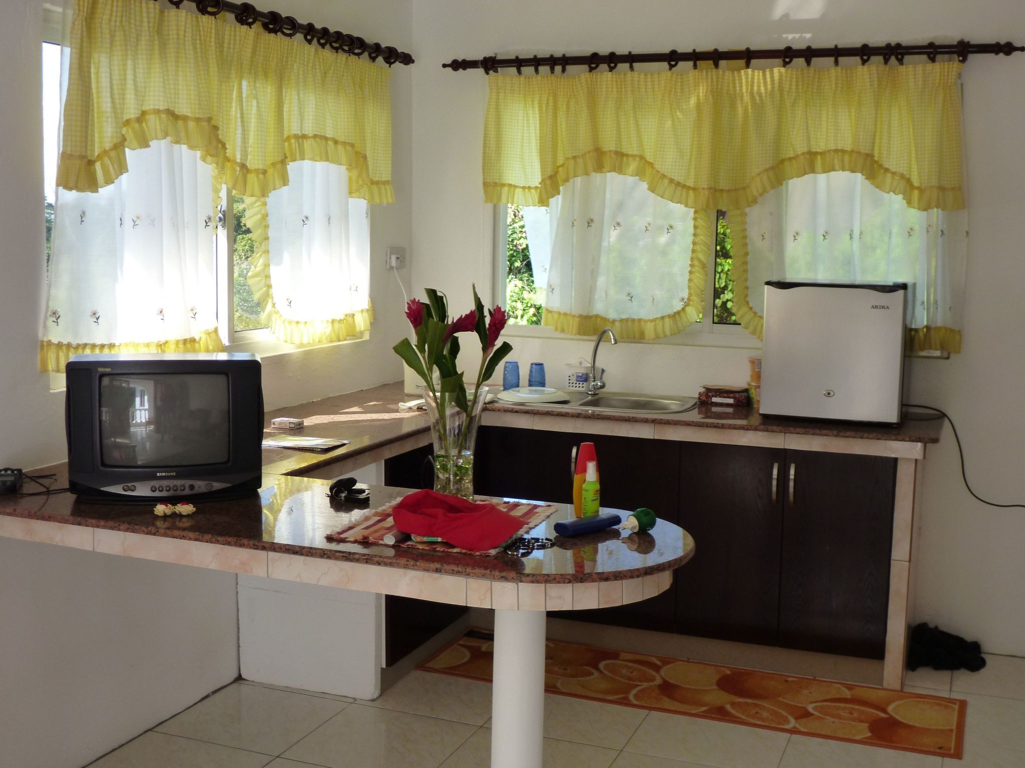 » Grill und Grillplatz sind ebenfalls vorhanden. Parkmöglichkeit ist vor dem Haus. Ein Mietwagen ist, wie überall auf der Insel zu empfehlen Das Haus liegt ca. 8 Gehminuten vom Strand, welcher über ein vorgelagertes Riff verfügt, entfernt. Dieser Strandabschnitt ist ideal zum schnorcheln, fällt bei Flut auf ca. 4 Meter ab und man kann sämtliche Fische, Korallen und sogar Schildkröten beobachten. Zum nächsten kleinem Supermarkt sind es ca. 10 Gehminuten und zu den Restaurants ca. 15 Minuten. Einkäufe, die direkt im Supermarkt neben dem Dive Center „Ocean Dream Divers“ erfolgen Aufgrund der Lage ist ein Mietwagen, wie überall auf der Insel zu empfehlen. ( siehe auch Bild ) . Ein Mietwagen kann auf Anfrage günstig über uns bestellt werden,