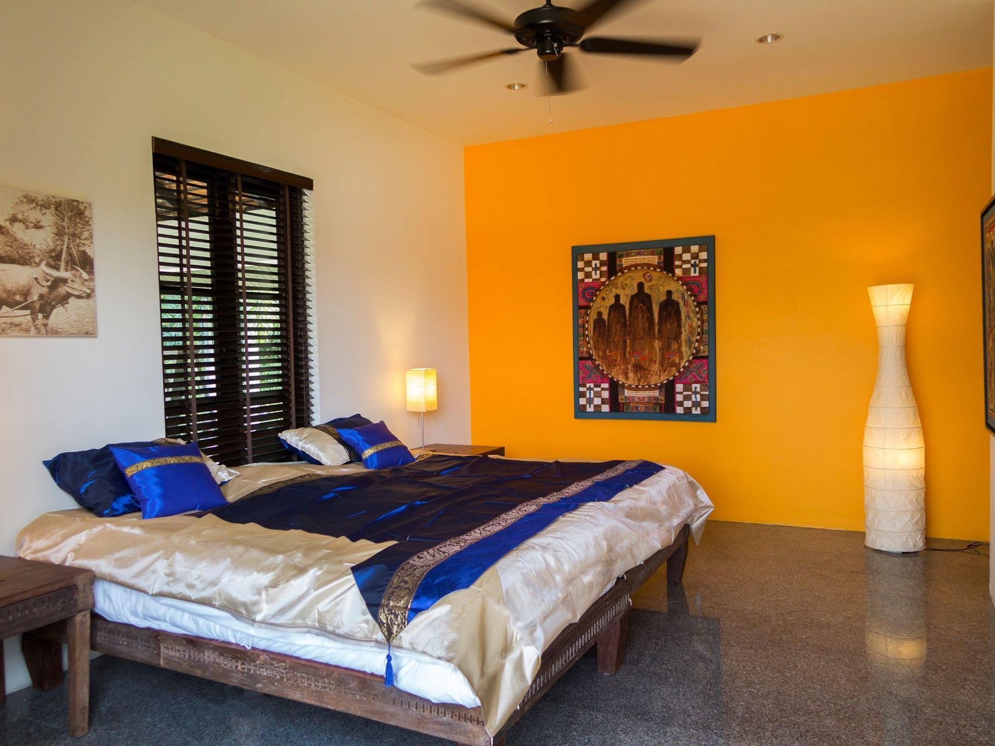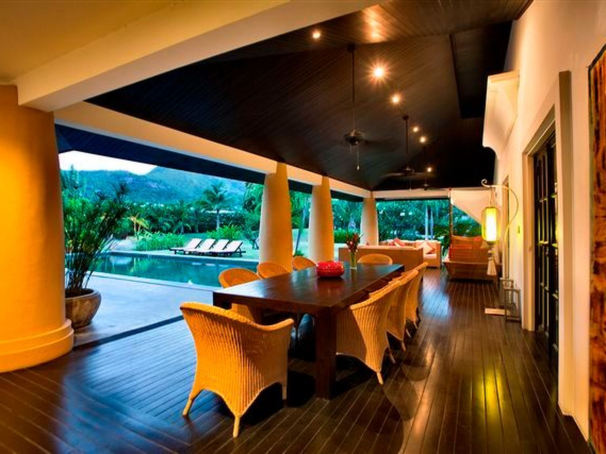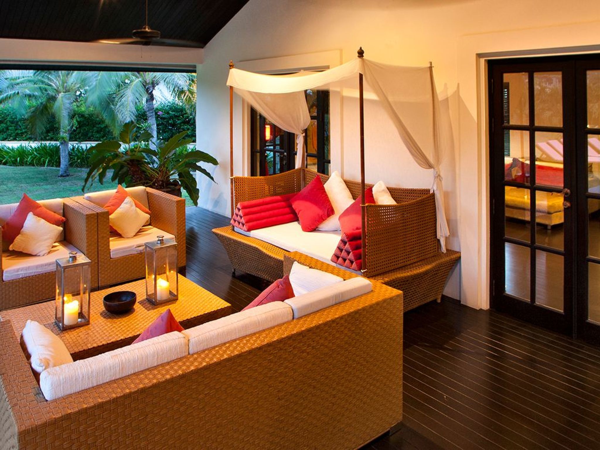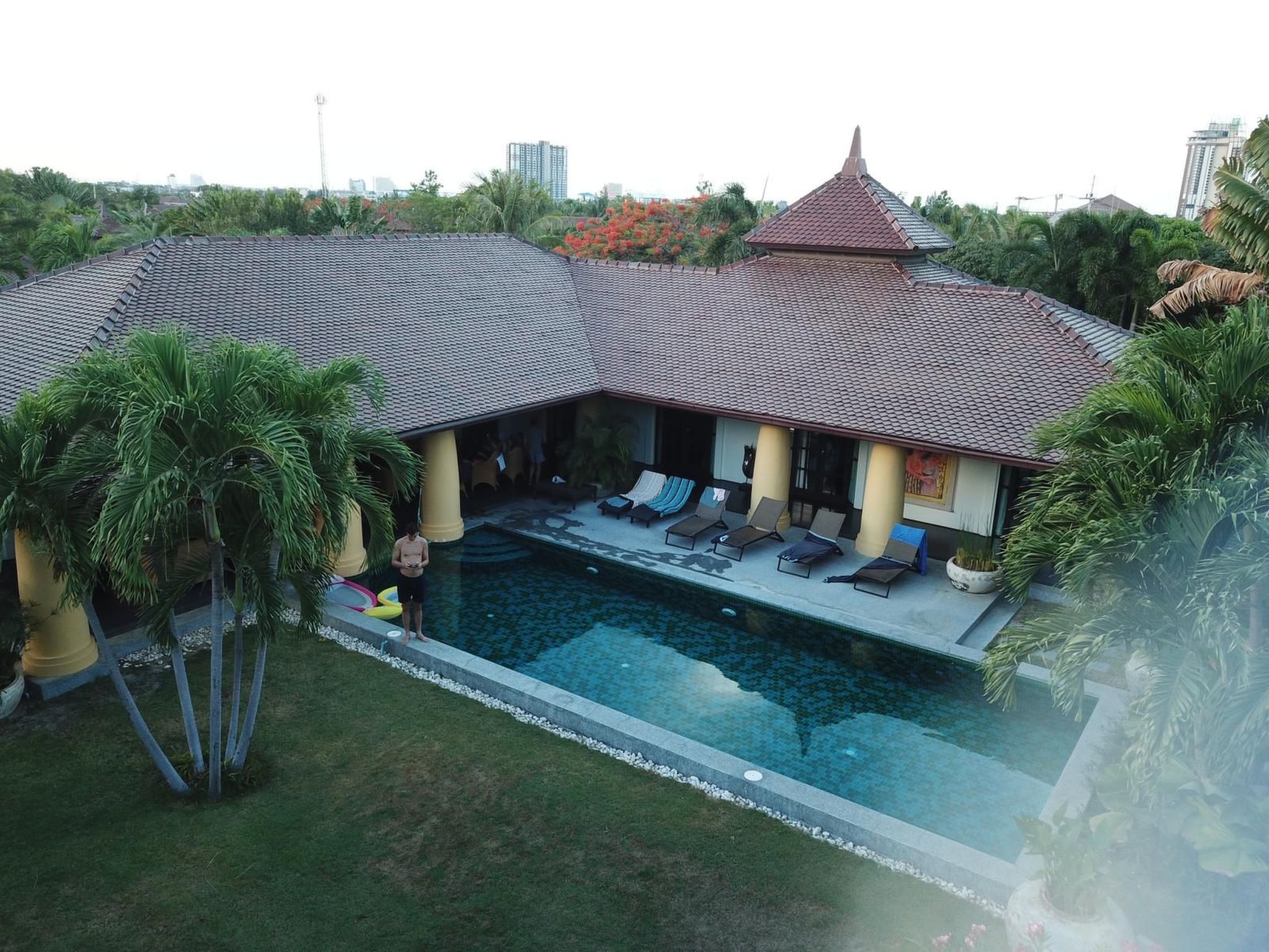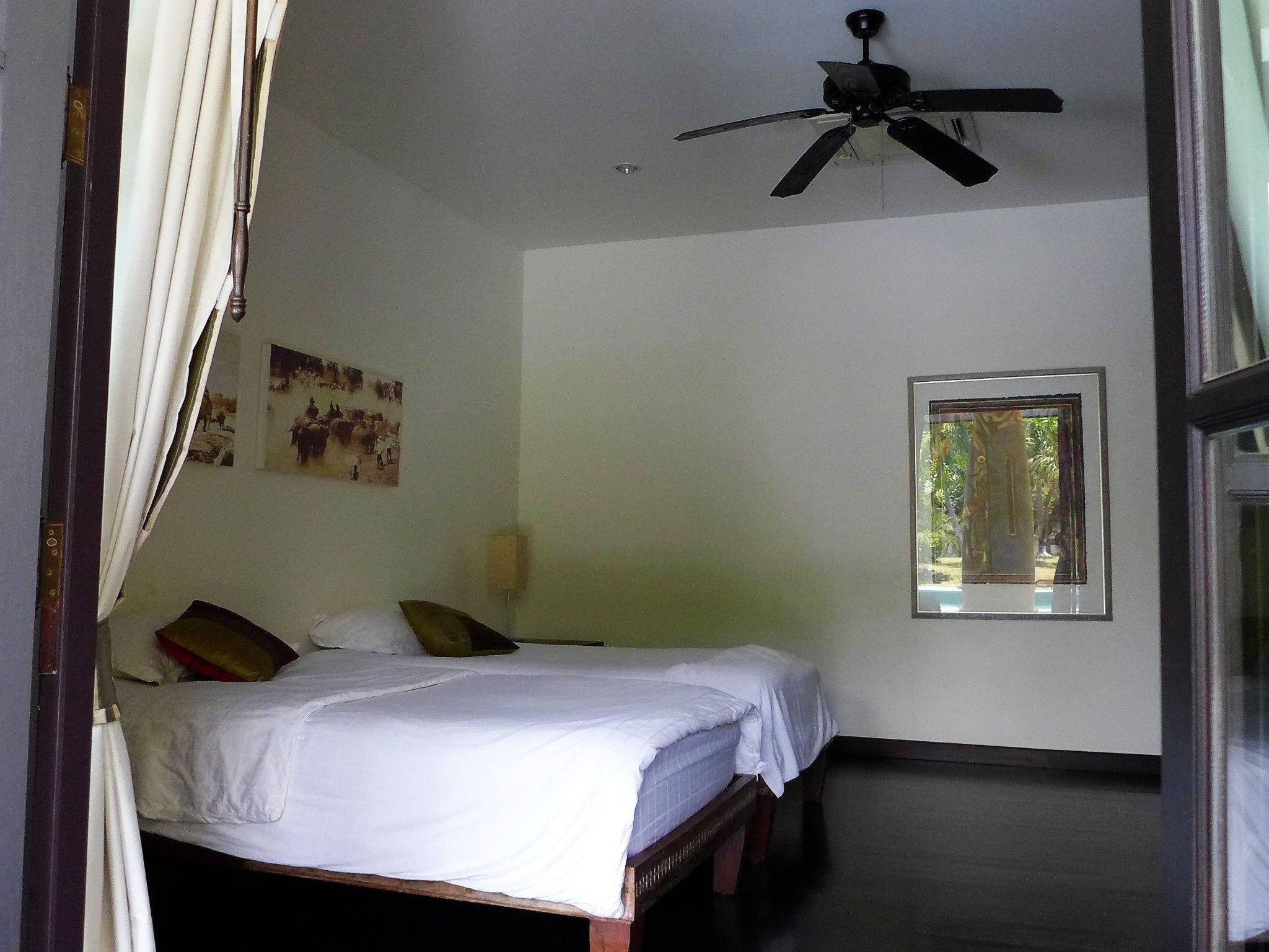 Die Villa, im balinesischen Stil erbaut, ist komplett ebenerdig 456 m² und somit für jedermann befahrbar (Rollstuhl). Ein großes Wohnzimmer mit Sitzecke und Flachbildschirm und DVD-Player ist gut für viele Stunden der Betrachtung Unterhaltung, DVDs zur Verfügung. Neben einer großen Küche mit allen modernen Geräten zum Kochen sind Wohnzimmer und Küche von großen Terrassen mit Sitz- und Essecken umgeben; hier entspannt sich die Familie am meisten. Neben den überdachten Terrassen gibt es auch Sonnenplätze im ganzen Garten, die in der Sonnenterrasse neben dem Pool gipfeln (80 m² im ganzen Haus und Ventilatoren in allen Schlafzimmern sowie auf den überdachten Terrassen. Alle vier Schlafzimmer sind mit Klimaanlagen und Ventilatoren ausgestattet. Alle Schlafbereiche verfügen über große Kingsize-Betten mit modernen Boxspring-Matratzen für maximalen Schlafkomfort. Das Hauptschlafzimmer hat ein Kingsize-Doppelbett, die anderen Schlafzimmer haben separate Einzelbetten, die aber auch gegeneinander gestellt werden können. Die Zimmer sind alle sehr geräumig (7,50 x 5 m und 5 x 5 m). Jedes Schlafzimmer hat ein eigenes Bad mit Toilette und Dusche. Wenn Sie draußen duschen möchten, können Sie das auch tun, zwischen den Pflanzen in der Außendusche. (Siehe Fotos Website). Die Küche ist mit Mikrowellenherd, Gasherd und separatem WOK, Geschirrspüler, Kühlschrank mit Gefrierfach, Eismaschine, Toaster, Espressomaschine, etc. ausgestattet.