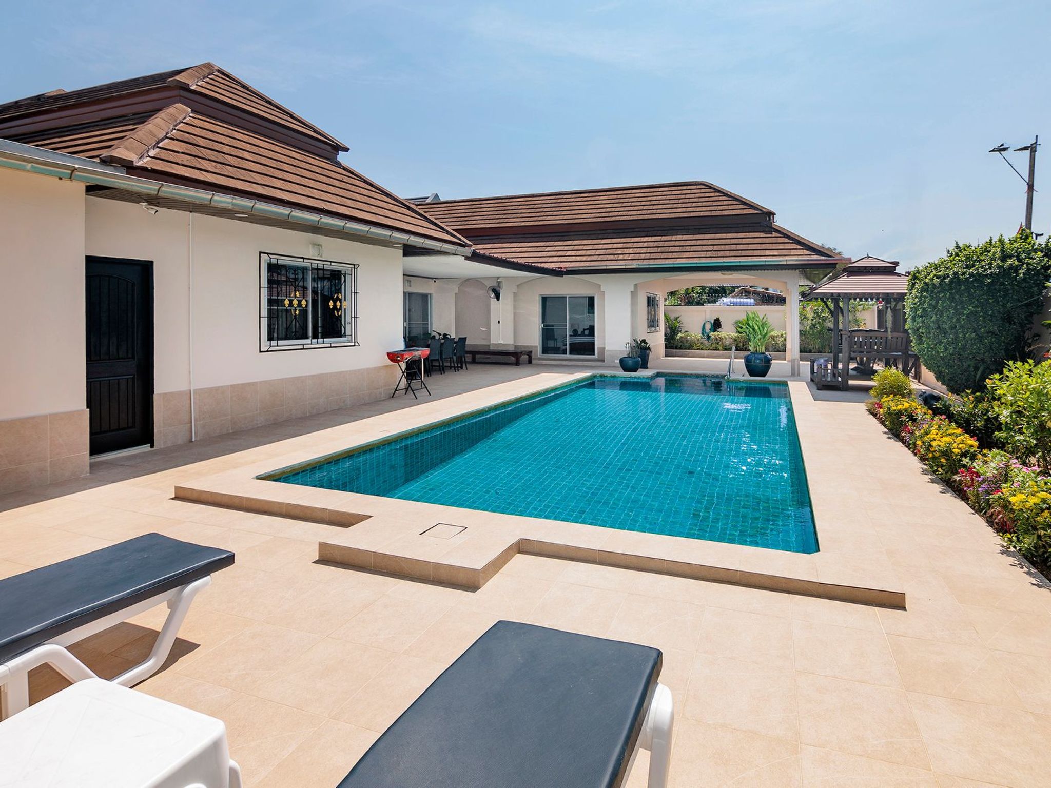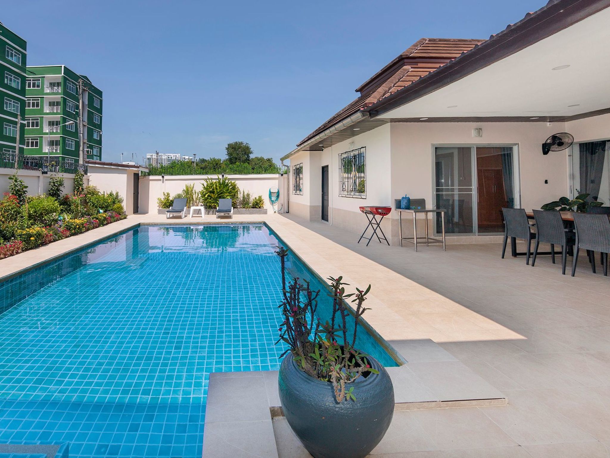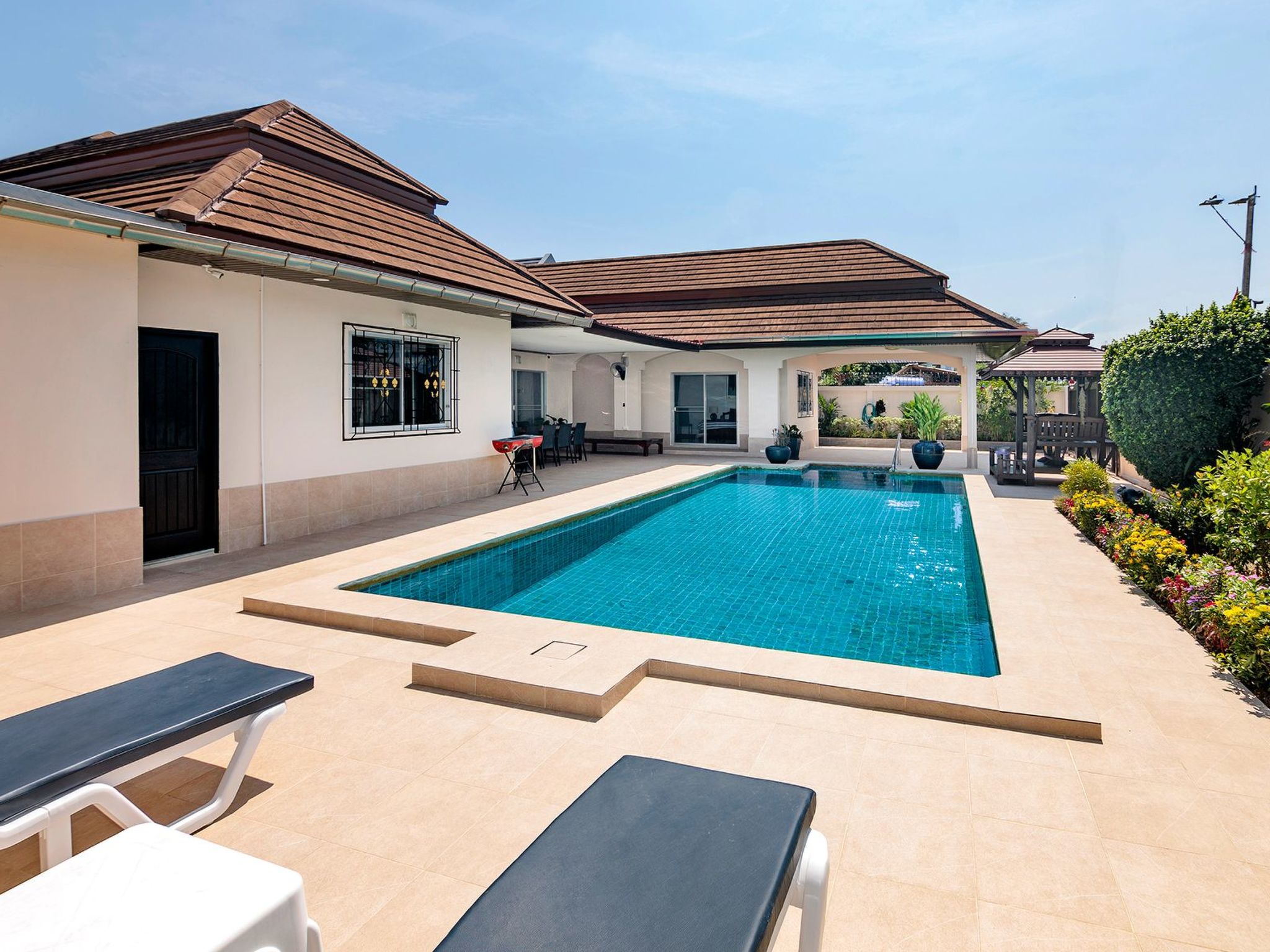 Entdecken Sie den unvergleichlichen Charme der Villa Bos, Ihrem exklusiven Rückzugsort in der Nähe des ruhigen Jomtien Beach. Nur fünf Autominuten vom Strand entfernt, bietet diese freistehende Villa die perfekte Kombination aus Privatsphäre ohne unmittelbare Nachbarn und einer direkten Verbindung zum pulsierenden Pattaya und seinen verführerischen Stränden. Die Villa Bos ist der ideale Ausgangspunkt sowohl für Ruhesuchende als auch für Abenteurer.