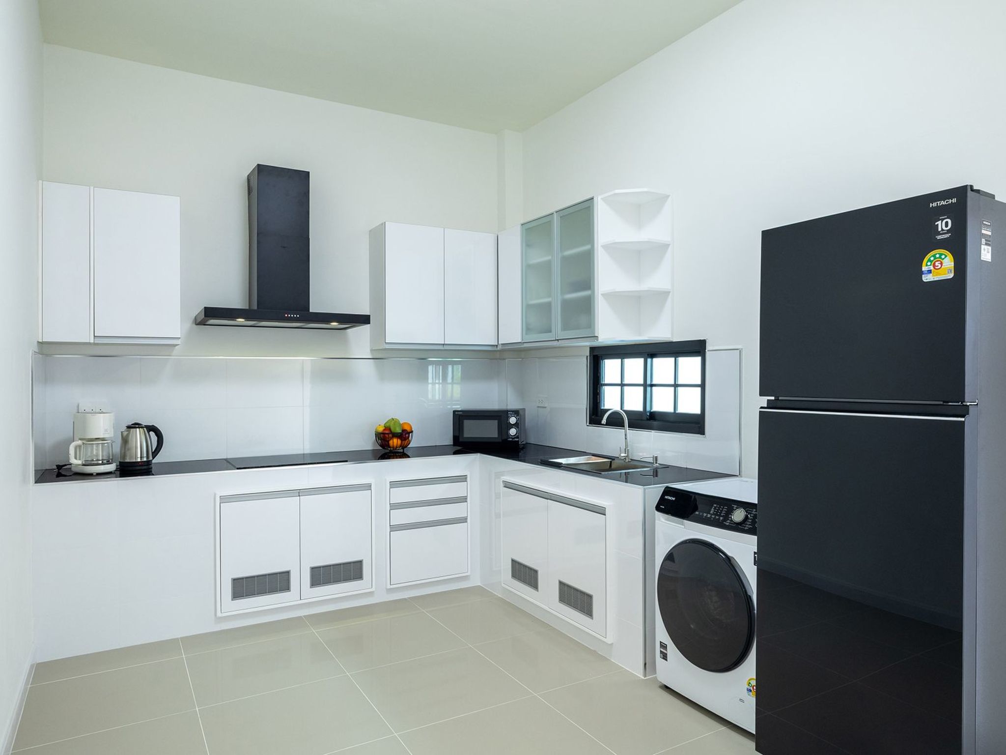 Die Küche ist komplett ausgestattet: Kühlschrank mit Gefrierfach, Herd, Backofen, Reiskocher, Toaster, Kaffeemaschine, Mikrowelle und Waschmaschine.