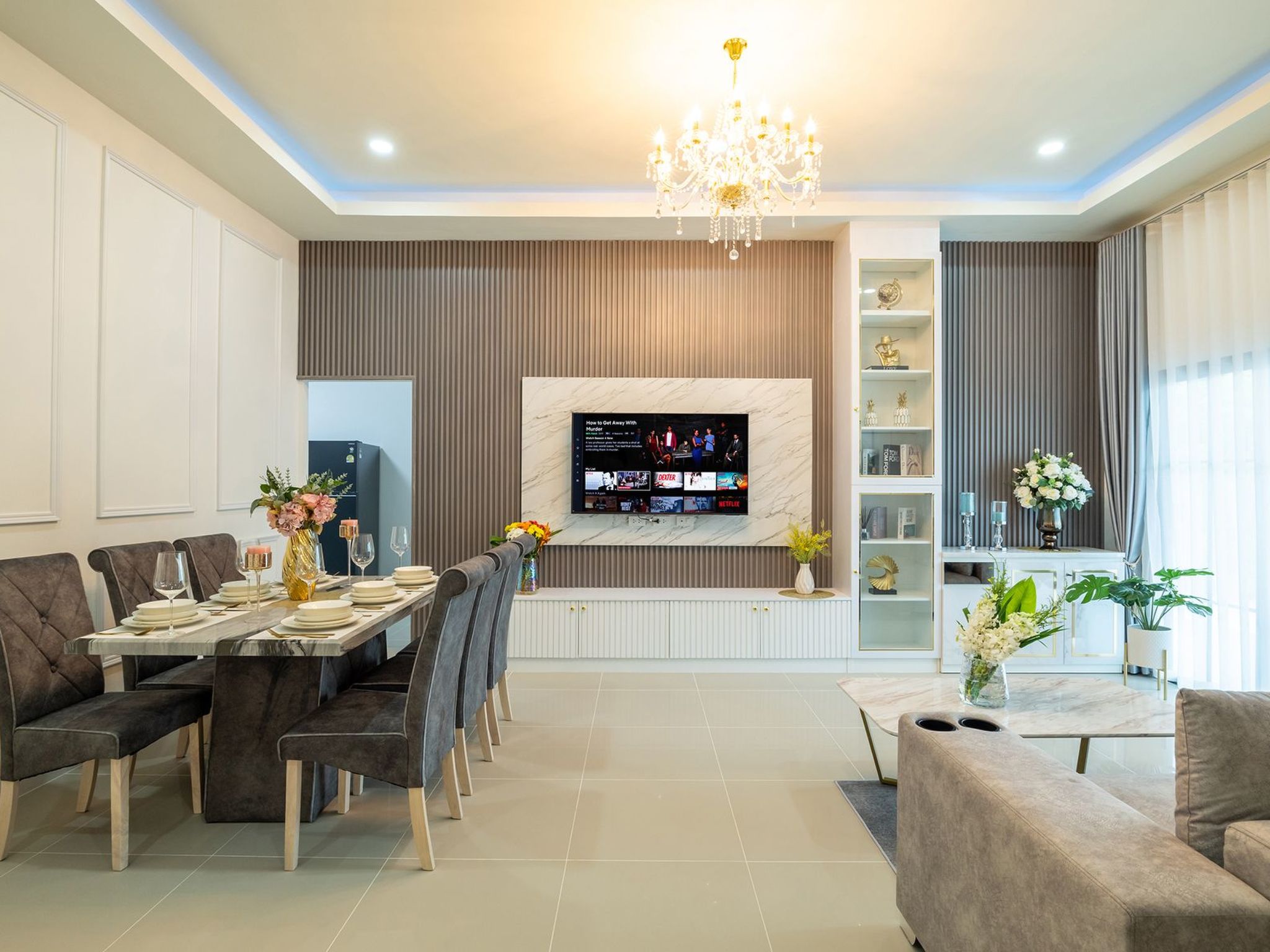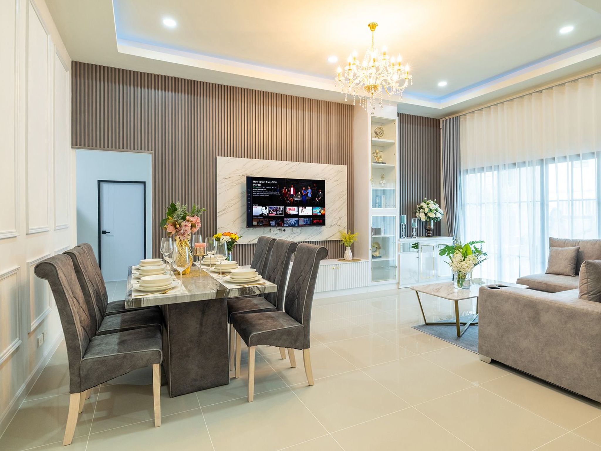 Es gibt eine schöne Sitzecke mit einem bequemen Sofa und einen Essbereich mit 6 Stühlen und einem Tisch.