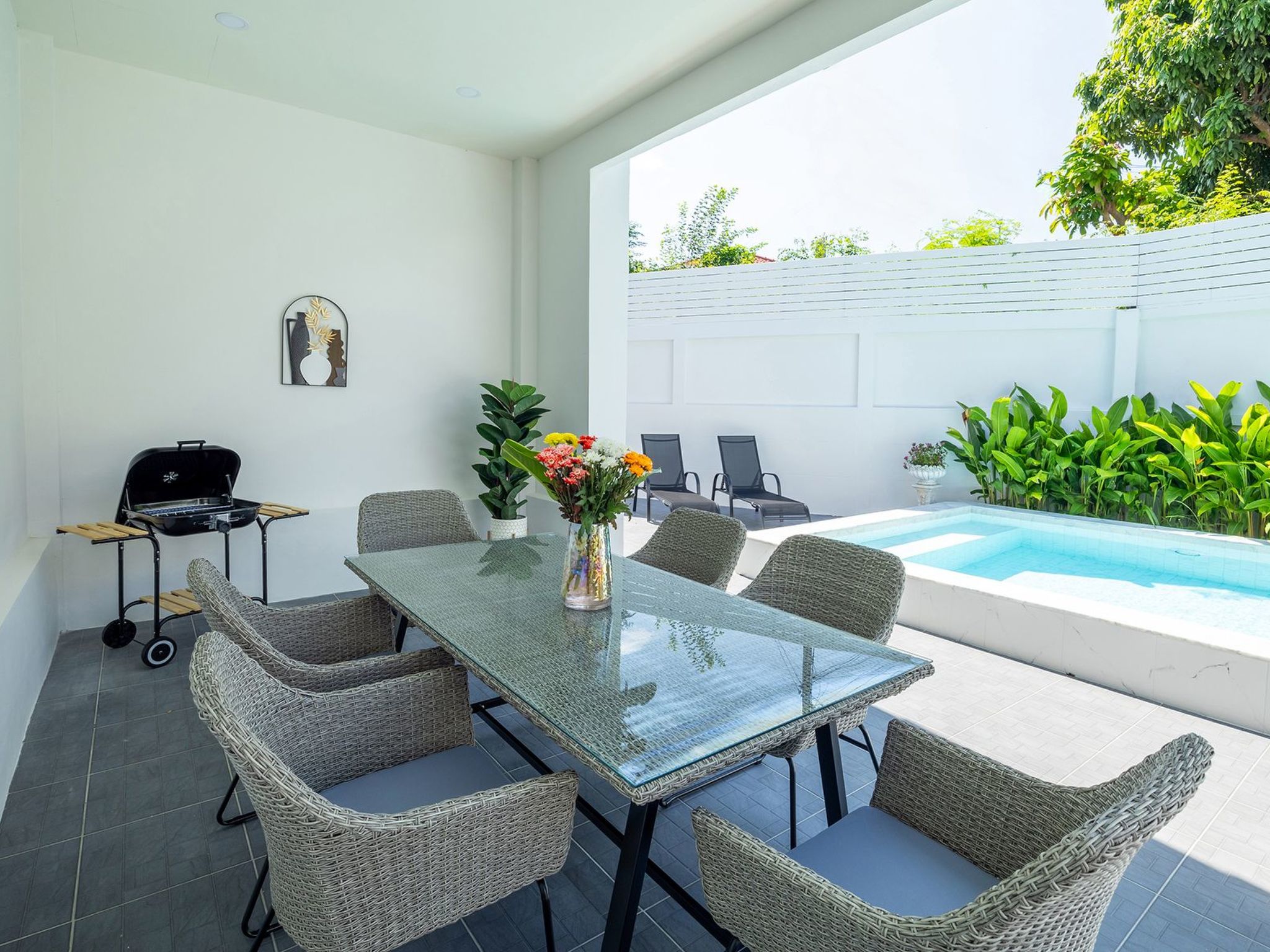 Die Terrasse hat einen Esstisch mit 6 Stühlen und einen Grill. Am Pool stehen 2 Liegestühle bereit, um in der Sonne zu entspannen.