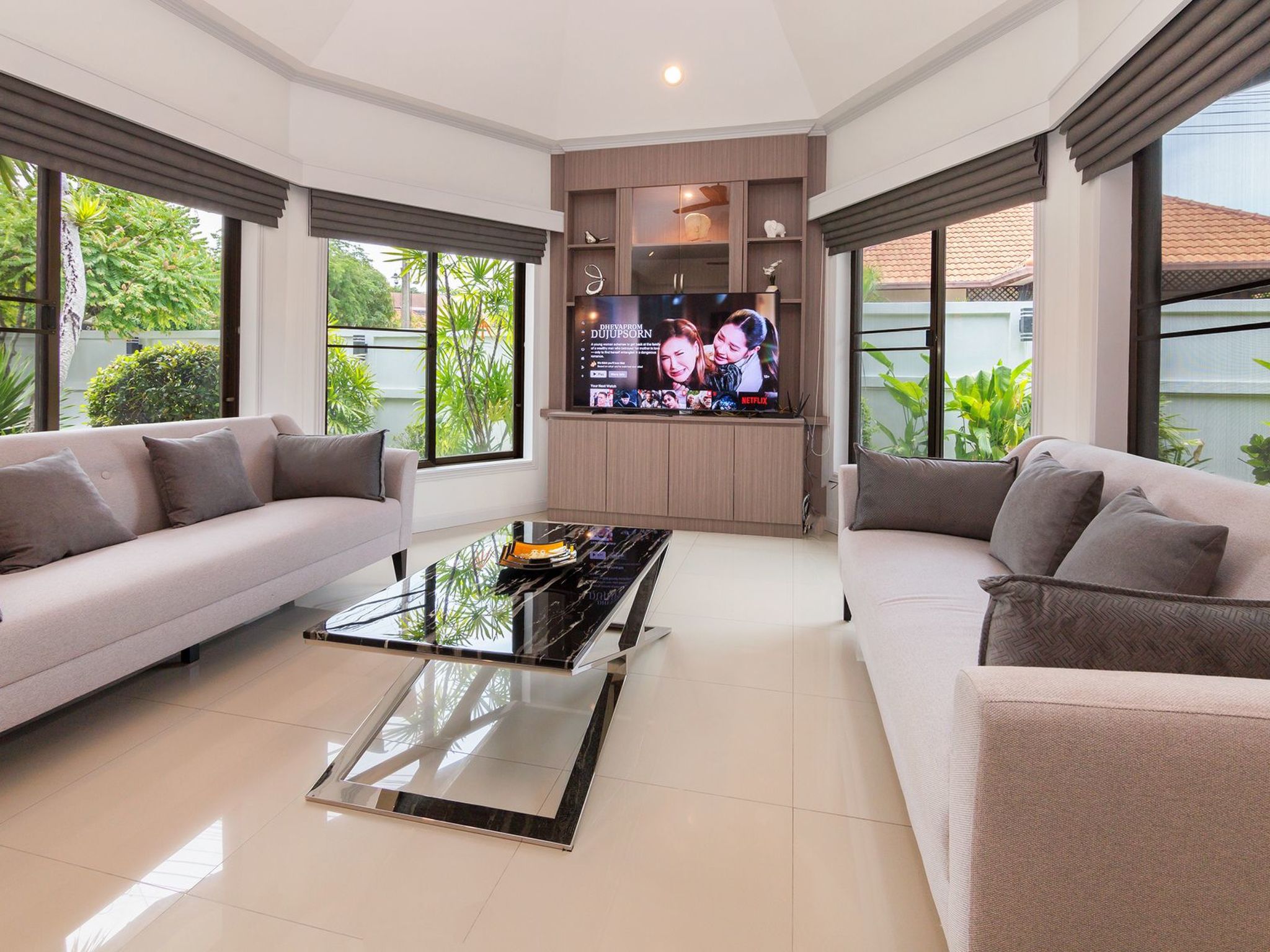 Die Villa ist geschmackvoll eingerichtet und komplett ausgestattet: ein großes L-förmiges Wohnzimmer (80 m²), eine geräumige Küche (20 m²), 4 Schlafzimmer und 3 Bäder. Das Wohnzimmer hat einen großen Fernseher mit Internetzugang und Apps, wie z.B. kostenloses Netflix.