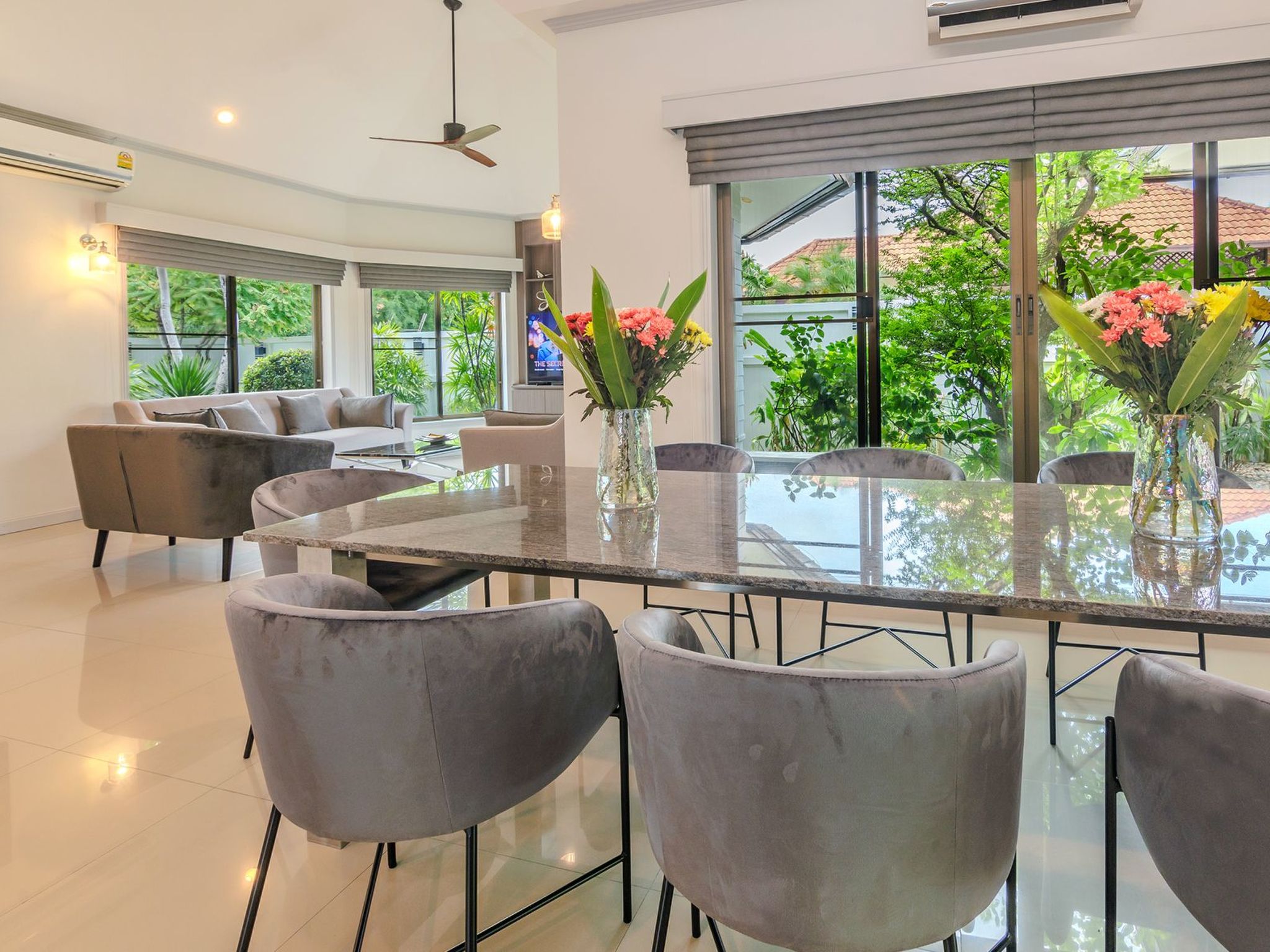 Es gibt eine geräumige Sitzecke mit einem bequemen Sofa und Stühlen und einen schönen Essbereich mit 8 Stühlen und einem großen Tisch.