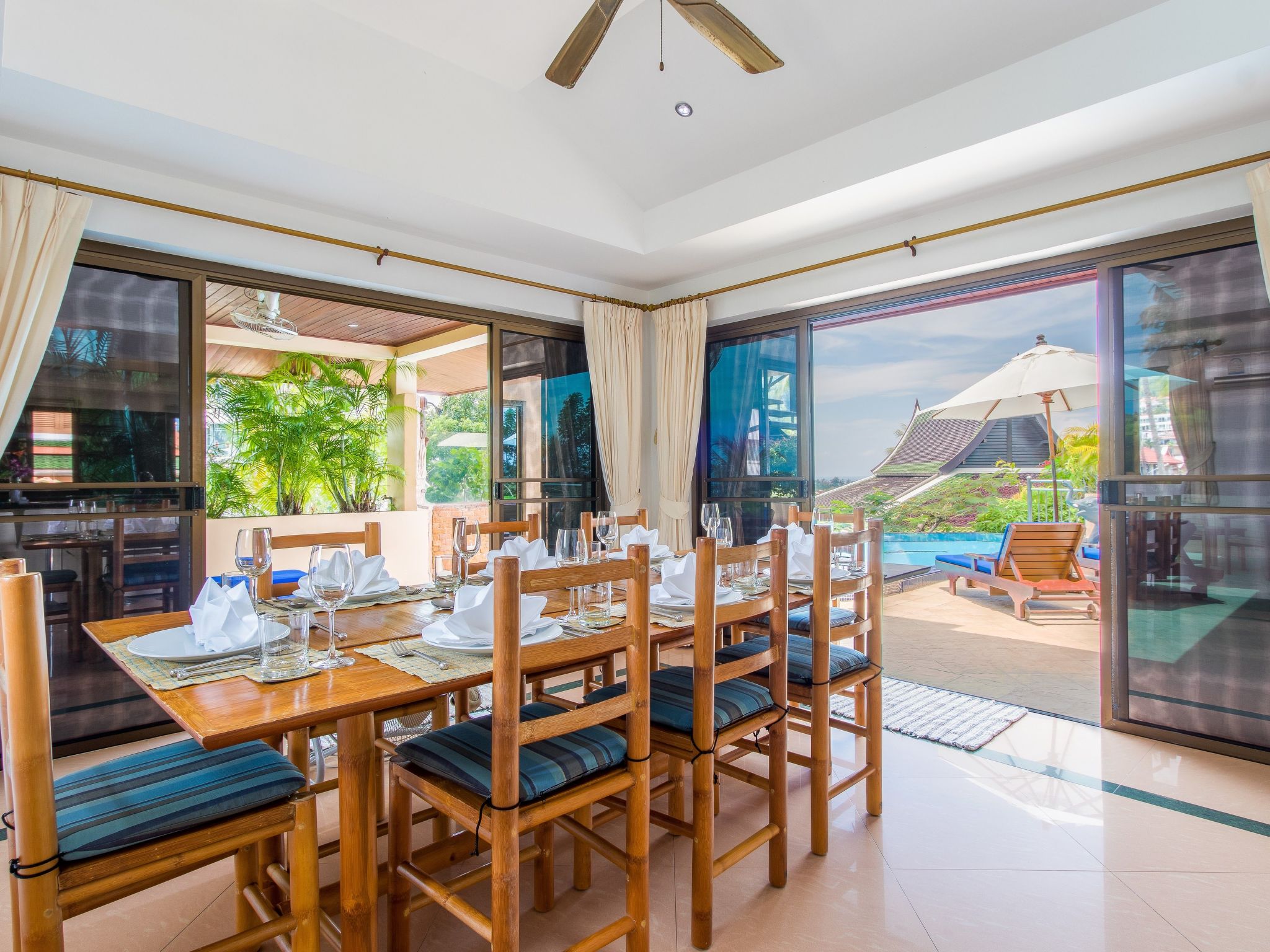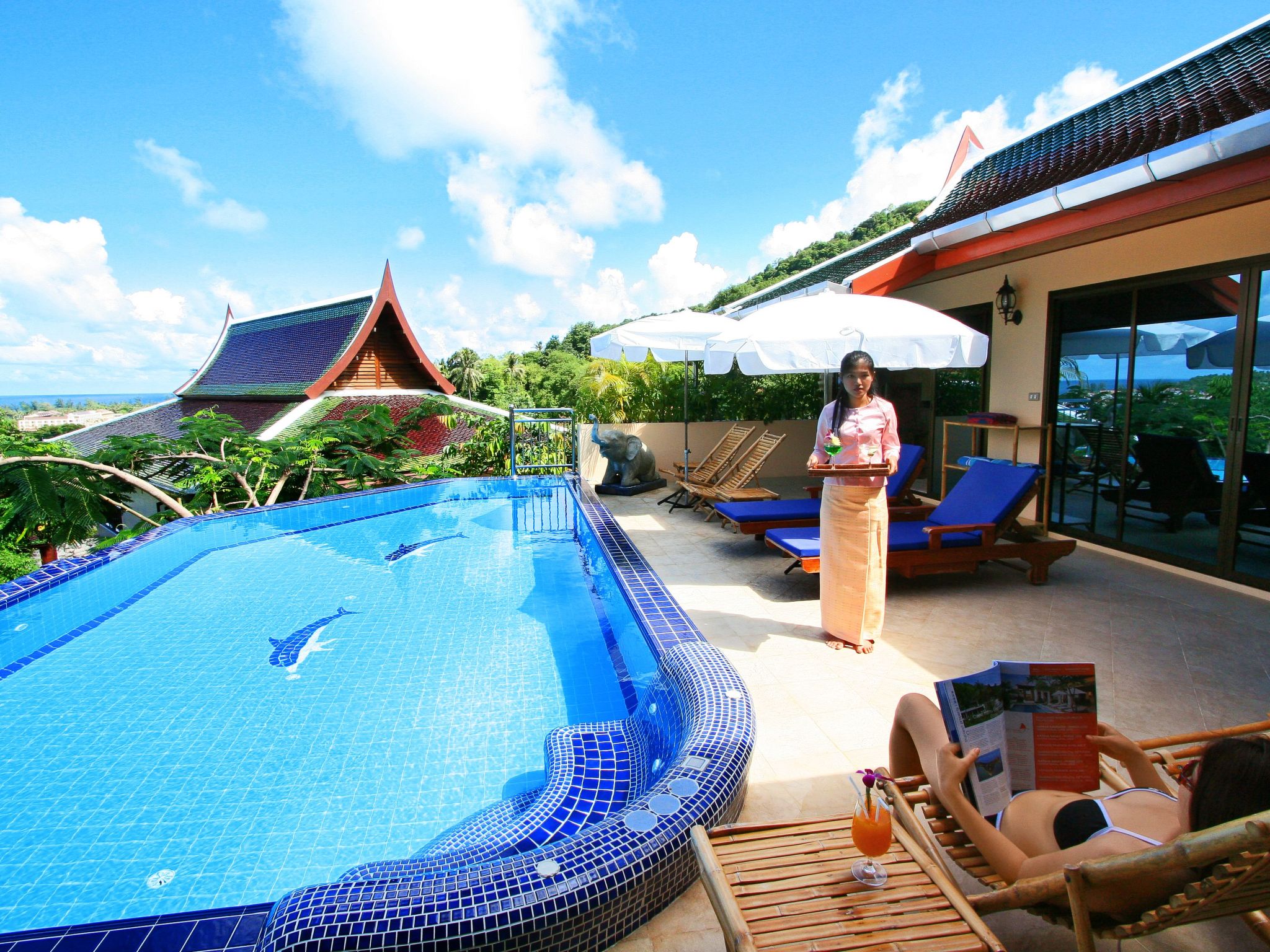 Diese luxuriöse Ferienvilla ist an einem bewaldeten Hang unterhalb des BIG BUDDHA auf der Insel Phuket, im Dorf Kata, gebaut. Sie ist durch hohe Kalksteinmauern und ferngesteuerte schmiedeeiserne Tore in Schwarz und Gold geschützt. Mit fabelhaftem Blick auf das Meer und den Sonnenuntergang, bietet diese Villa einen wunderbaren Ort für einen erholsamen Urlaub.